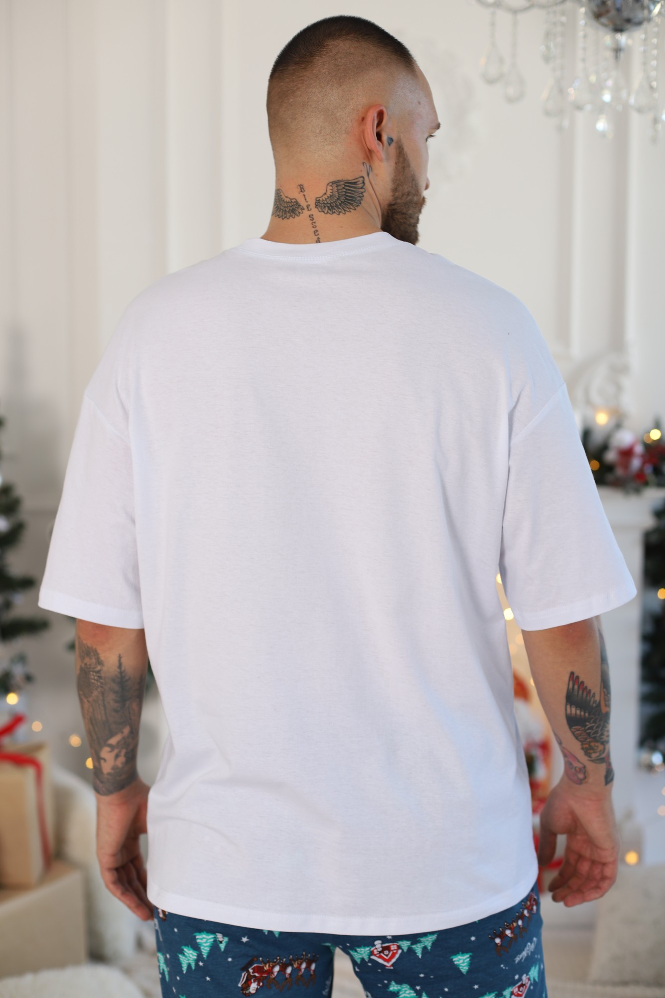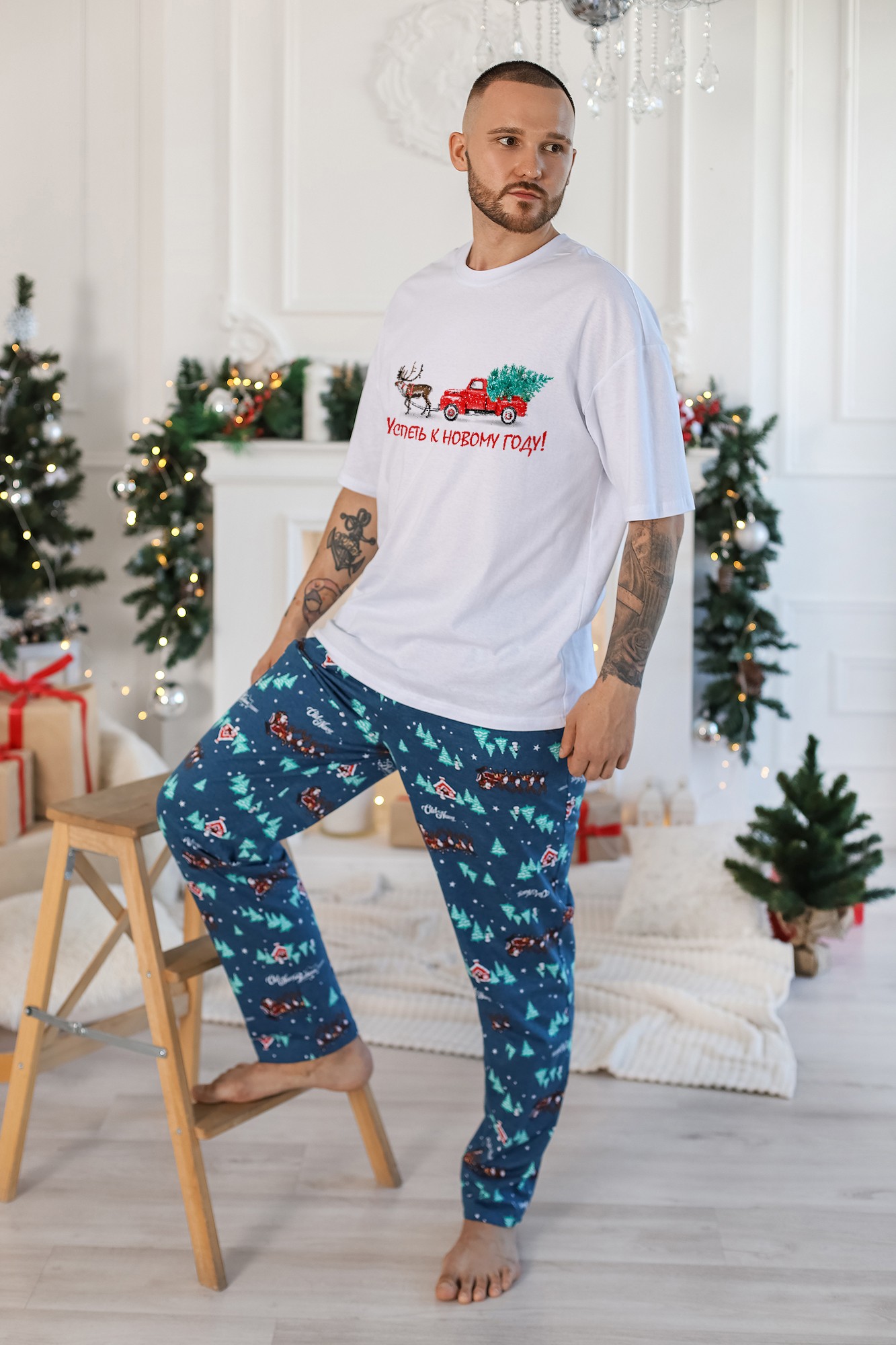 Костюм мужской. Футболка с принтом; модель свободная, со спущенной линией плеч. Брюки из полотна эксклюзивного дизайна, прямые, с боковыми карманами, на притачном поясе с отстроченной эластичной тесьмой.