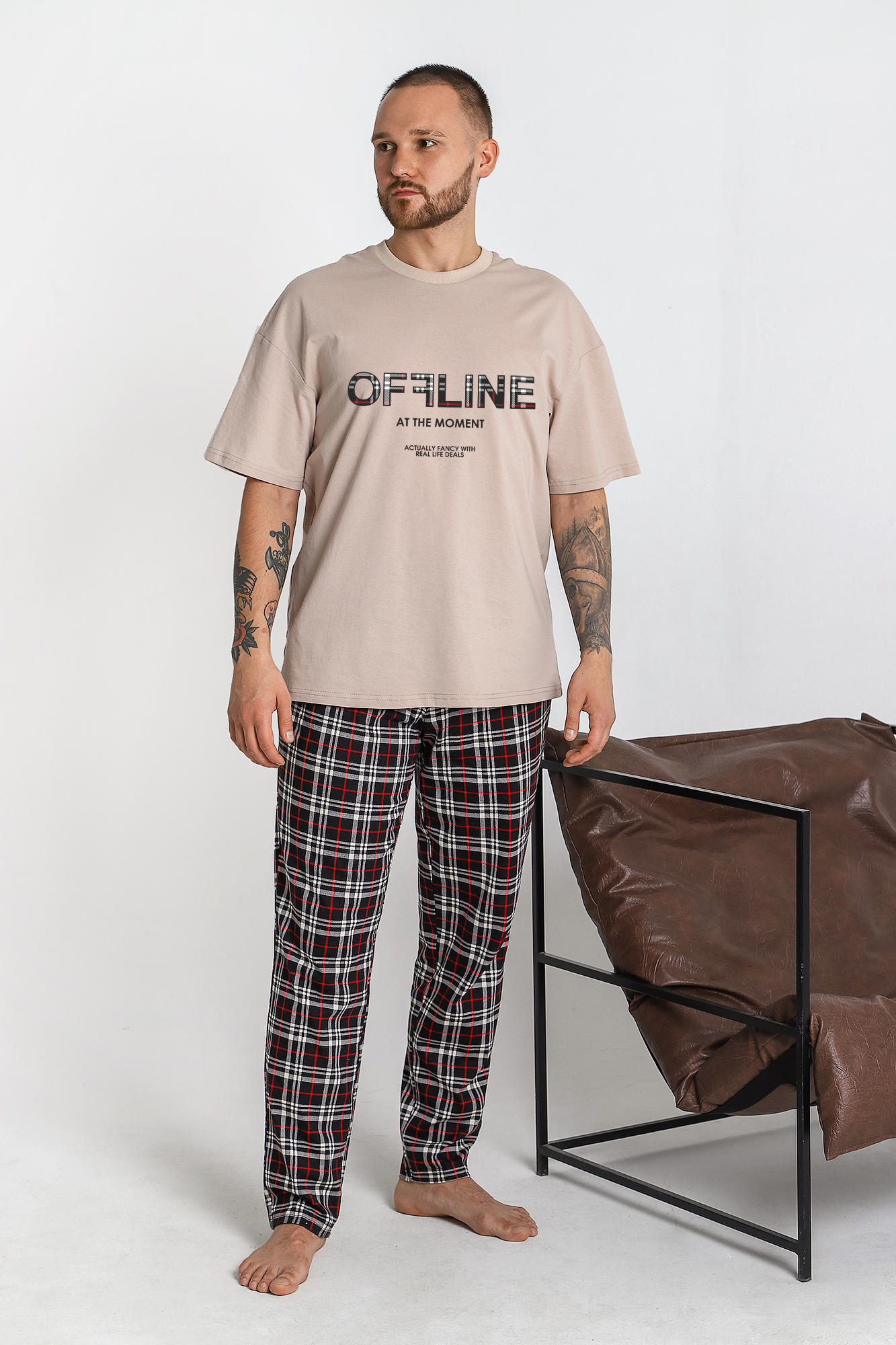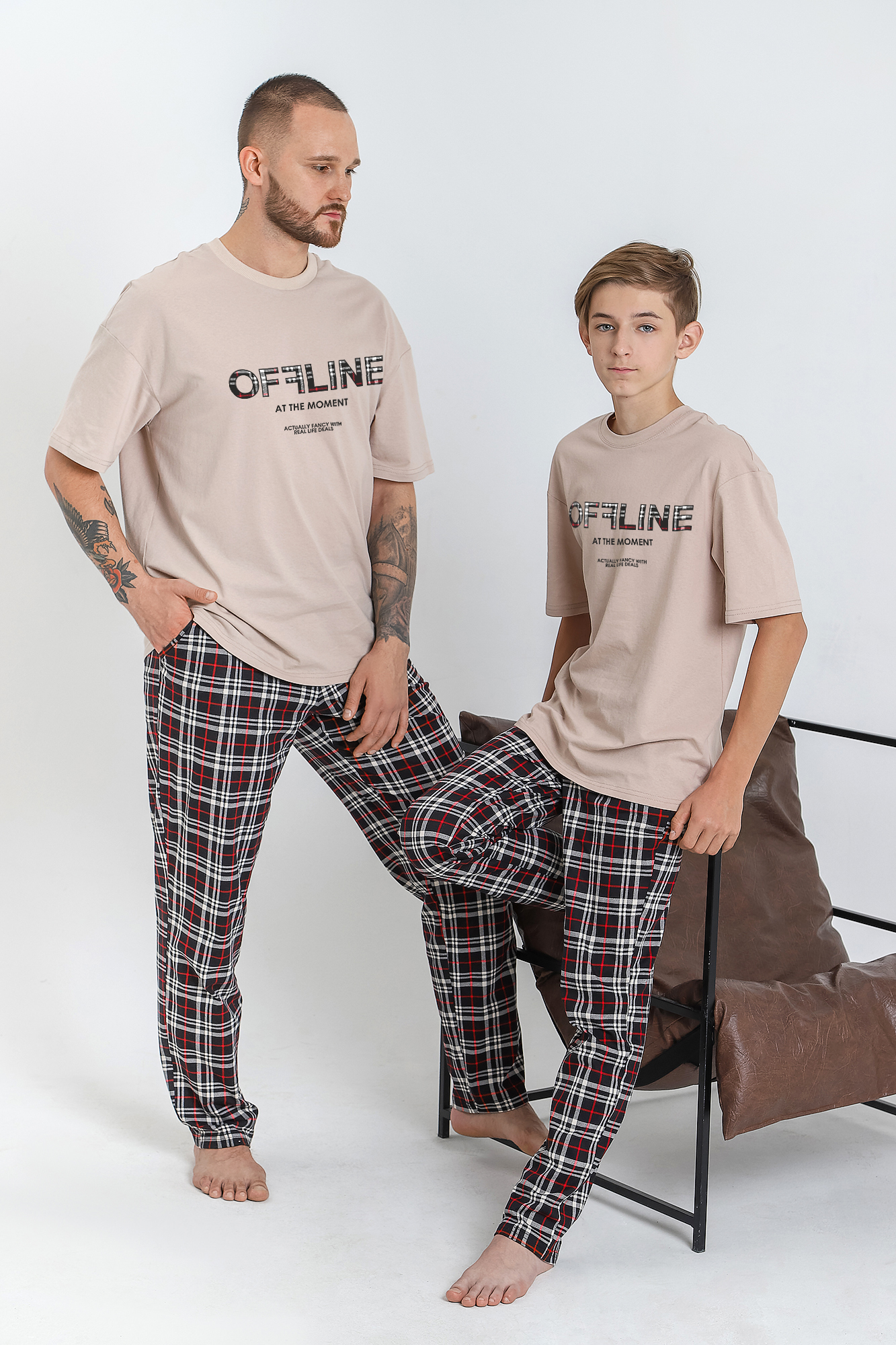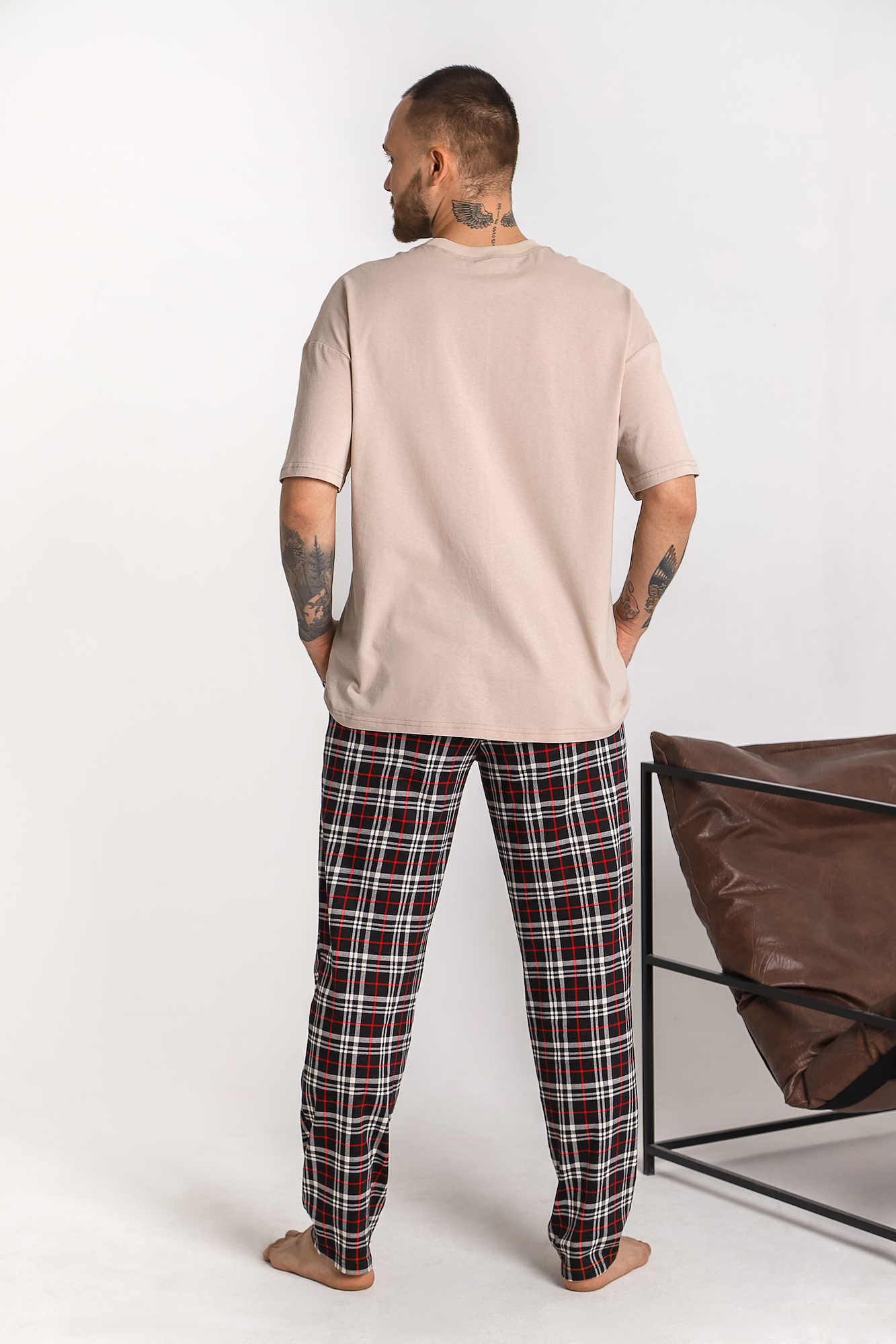 Костюм мужской. Футболка с принтом; модель свободная, со спущенной линией плеч, короткими рукавами. Брюки из полотна в клетку, прямые, с боковыми карманами, на притачном поясе с отстроченной эластичной тесьмой.