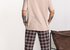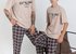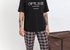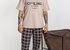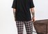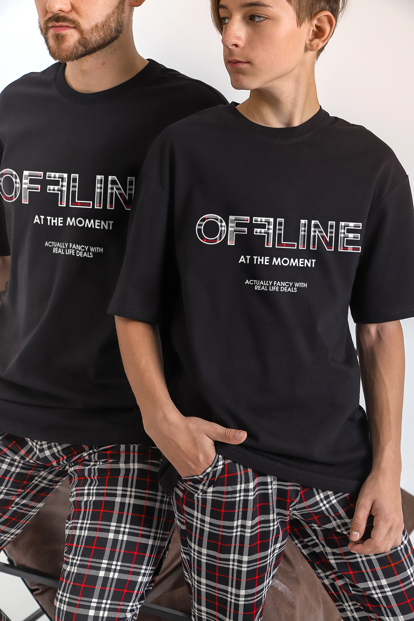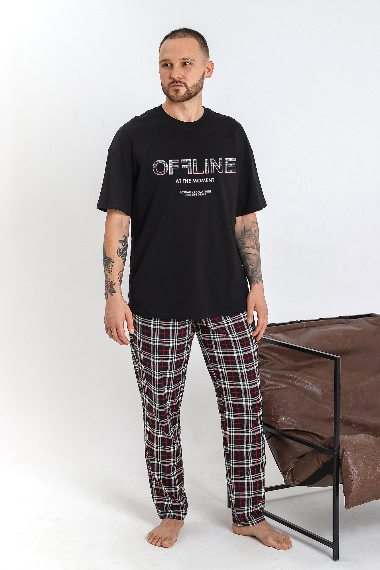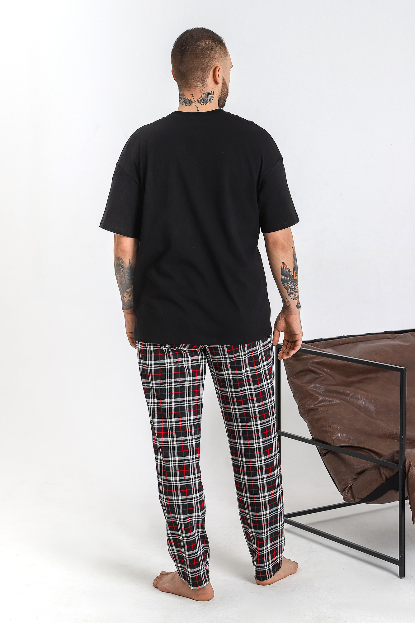 Костюм мужской. Футболка с принтом; модель свободная, со спущенной линией плеч, короткими рукавами. Брюки из полотна в клетку, прямые, с боковыми карманами, на притачном поясе с отстроченной эластичной тесьмой.