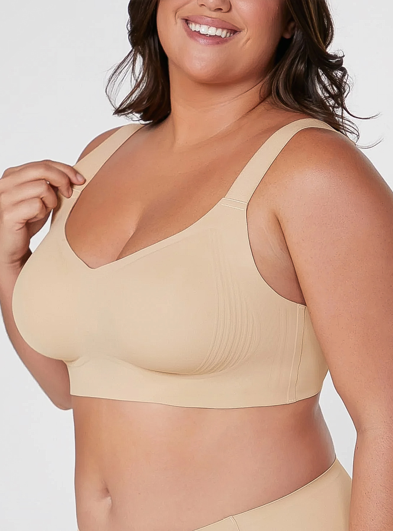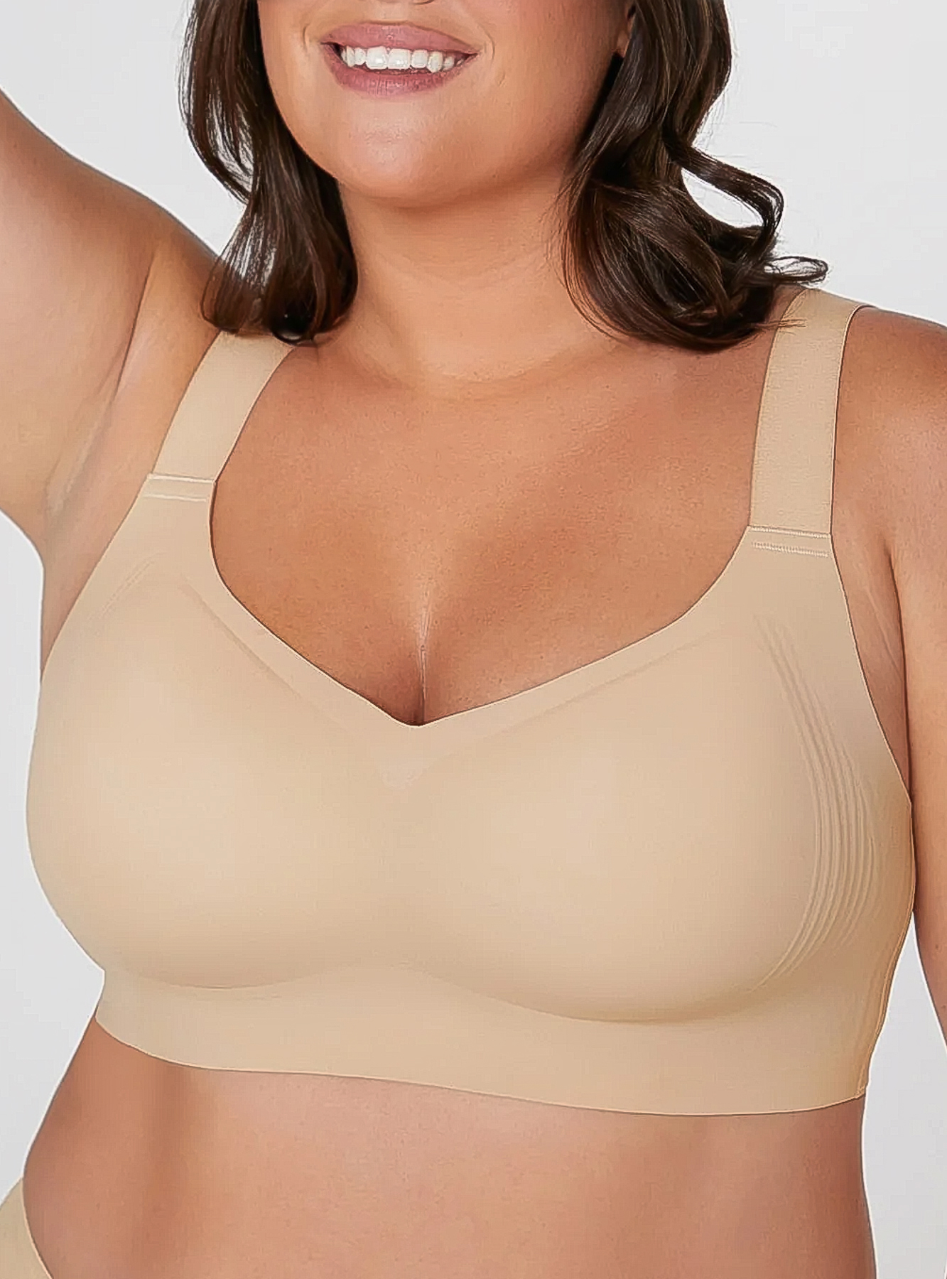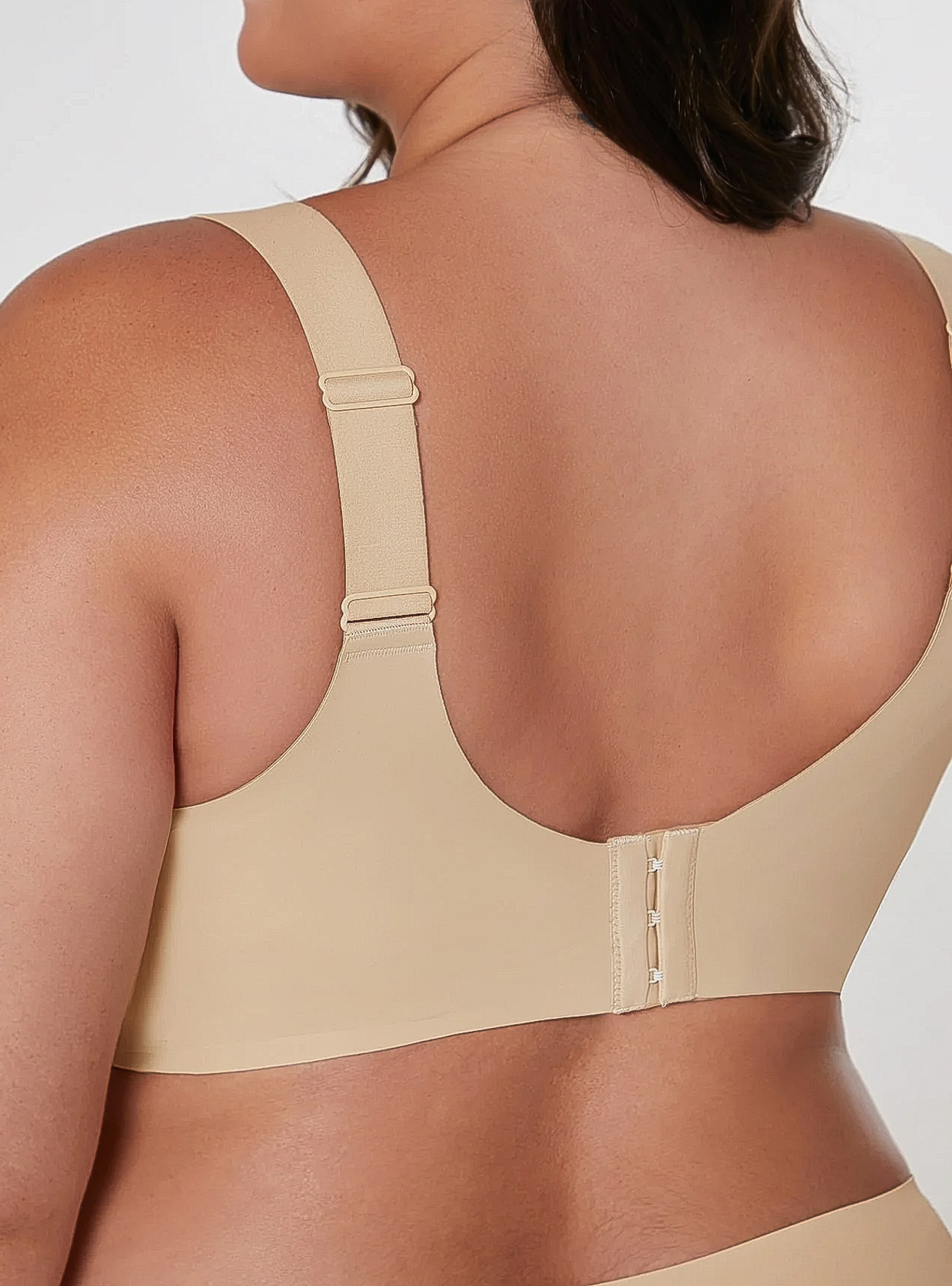 Бесшовный бюстгальтер-топ от торговой марки Индефини. Бюстгальтер-топ из полиамида, бежевого цвета, без косточек, без Push-up, с несъемным вкладышем, на широких бретелях, бесшовный, на застежках-крючках, бретели регулируются.