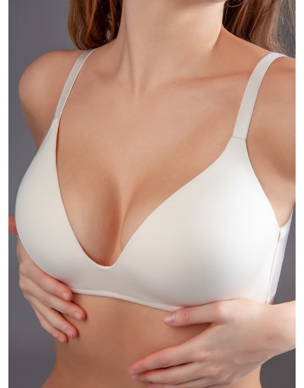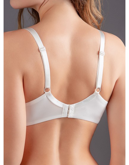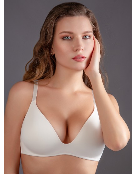 Бюстгальтер от торговой марки Индефини. Бюстгальтер белого цвета изготовлен из эластичной ткани, не имеет косточек и Push-up, дополнен тонкими чашками треугольной формы и боковыми косточками для лучшей поддержки груди, удобную посадку обеспечивают крепкие бретели и застежки-крючки за счет регулировки.