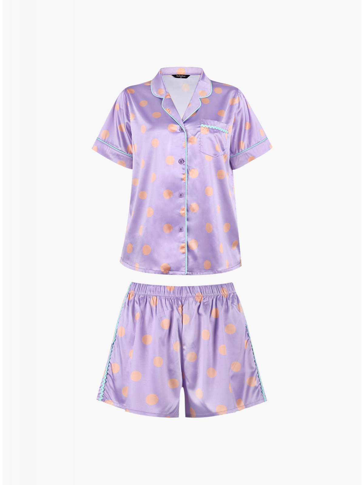 Женская пижама из полиэстера хорошо пропускает воздух и впитывает влагу, что помогает изделию оставаться комфортным и свежим во время сна. Футболка имеет отложной воротник, пуговицы в цвет ткани и нагрудный кармашек, украшенный бирюзовой каймой. В комплекте также идут шорты на мягкой резинке, с бирюзовой каймой по бокам.