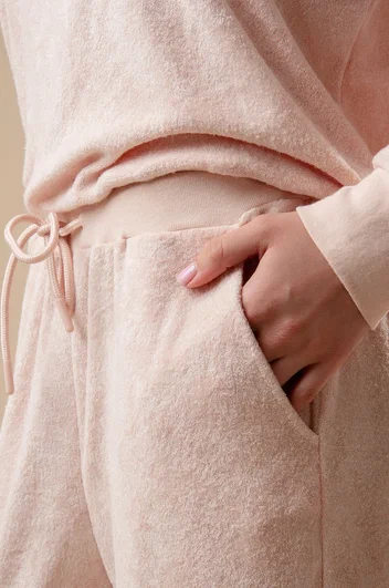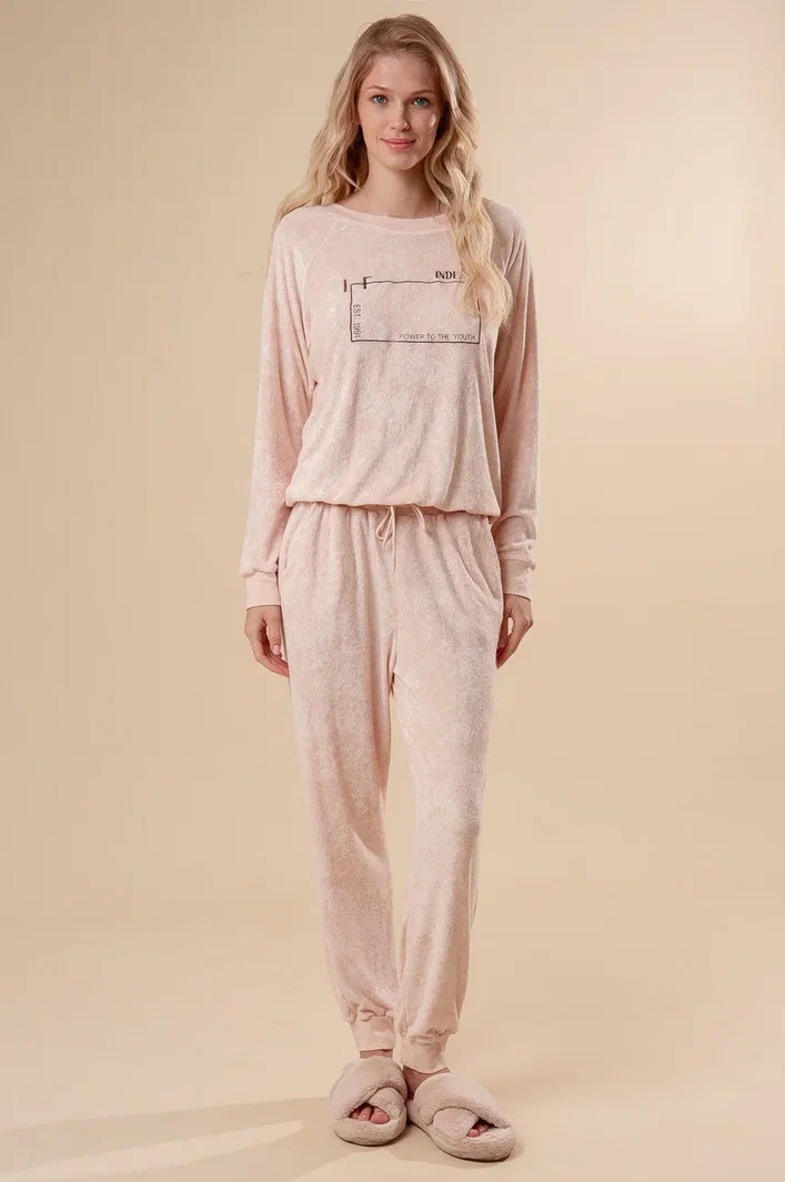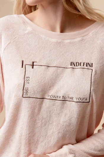 В комплекте – мягкие на ощупь кофта и брюки с манжетами-резинками в пудровом оттенке. На кофте с круглым вырезом и рукавом-реглан выполнена вышивка с указанием бренда Indefini. Брюки свободного кроя с мягкой резинкой и шнурком в тон.