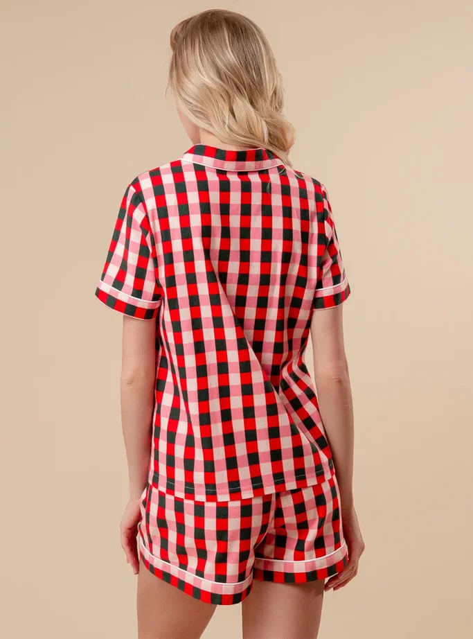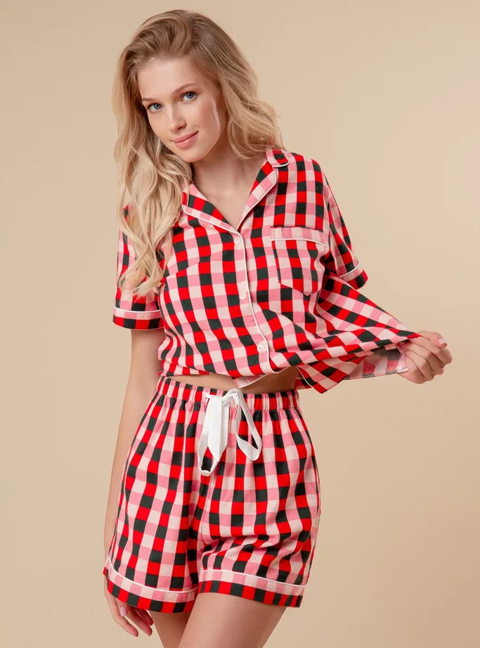 Комплект – рубашка и шорты в клетку. Верх рубашечного кроя с кармашком на груди и короткими рукавами. Шорты с мягкой резинкой и контрастным шнурком-регулятором. Приятный по тактильным ощущениям комплект подойдет для сна и домашнего отдыха.