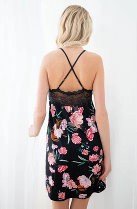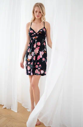 Сорочка выполнена из бамбука и хлопка, черного цвета с цветочным принтом, с треугольными чашками без косточек и без Push-up, с кружевным обрамлением по верху, на тонких регулируемых бретелях, облегающая по фигуре.Состав: 66,5% Бамбук 28,5% Хлопок 5% Эластан