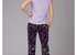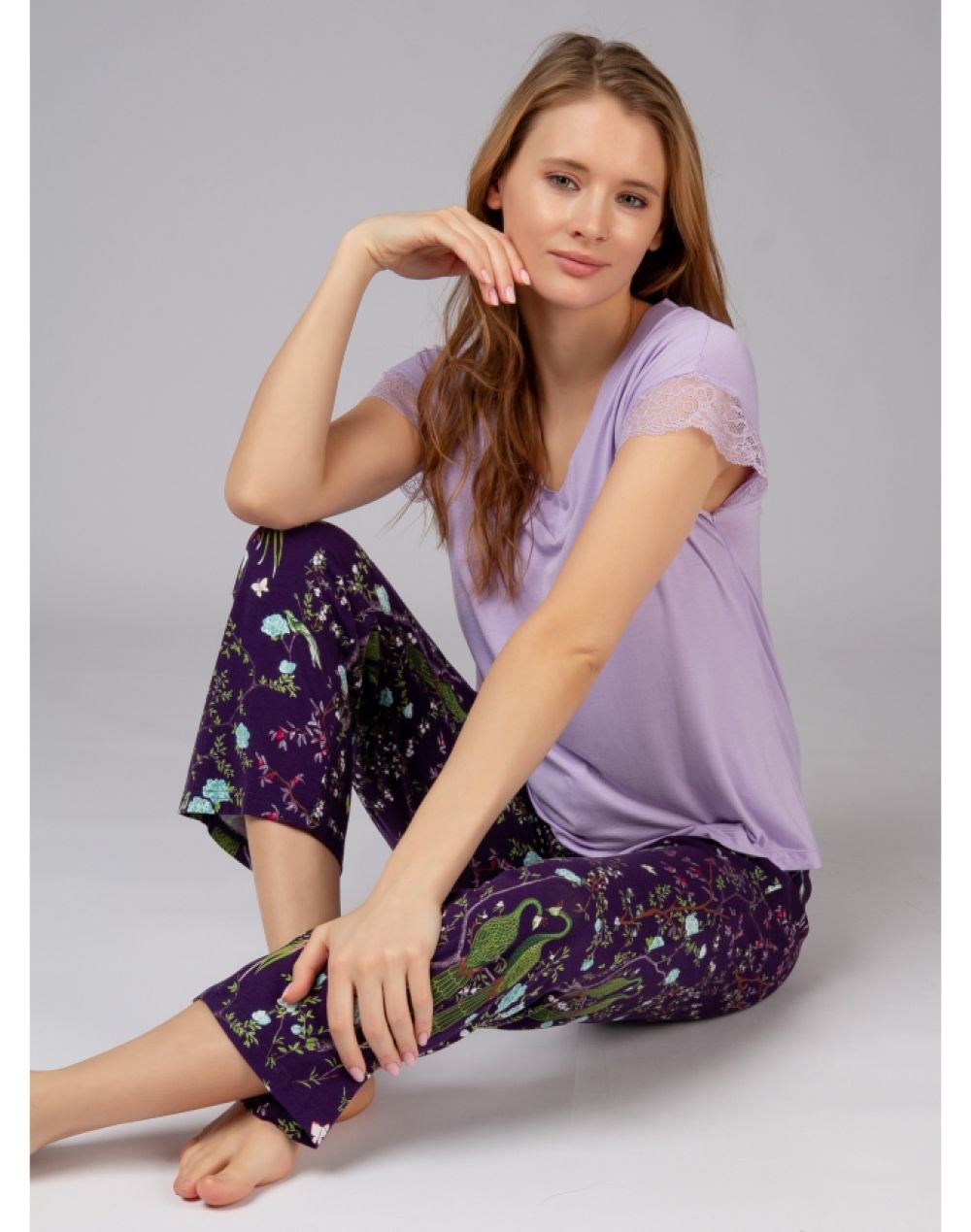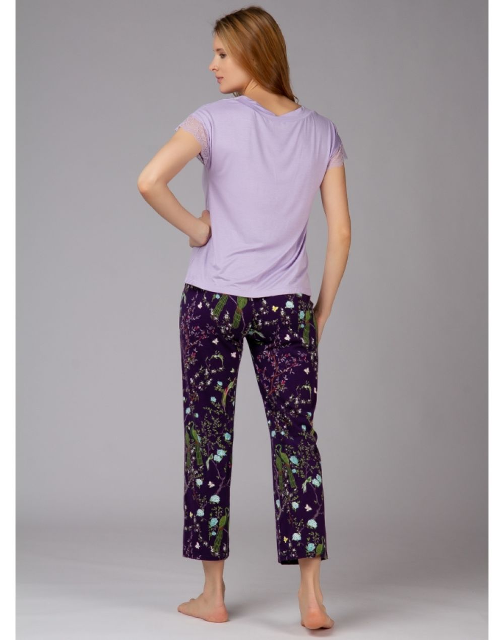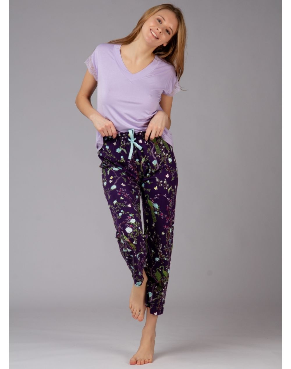 В комплекте – футболка с брюками. Футболка сиреневого цвета с V-образным вырезом выполнена на 95% из бамбука, короткие рукава обрамлены кружевом. Брюки с цветочным принтом изготовлены из бамбука и хлопка, прилегающие по фигуре, фиксируются мягкой резинкой с регулирующим шнурком.