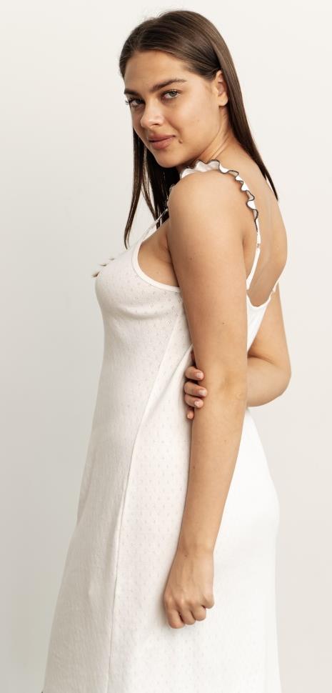 Сорочка на тонких регулируемых бретелях свободного прилегания. Вырез горловины круглый. Модель декорирована романтичными крылышками, контрастной строчкой, вязаным кружевом и планкой по линии груди.