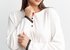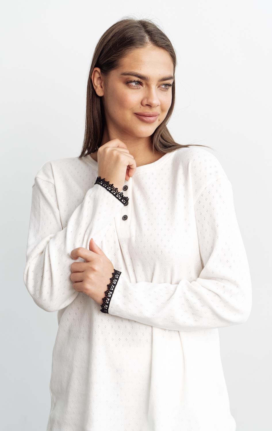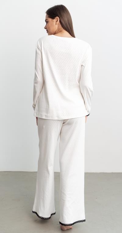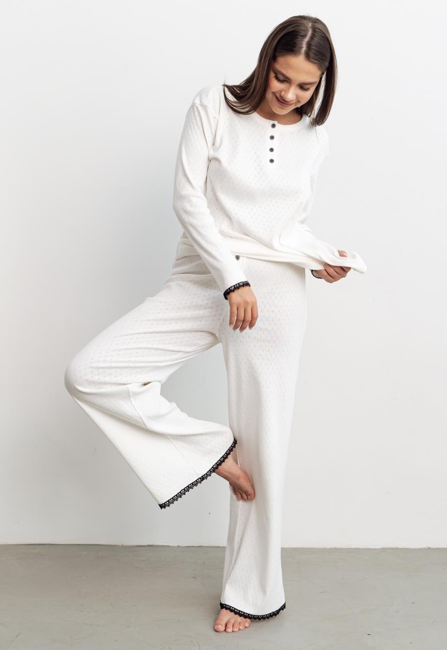 Модель декорирована контрастными элементами: низ рукавов и брюк украшены вязаным кружевом, горловина и брюки планкой с пуговицами. Пояс брюк на резинке.