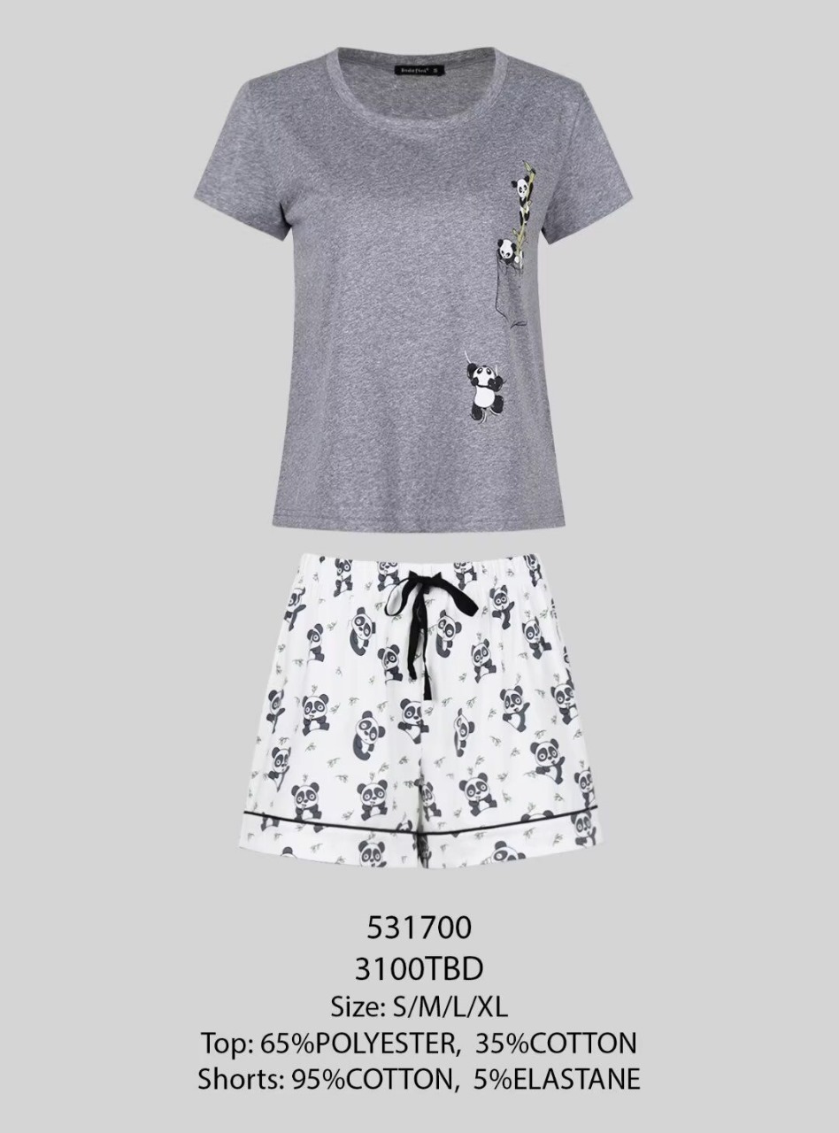 Женская пижама состоит из шорт и футболки. Футболка выполнена из смеси полиэстера и хлопка, а шорты изготовлены из хлопка, что делает данную пижаму мягкой и приятной к телу. Футболка имеет короткие рукава и круглый вырез, что обеспечивает свободу движений. Принт в виде панд добавляет женственности и романтичности этой пижаме.