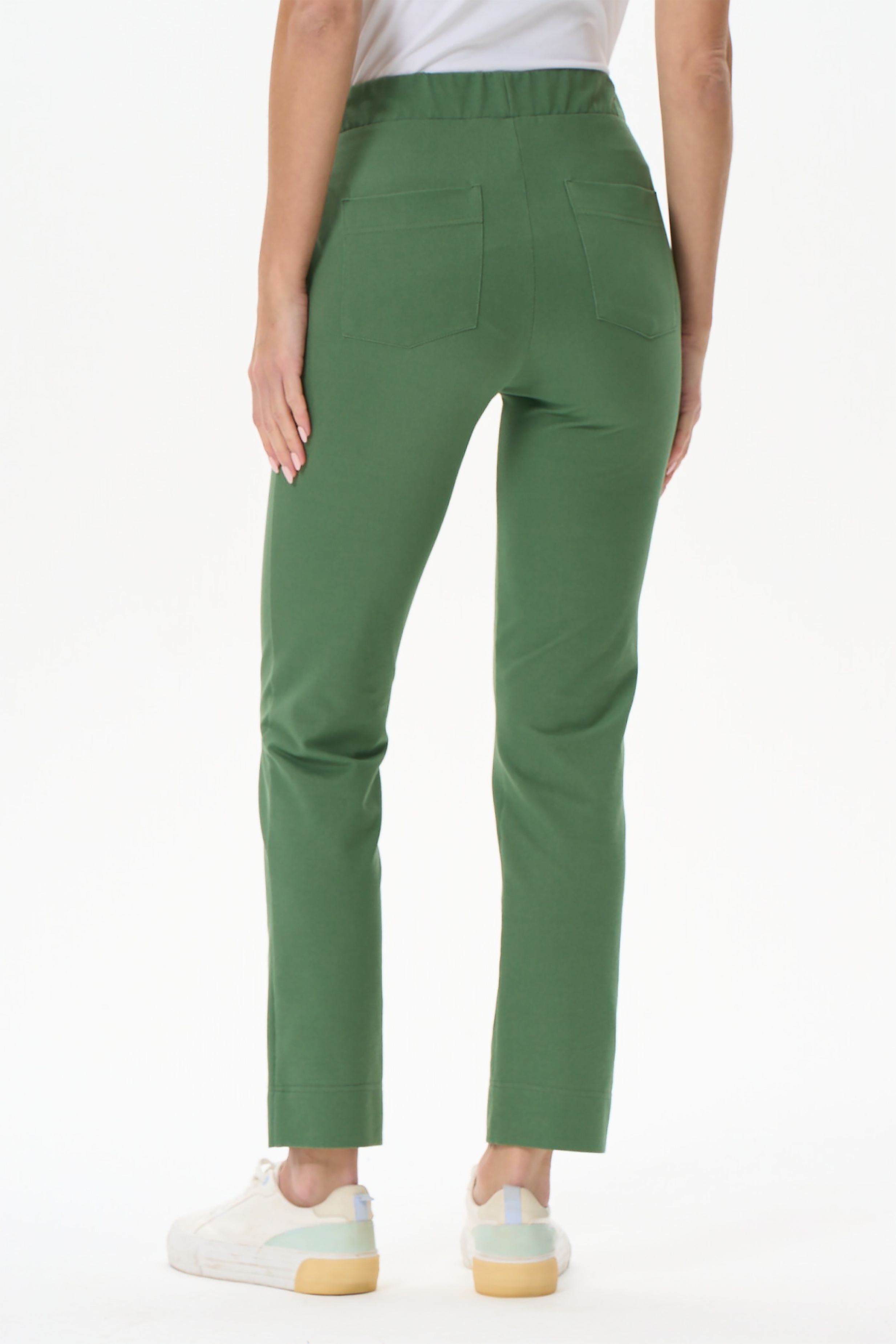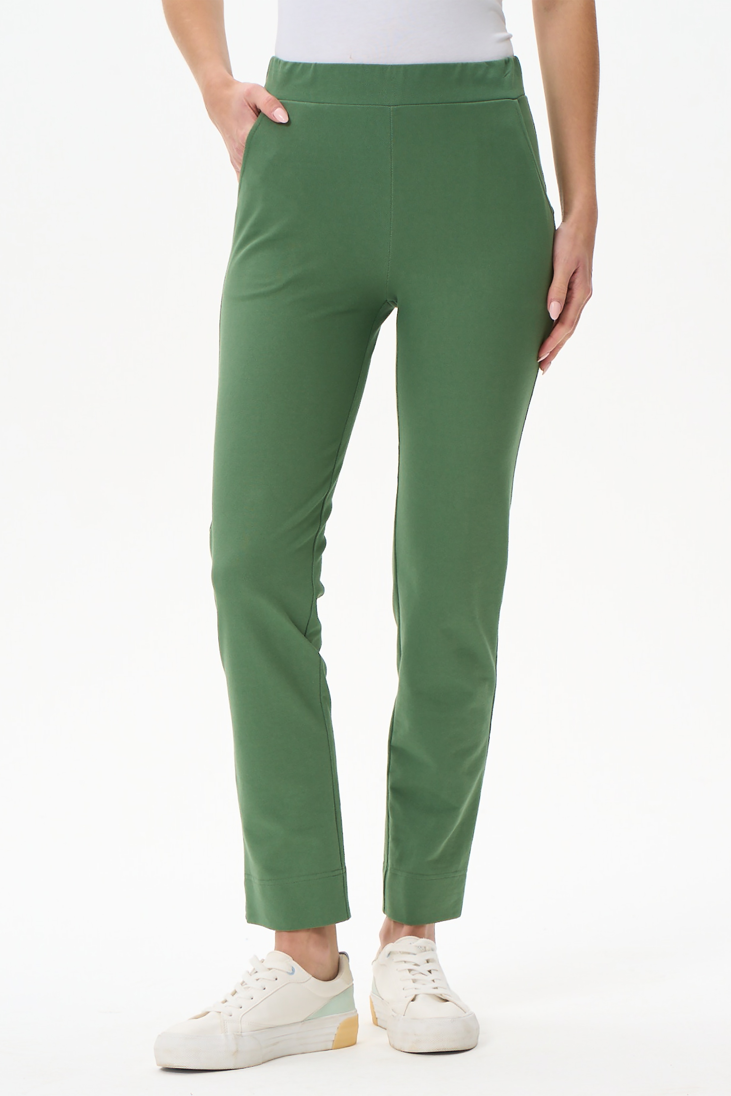 Прямые брюки с карманами, из хлопкового полотна джинскотт. Пояс с эластичной лентой внутри. Сзади два накладных кармана. Длина брюк регулируется подворотом. Длинна по боковому шву (без учета пояса) в 44 размере - 94см.Рост модели 177