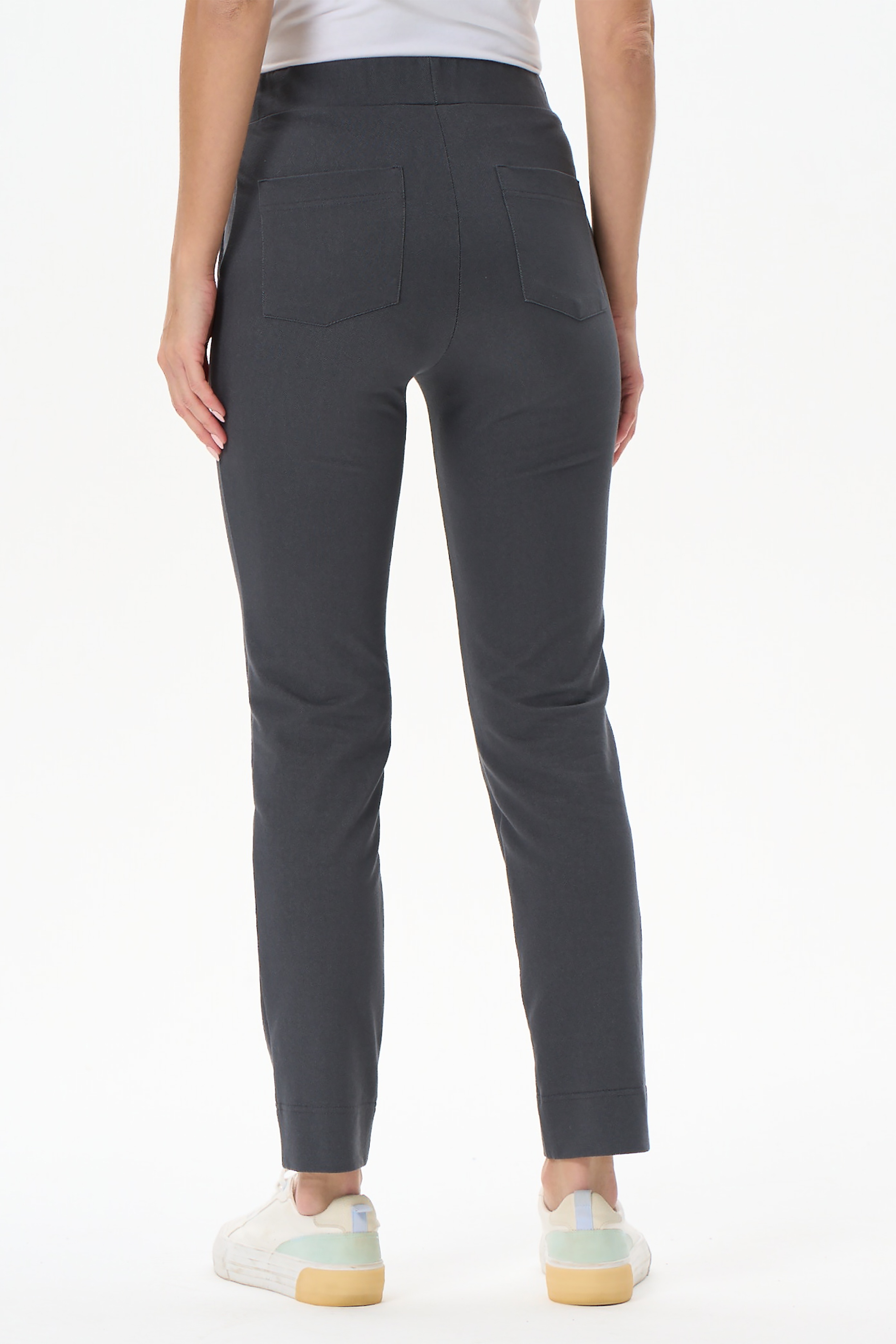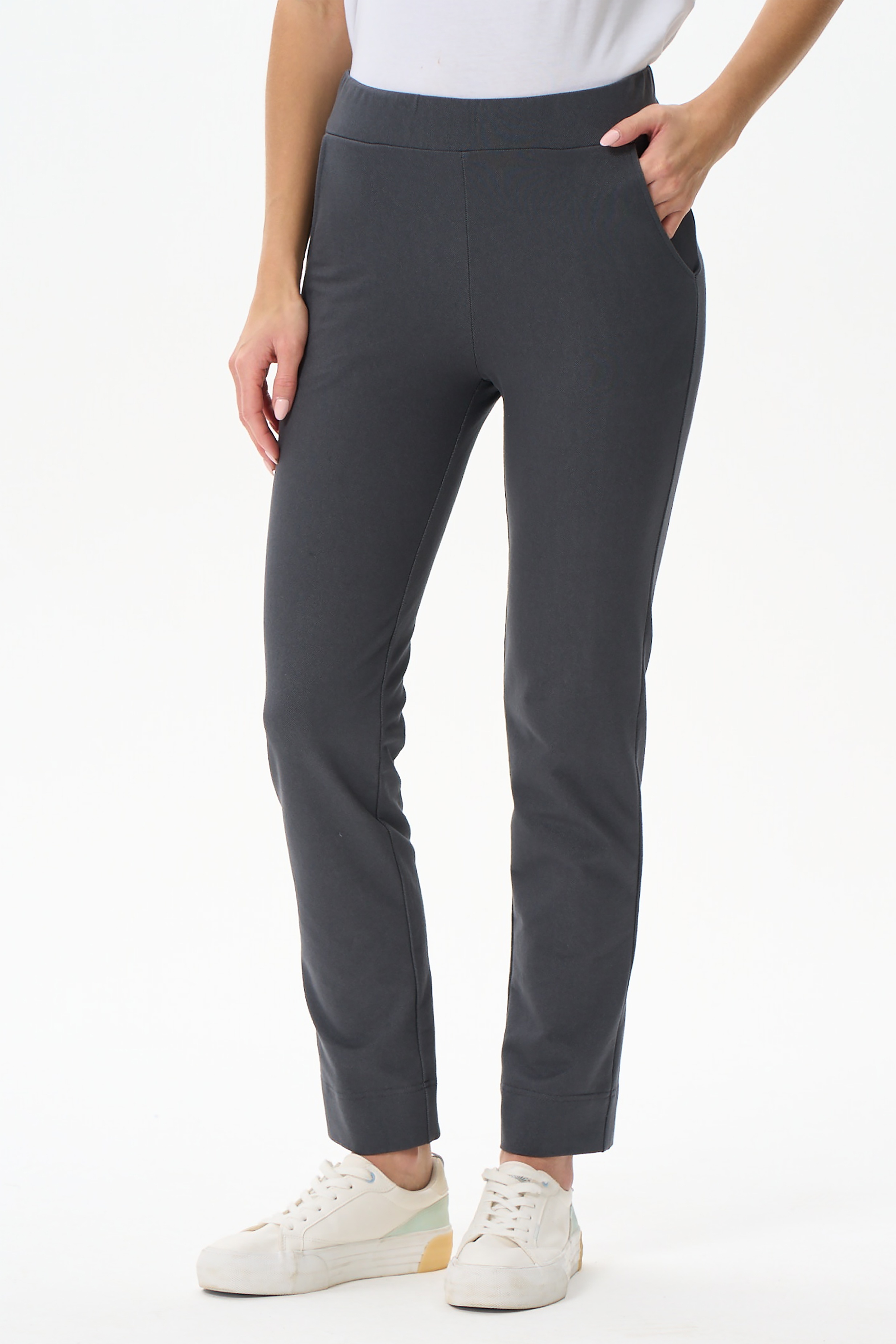 Прямые брюки с карманами, из хлопкового полотна джинскотт. Пояс с эластичной лентой внутри. Сзади два накладных кармана. Длина брюк регулируется подворотом. Длинна по боковому шву (без учета пояса) в 44 размере - 94см. Рост модели на фото 177