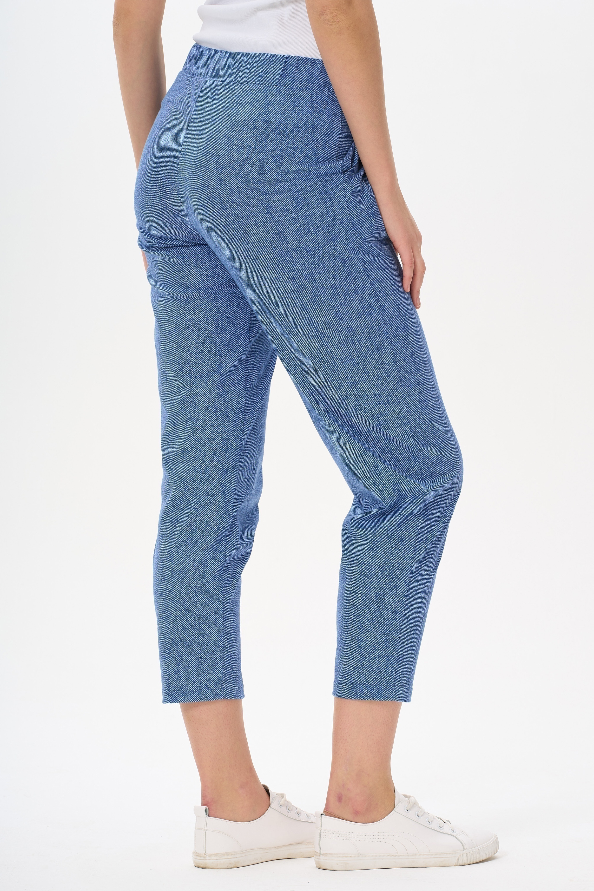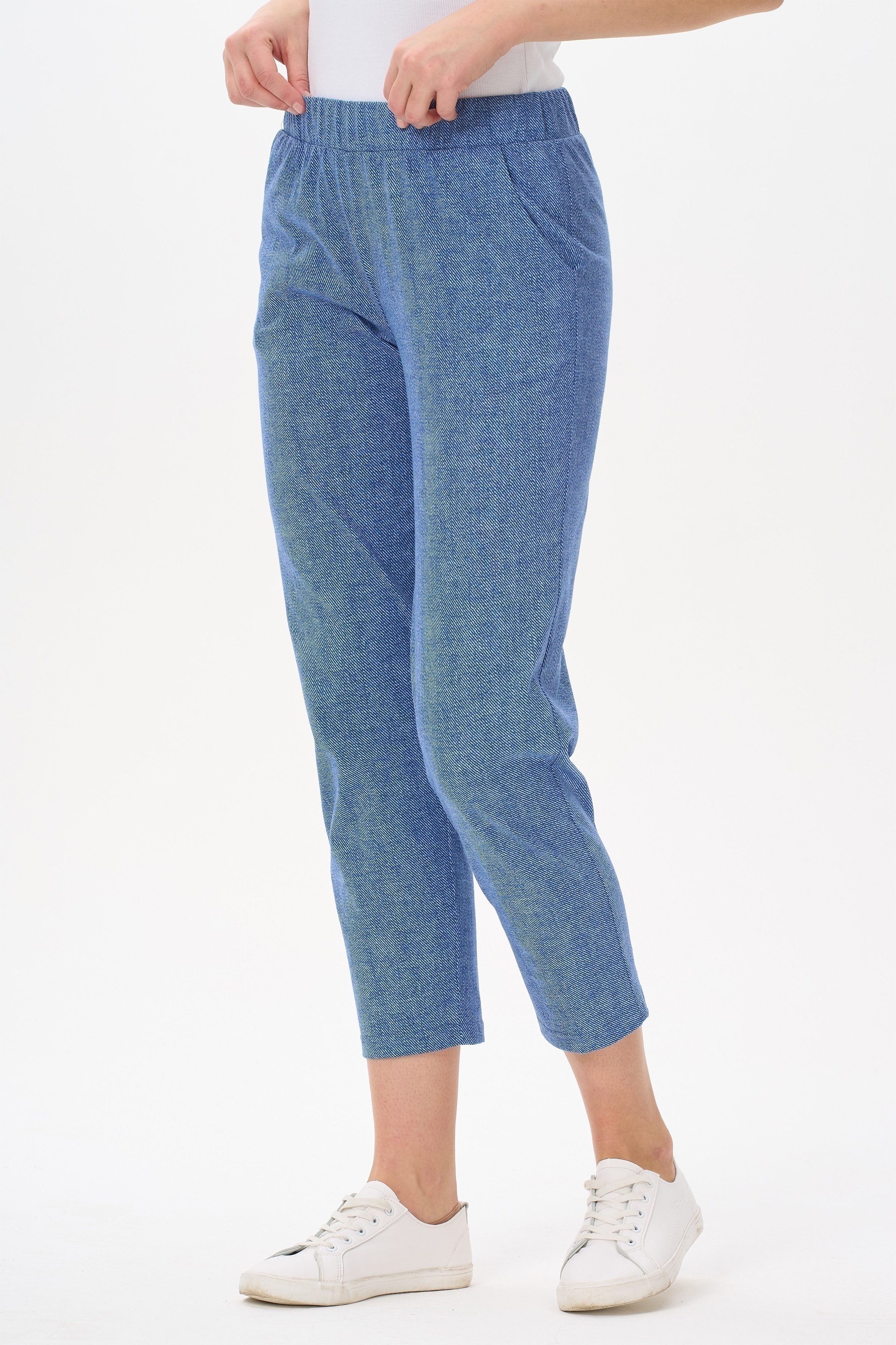 Универсальные брюки, длиной 7/8 из хлопкового полотна. Пояс с эластичной лентой, два фигурных боковых кармана. Длина брюк по боковому шву (без учета пояса) в 44 размере 87см. Рост модели на фото 177см.