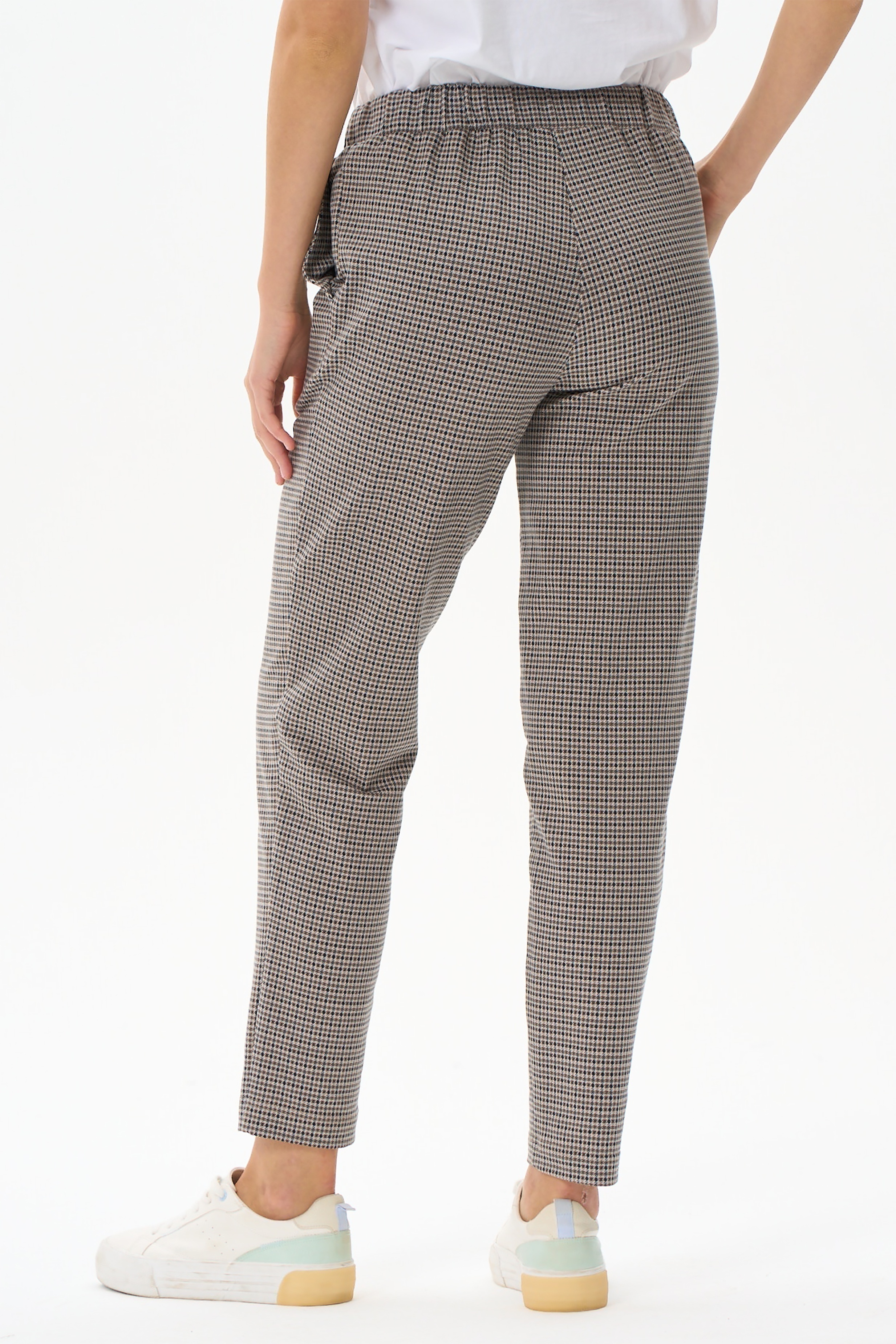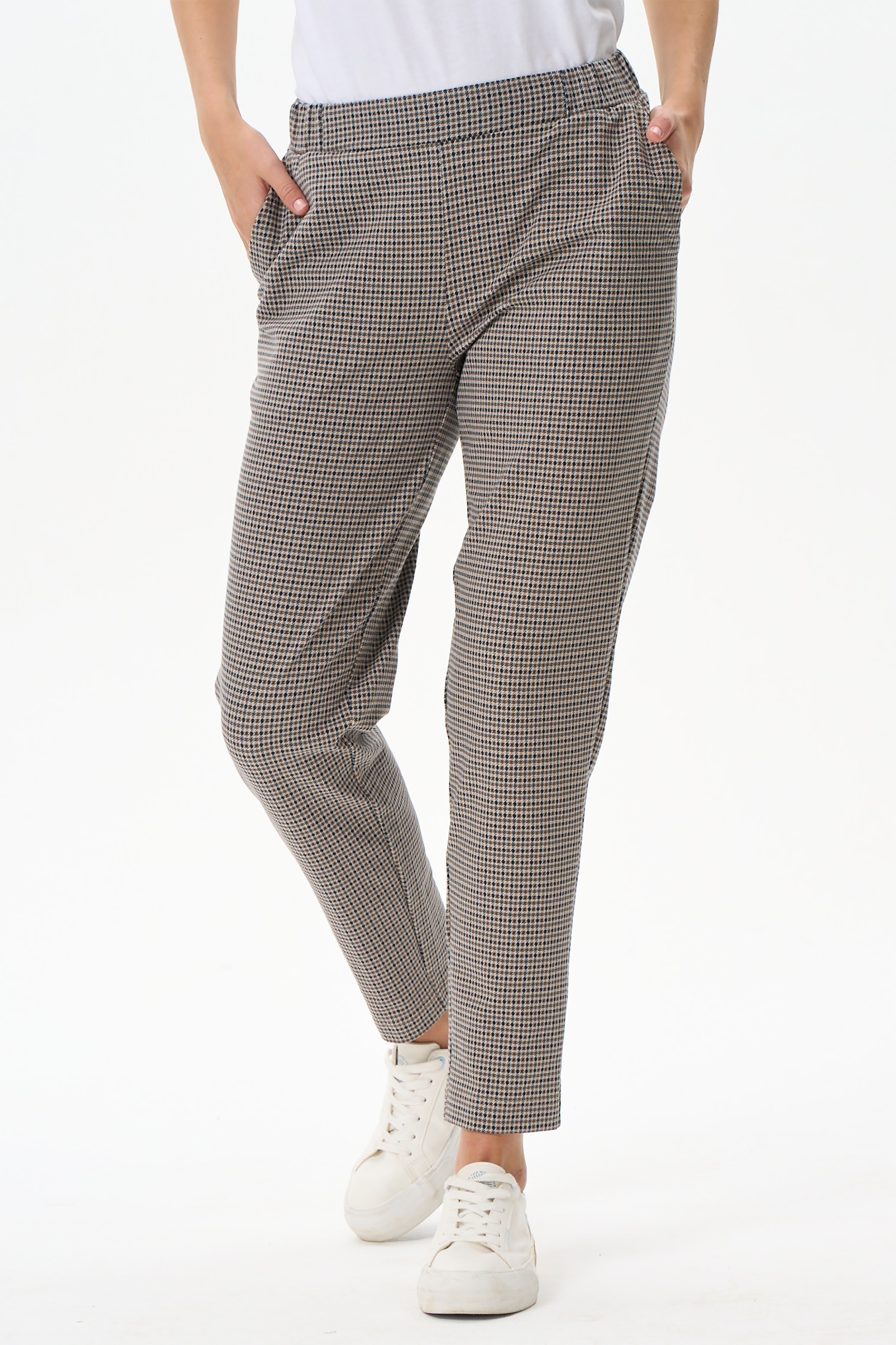 Комфортные, длинные, чуть зауженные брюки с карманами из хлопкового футера 2х нитки (без начеса). Пояс с планкой и эластичной тесьмой внутри. Длина брюк регулируется отворотами. Принт мелкая клетка "Пепита". Длина по боковому шву в 44 размере - 95см. Рост модели 177