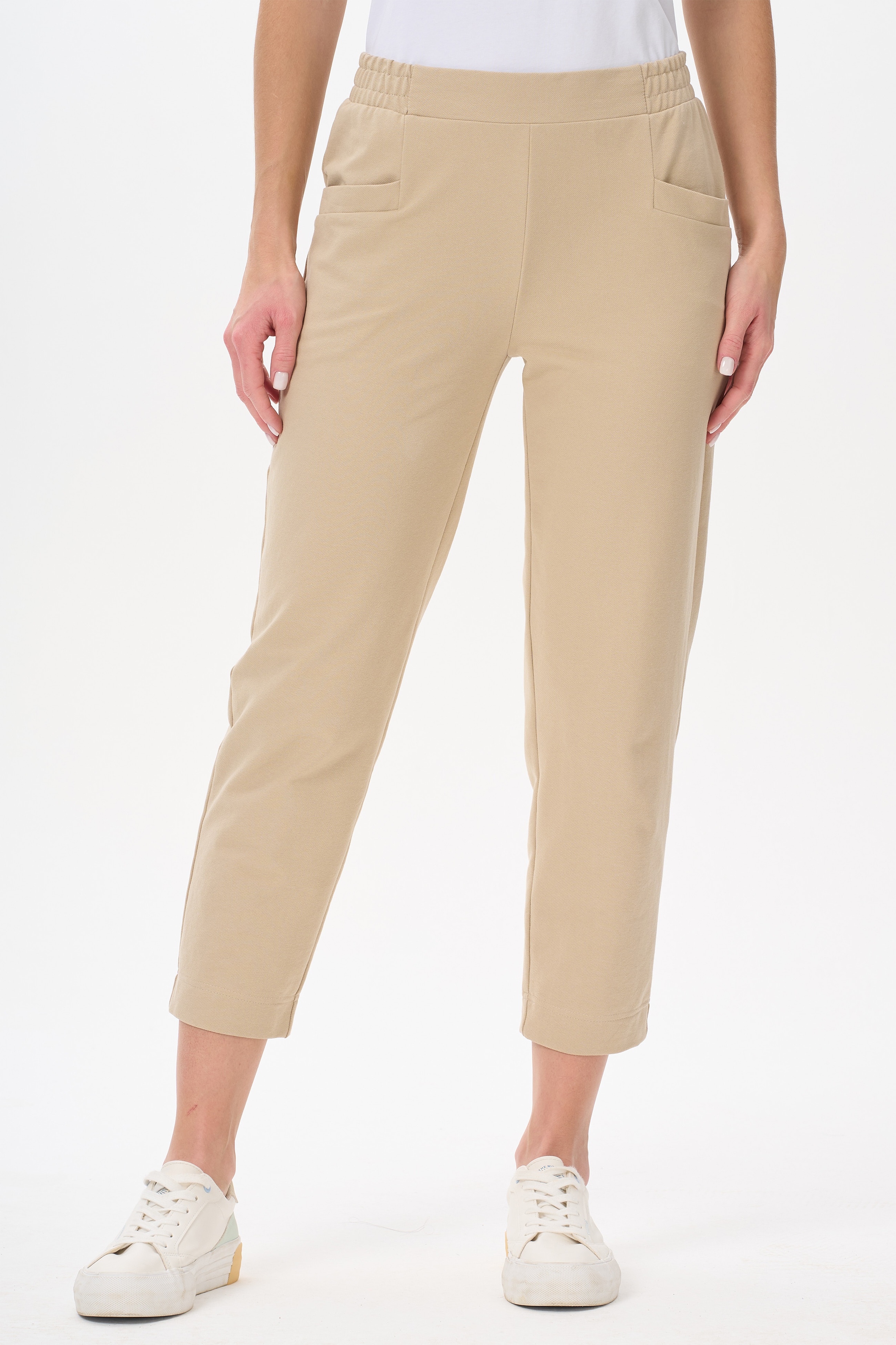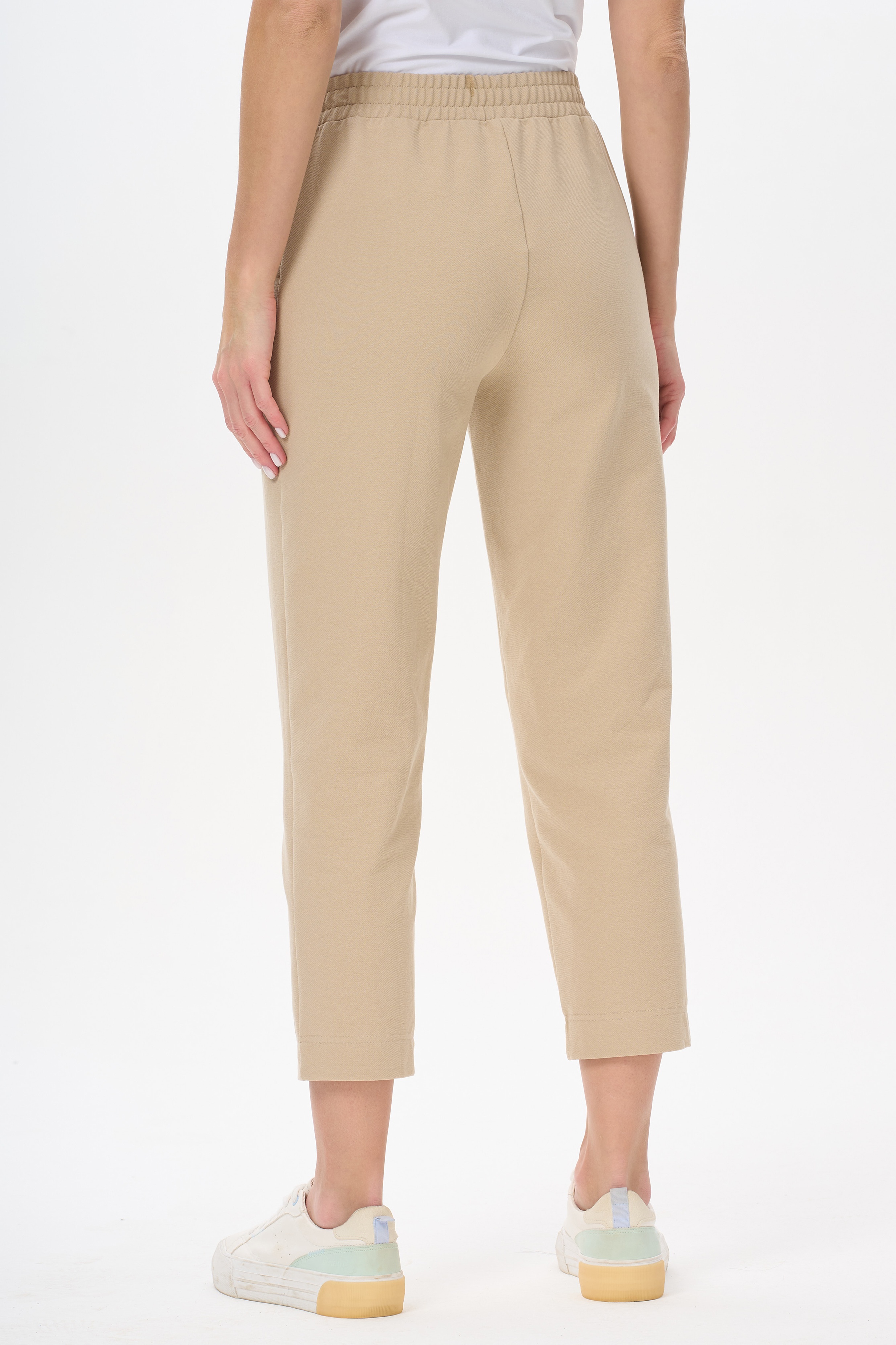 Укороченные, зауженные брюки с фигурными карманами, из хлопкового полотна джинскотт. Пояс с планкой и эластичной тесьмой внутри. Длина по боковому шву(без пояса) 87см. Рост модели на фото 177.