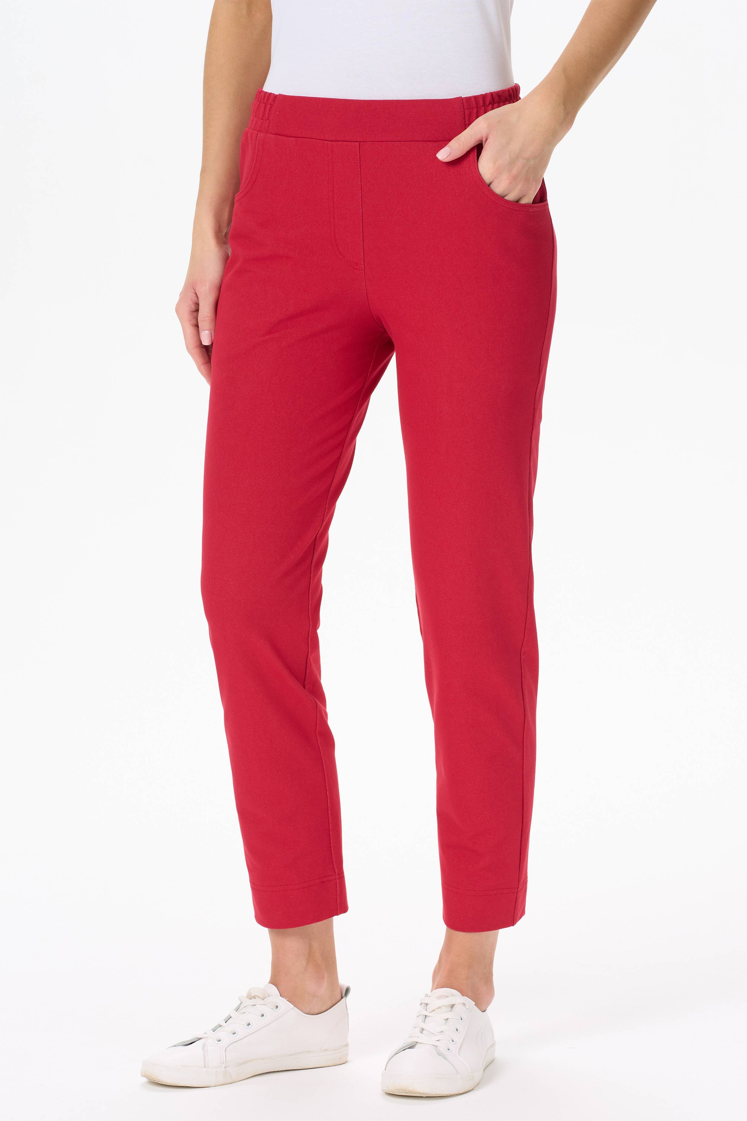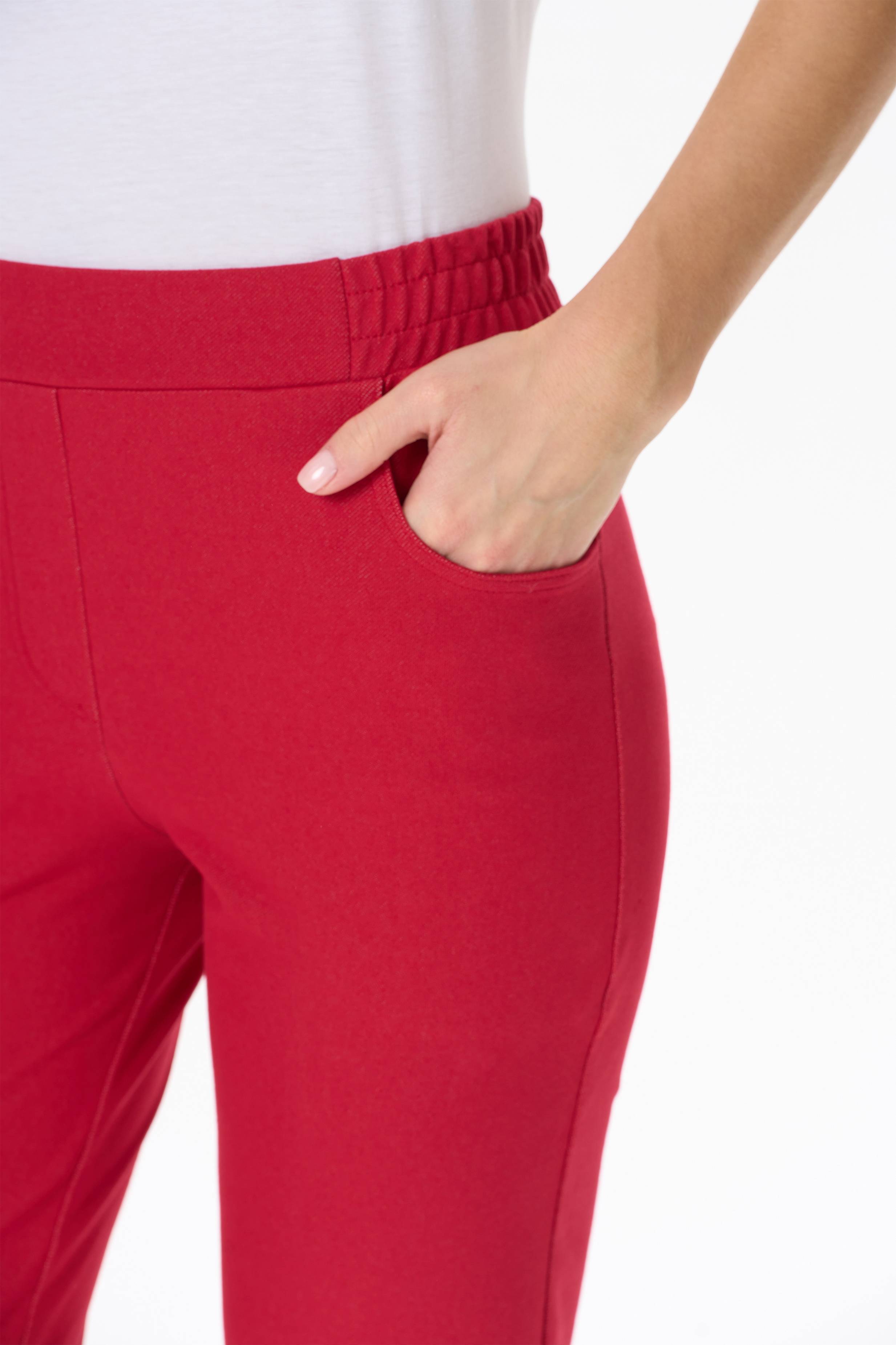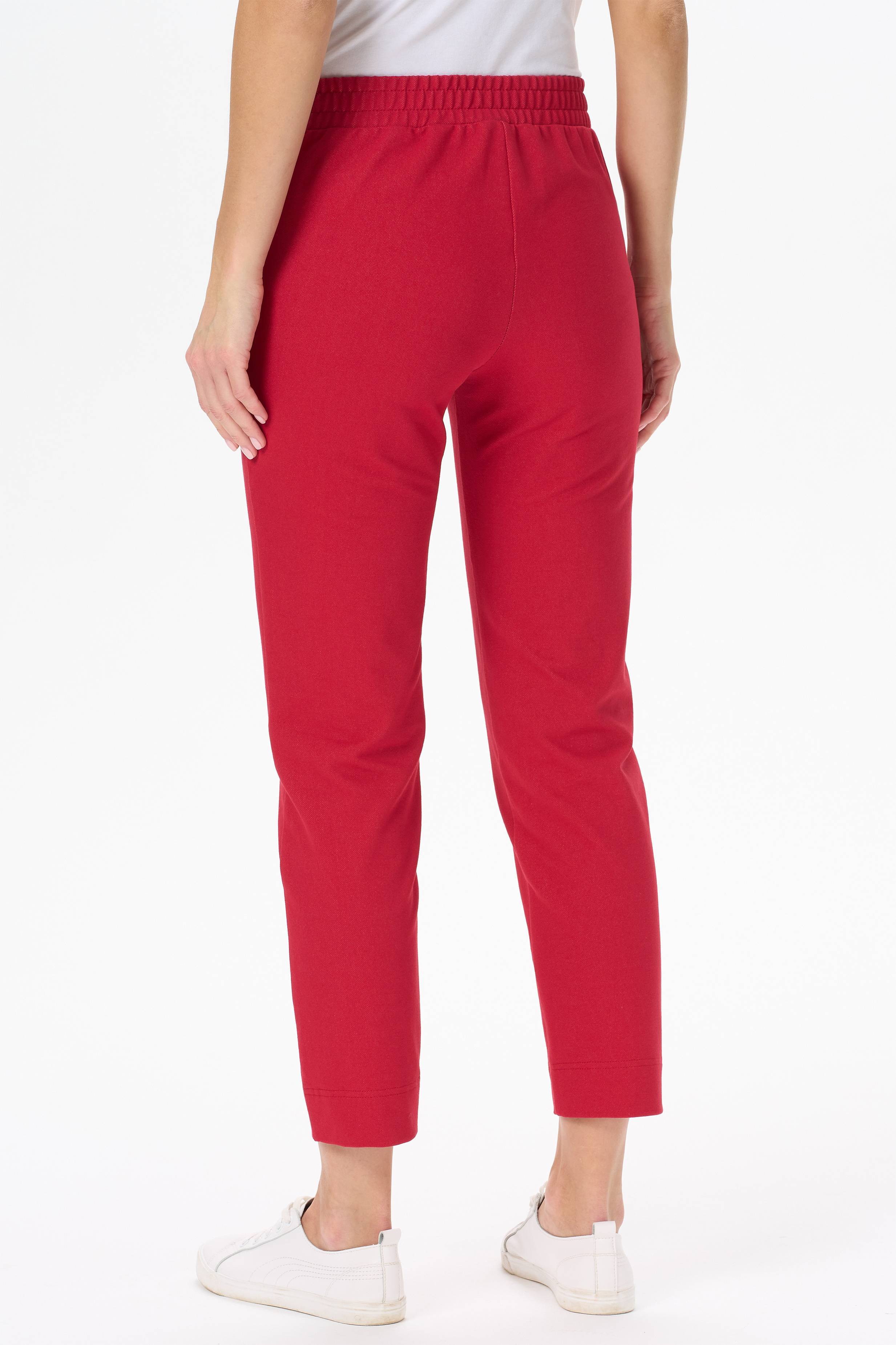 Зауженные брюки с карманами, из хлопкового полотна джинскотт. Пояс с планкой и эластичной лентой внутри. По низу брюк отвороты. Рост модели на фото 177см.