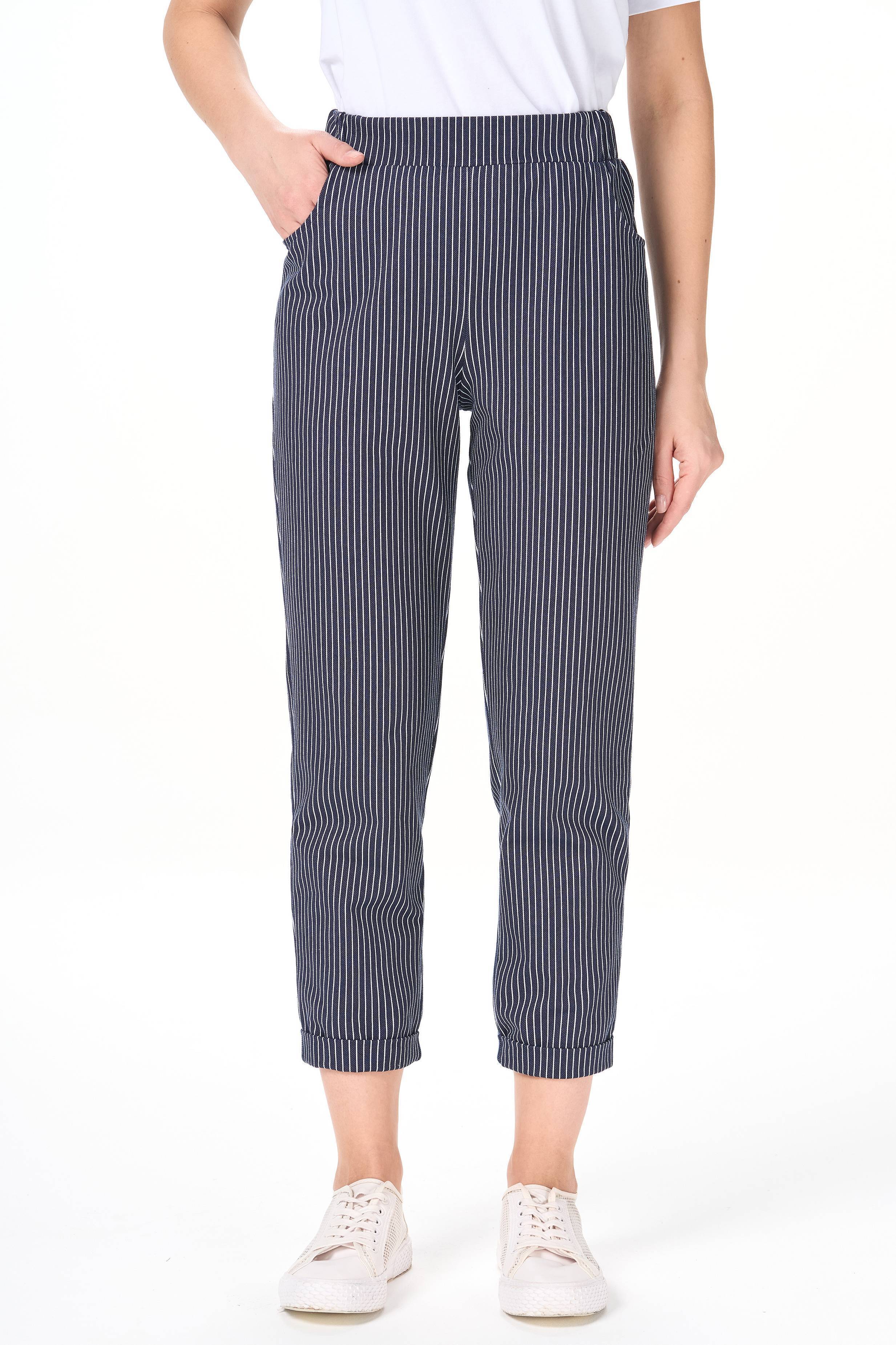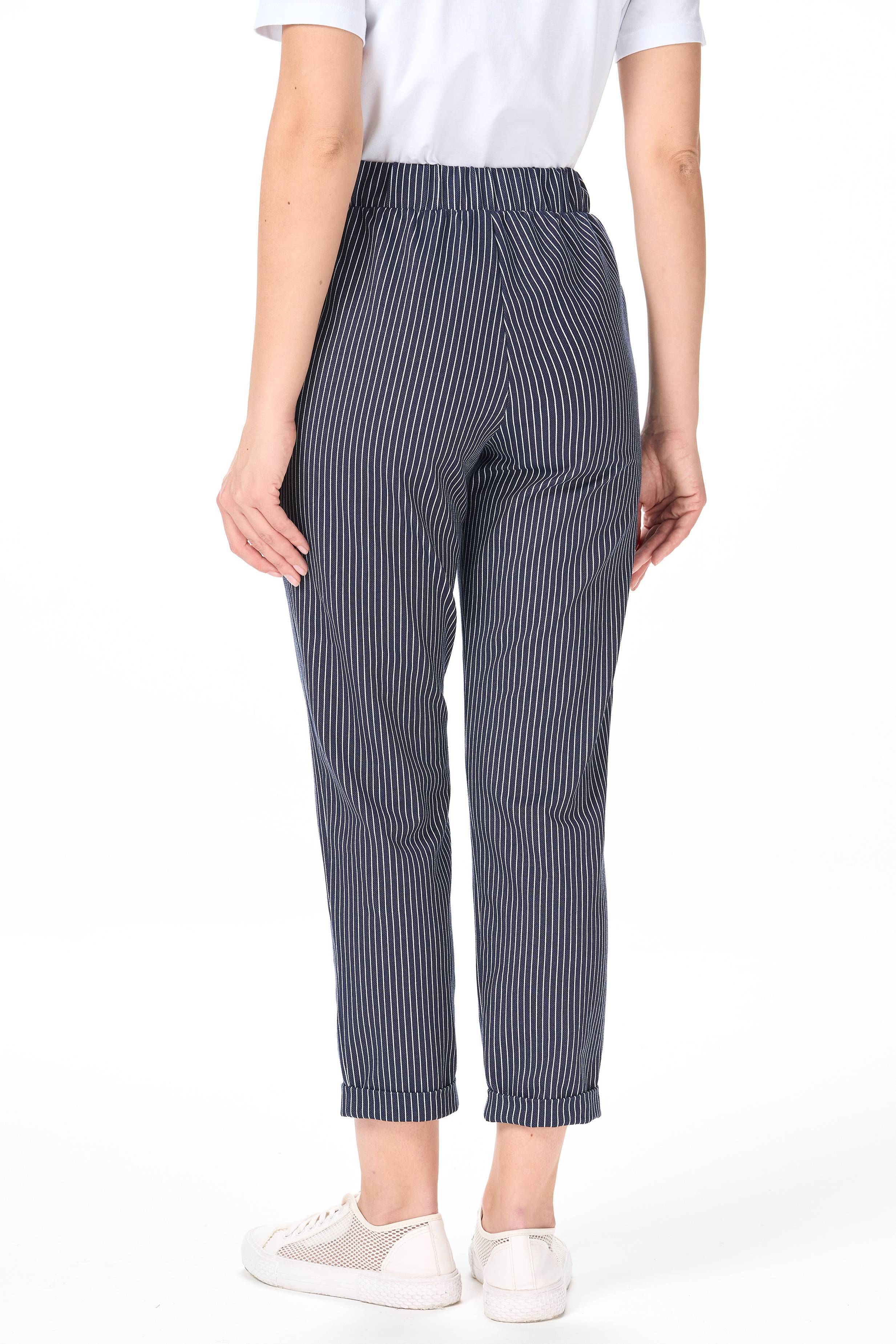 Брюки из хлопкового полотна джинскотт зауженного силуэта с карманами. Пояс с планкой и эластичной лентой внутри. По низу брюк манжеты. Принт: полоска. Рост модели 177