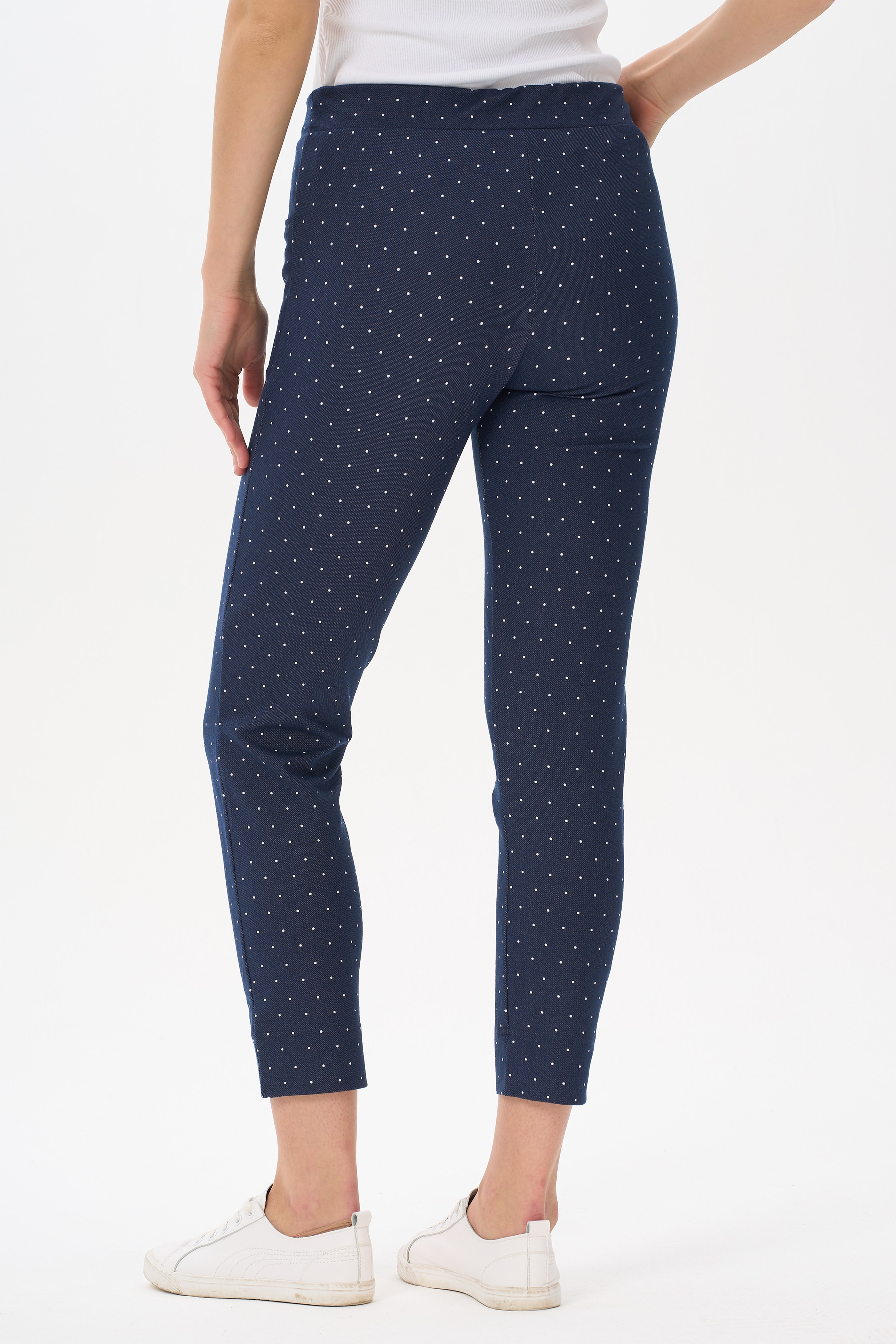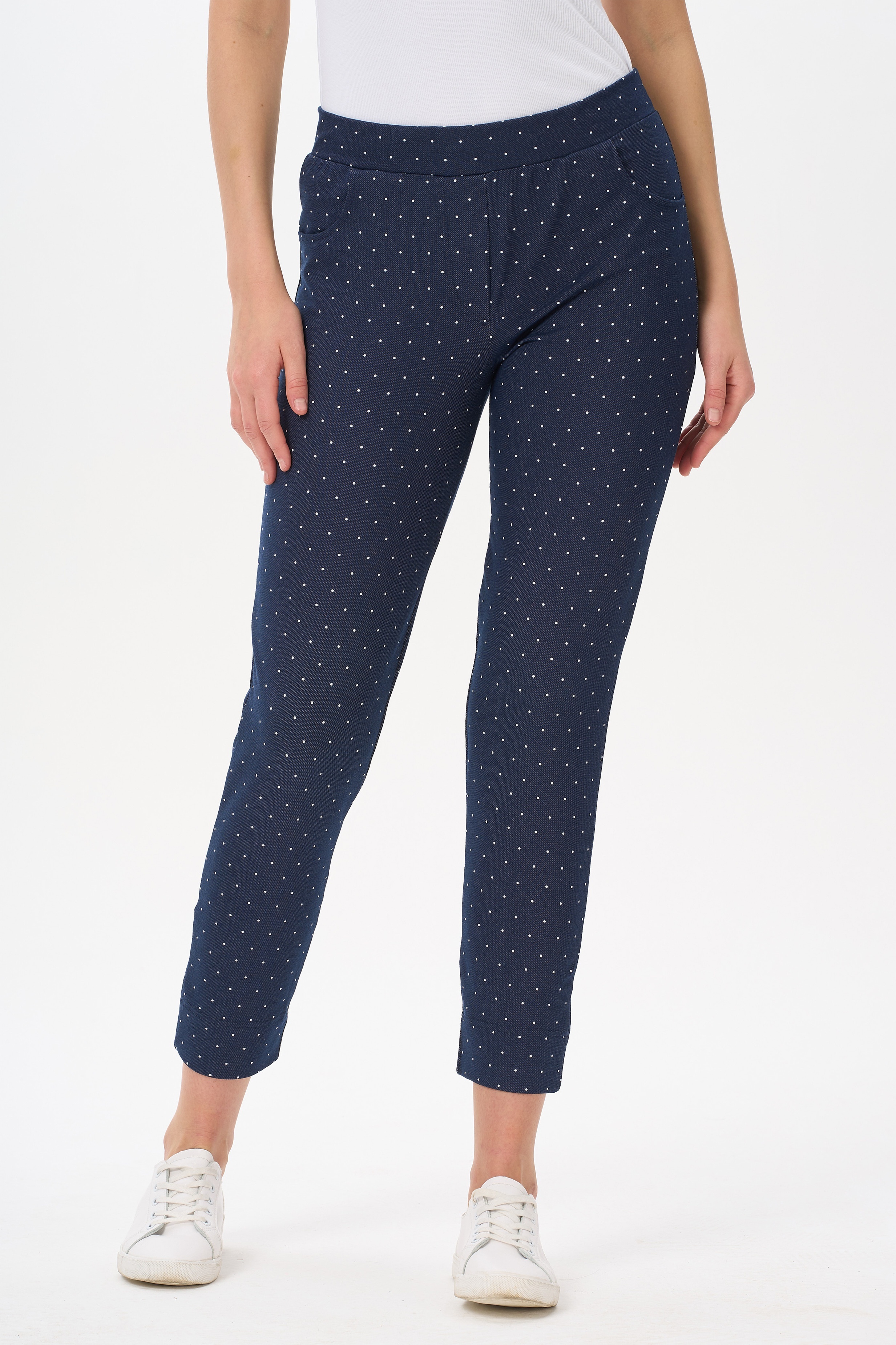 Зауженные брюки с карманами, из хлопкового полотна джинскотт. Пояс с эластичной лентой внутри. Длина брюк регулируется подворотом. Длина по боковому шву (без учета пояса) в 44 размере 88см. Рост модели 177