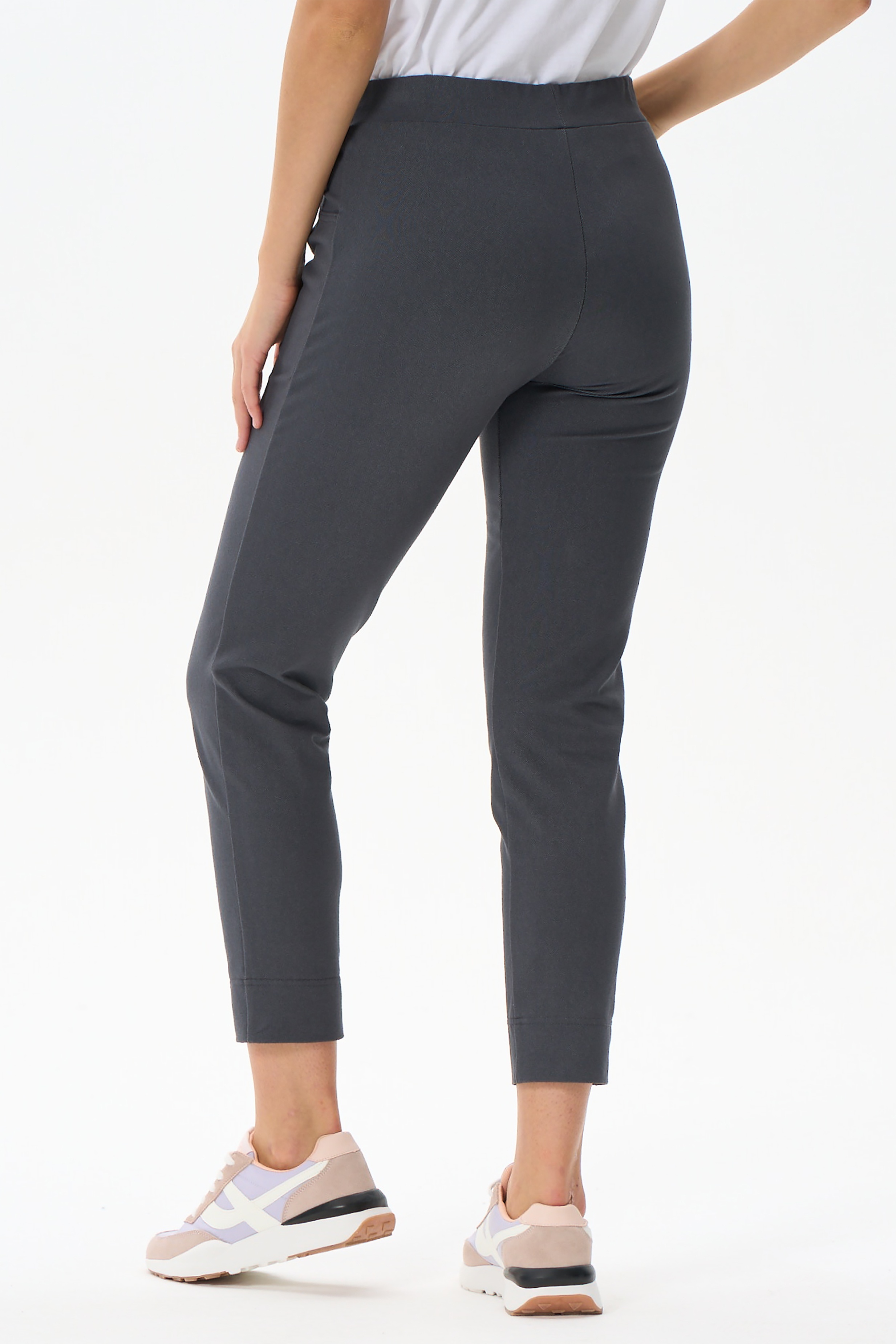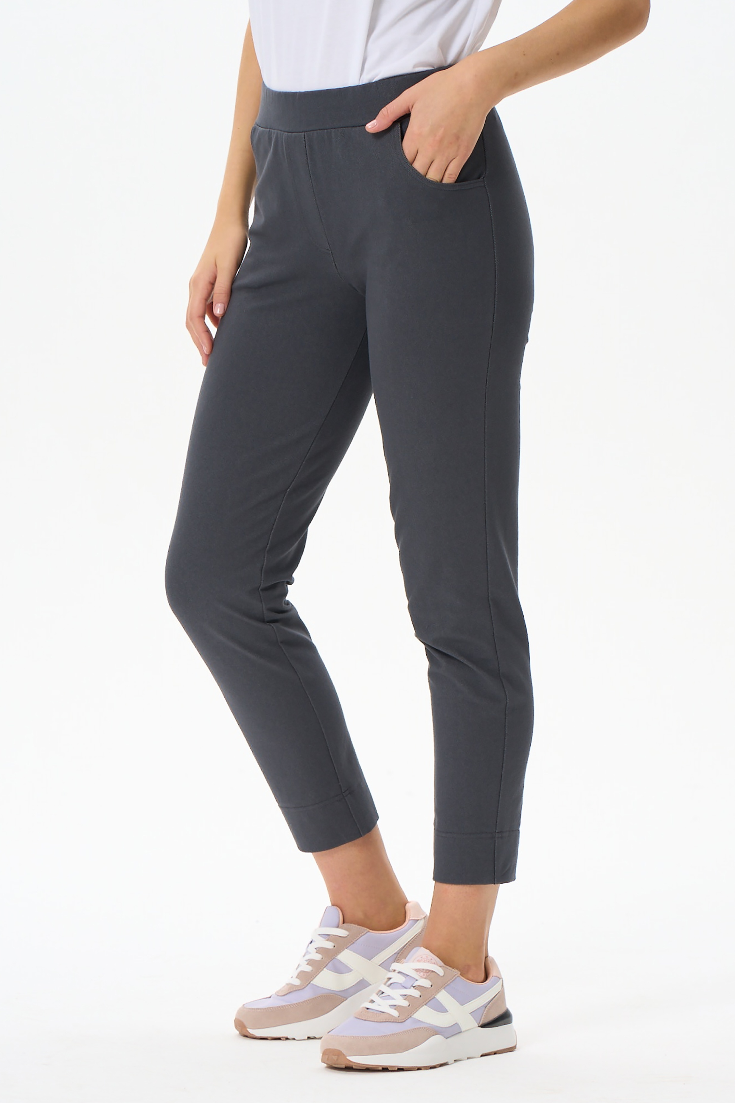 Зауженные брюки с карманами, из хлопкового полотна джинскотт. Пояс с эластичной лентой внутри. Длина брюк регулируется подворотом. Длина по боковому шву (без учета пояса) в 44 размере 88см. Рост модели 177