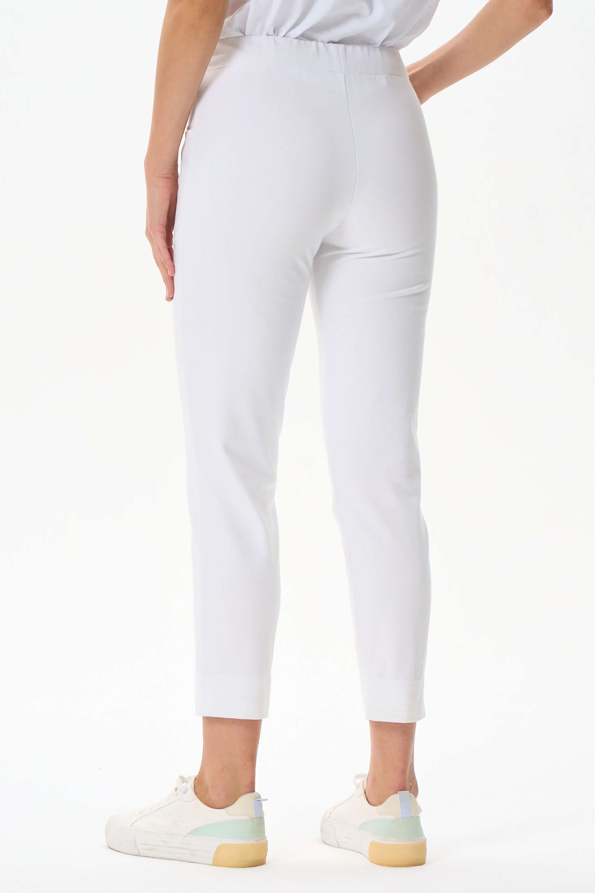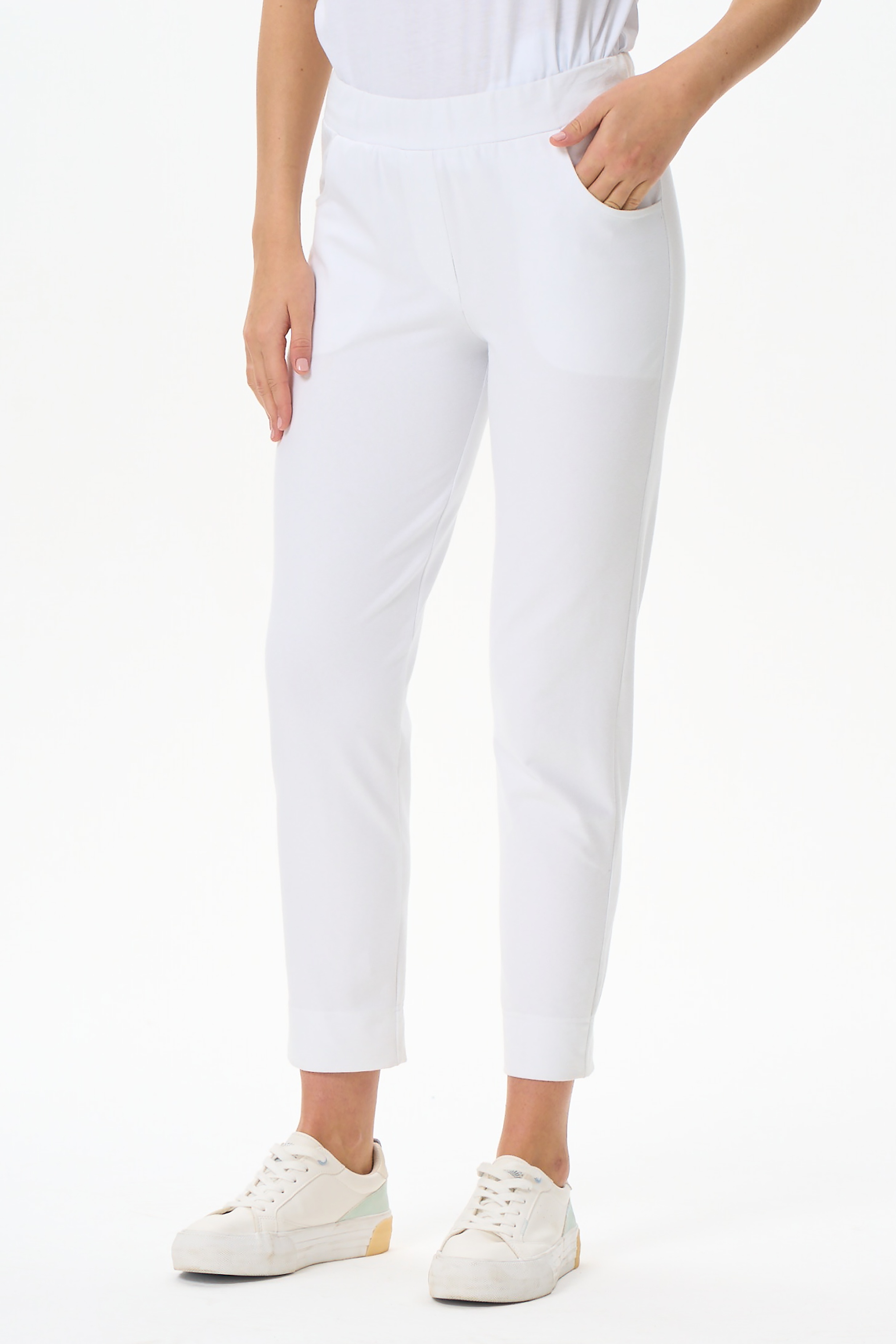Повседневные брюки из хлопкового полотна-джинскотт, зауженные к низу, с карманами. Пояс притачной с эластичной тесьмой. Рост модели 170см.