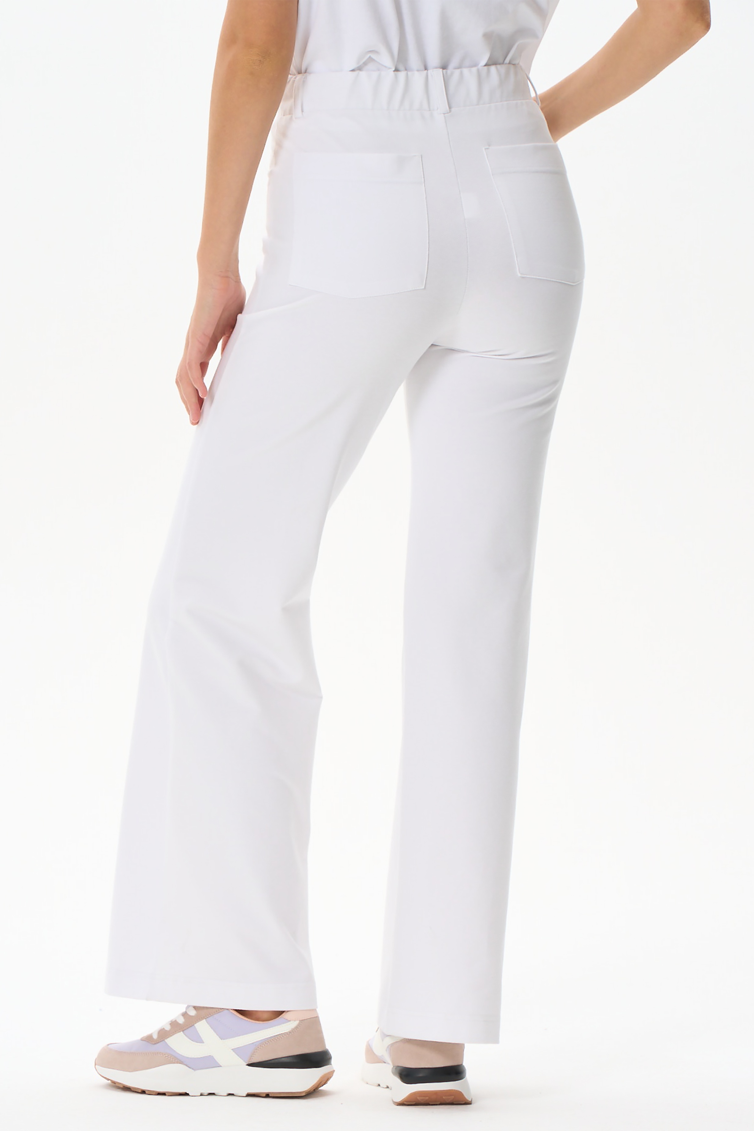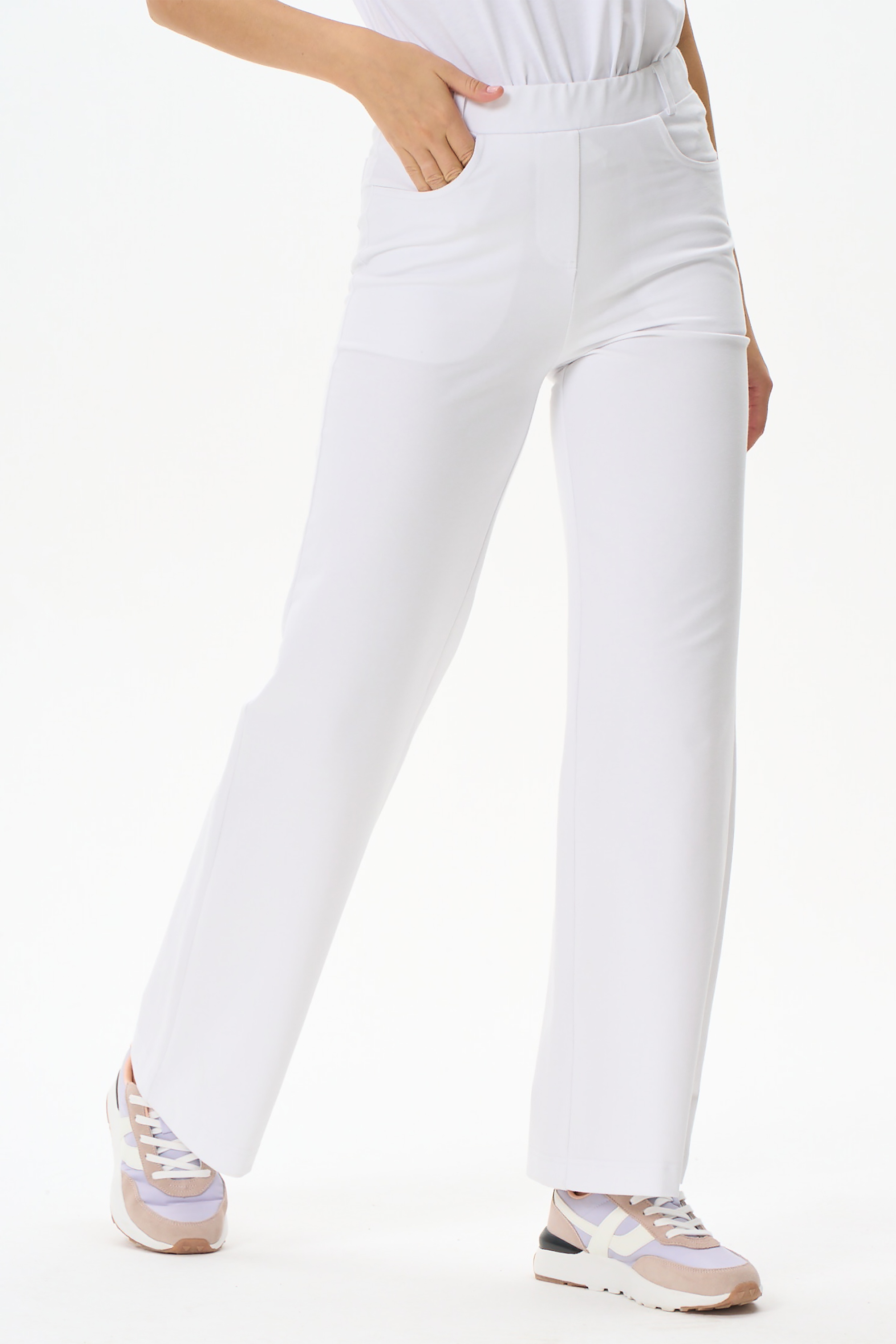 Брюки новой формы, плотно сидящие на бёдрах с высокой посадкой. Выполнены из хлопкового полотна джинскотт. Умеренное расклешение начинается выше коленей. Спереди фигурные карманы, отделочная строчка - имитация гульфика, пояс со шлевками под ремень. Сзади накладные карманы. Длина по боковуму шву в 44 размере - 104см. Рост модели на фото 177.