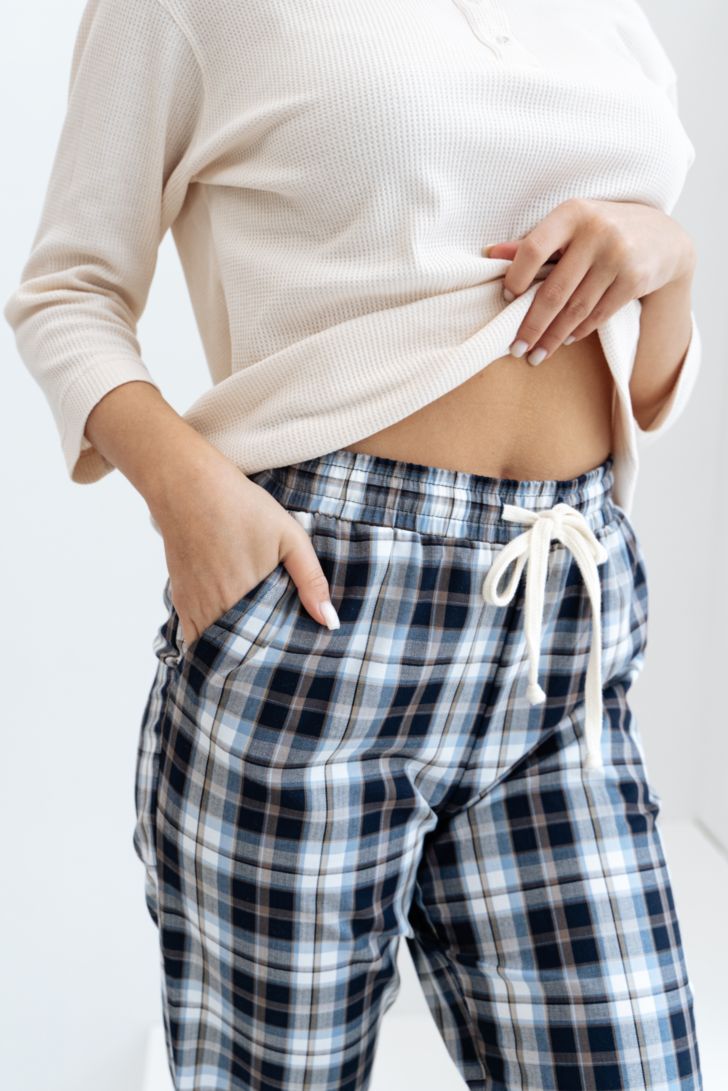 Удобные прямые брюки, на кулиске в поясе. Втачные карманы на бедрах.