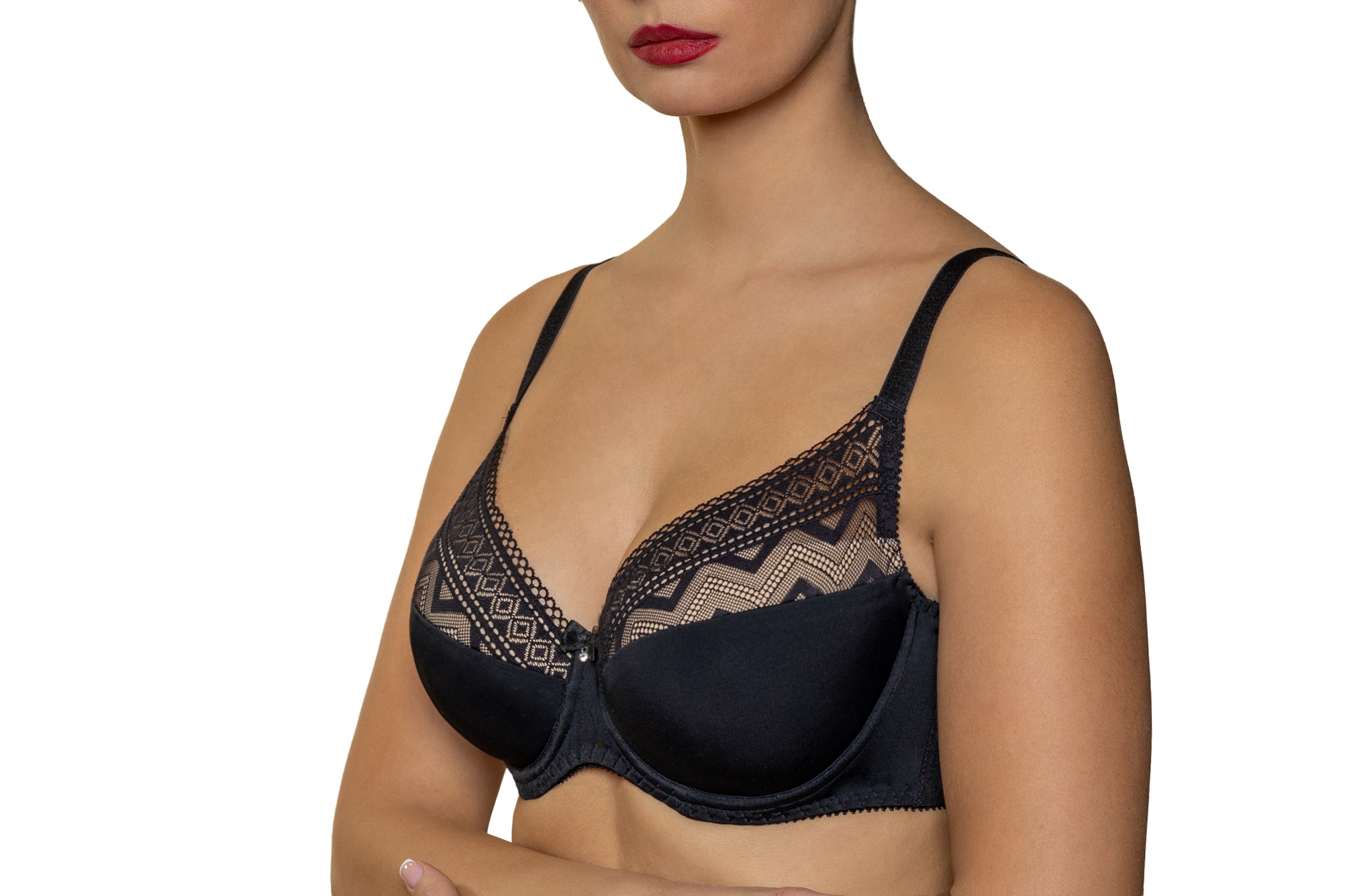 Бюстгальтер "полупоролон" из эластичного кружева с орнаментом "геометрия", эластичной микрофибры и полотна soft. Нижние детали чашек продублированы хлопком. Уникальность данной модели заключается в том, что она соединила в себе 3 конструкции: и бюстгальте Состав:полиамид 80%, эластан 20%