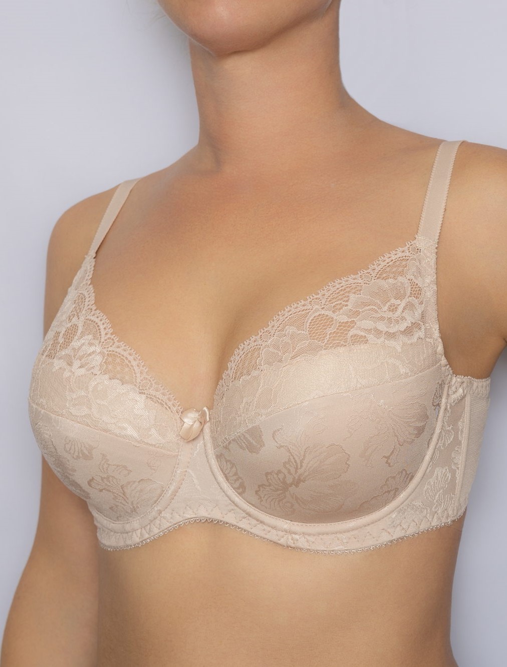 Бюстгальтер "полупоролон". Выполнен из эластичного принтованного полотна и эластичного кружева. Нижние детали чашек продублированы хлопком. Идеально приподнимает и поддерживает грудь, создавая красивую зону декольте. На стане бюстгальтера боковые корректирующие пластины, позволяющие прилегать к телу и не скручиваться поясу бюстгальтера, создают необходимую опору и делают силуэт более четким. Украшение: атласный бантик подвеской.