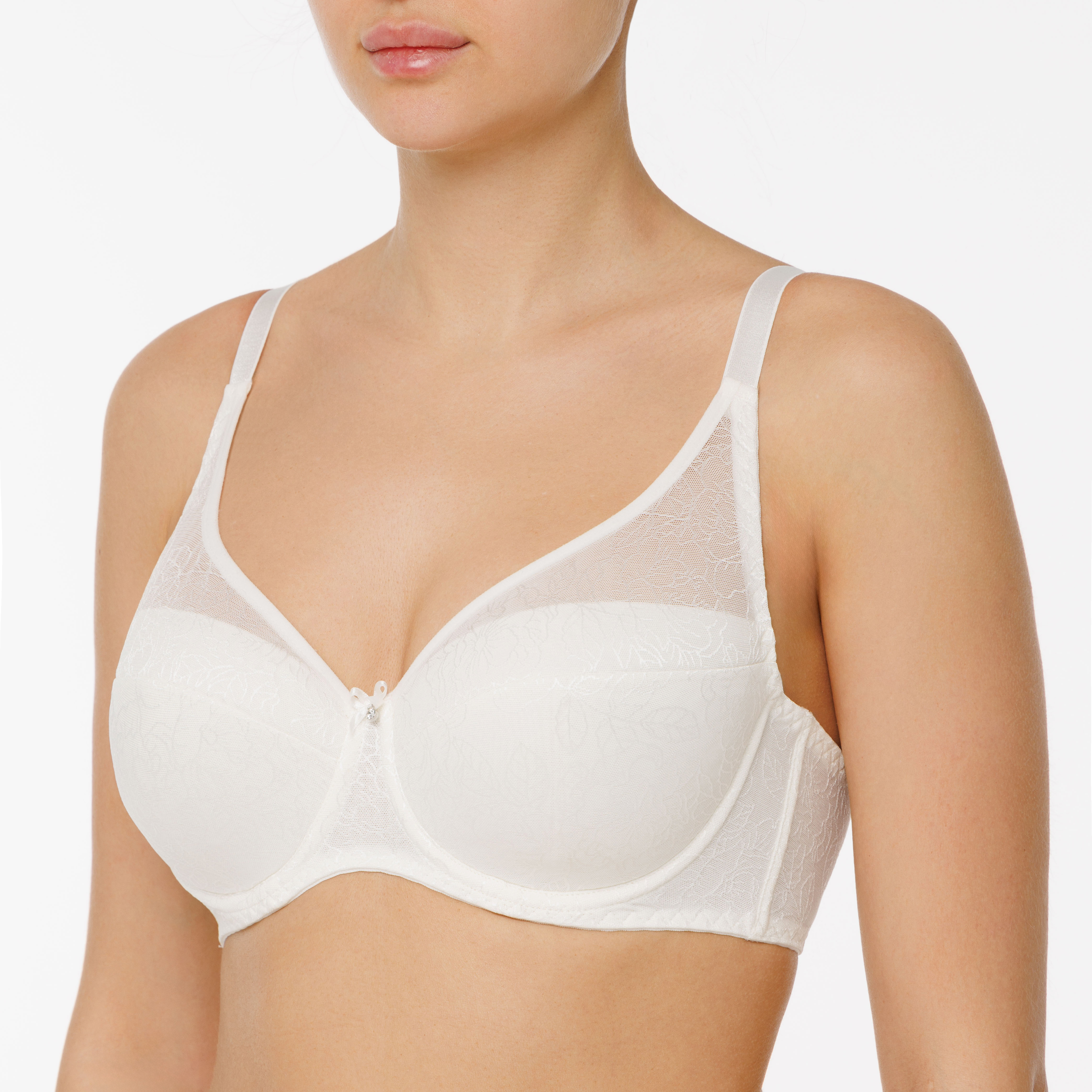 Бюстгальтер на поролоне жаккардового полотна с рисунком "змейка" и эластичной сетки. Нижние детали чашек продублированы хлопком. Благодаря поддерживающей функции, соблазнительному дизайну и способности зрительно увеличивать грудь, его можно носить с любой одеждой. На стане бюстгальтера боковые корректирующие пластины, позволяющие прилегать к телу и не скручиваться поясу бюстгальтера. Стан бюстгальтера из ультратонкого эластичного набивного жаккардового полотна, продублированного сеткой. Украшение: атласный бантик подвеской.