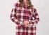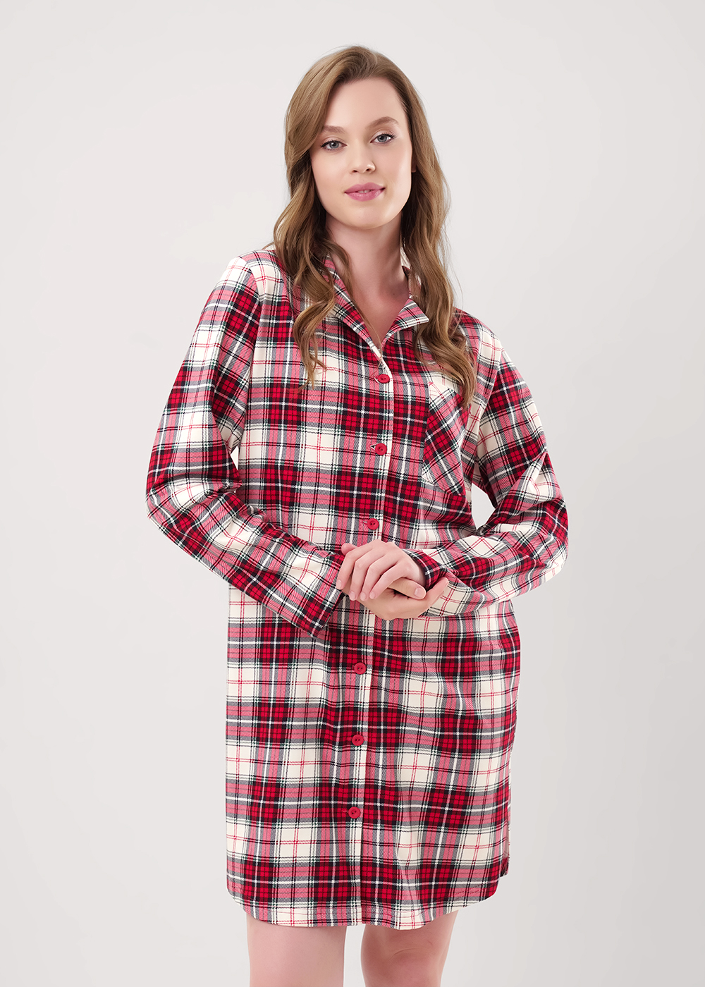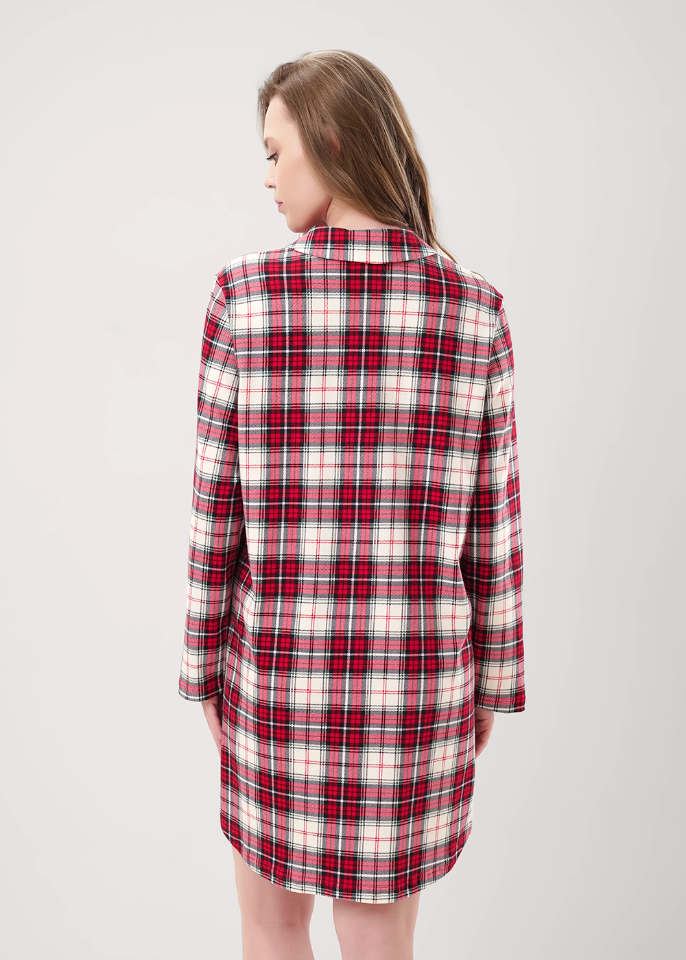 Платье-рубашка для дома и отдыха из хлопкового трикотажного полотна с карбоном, прямого силуэта. Втачной длинный рукав. Застёжка на пуговицы, воротник с лацканами. На детали переда накладной карман, нашивка. Низ изделия округлой формы, по бокам разрезы.