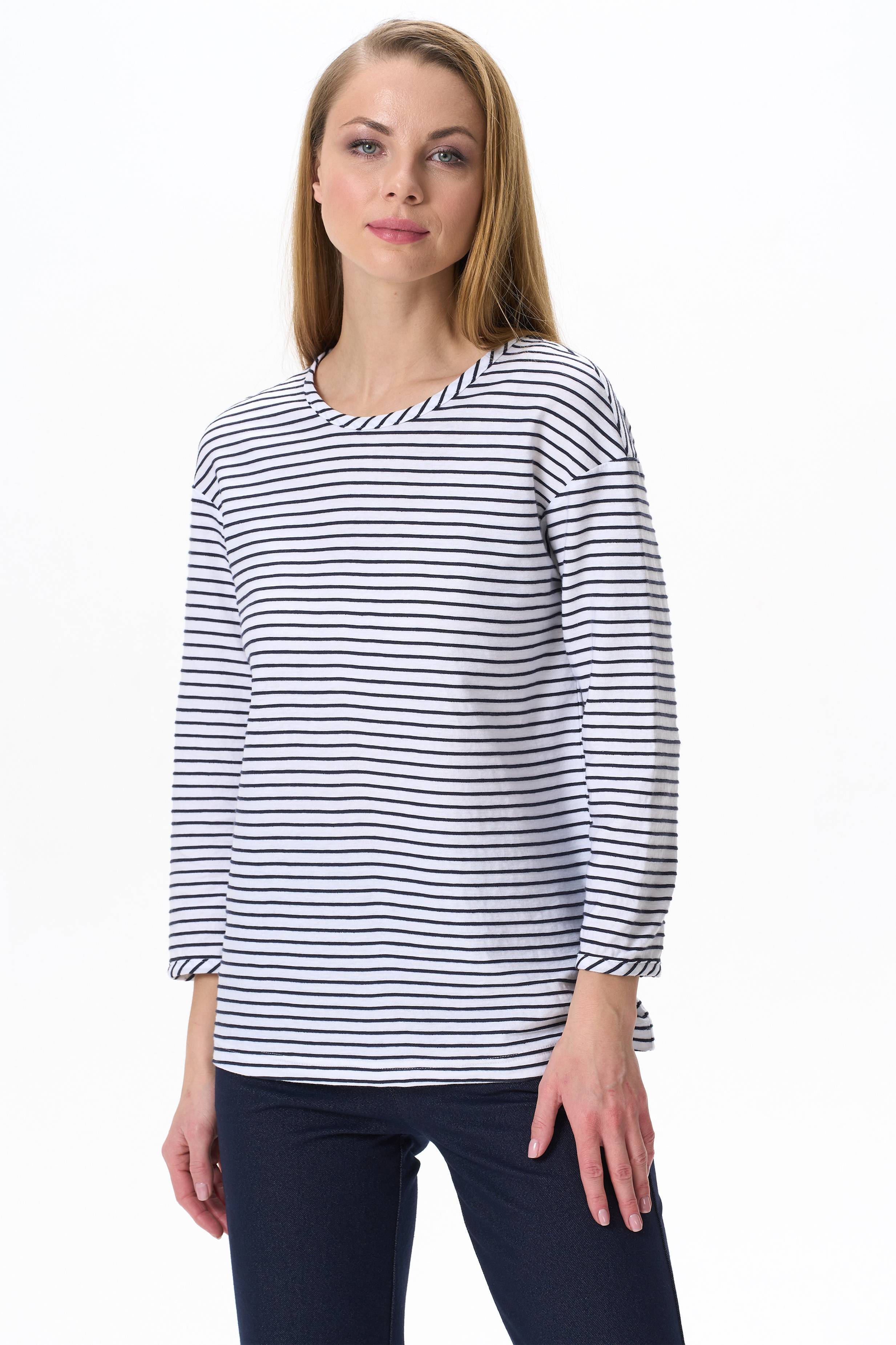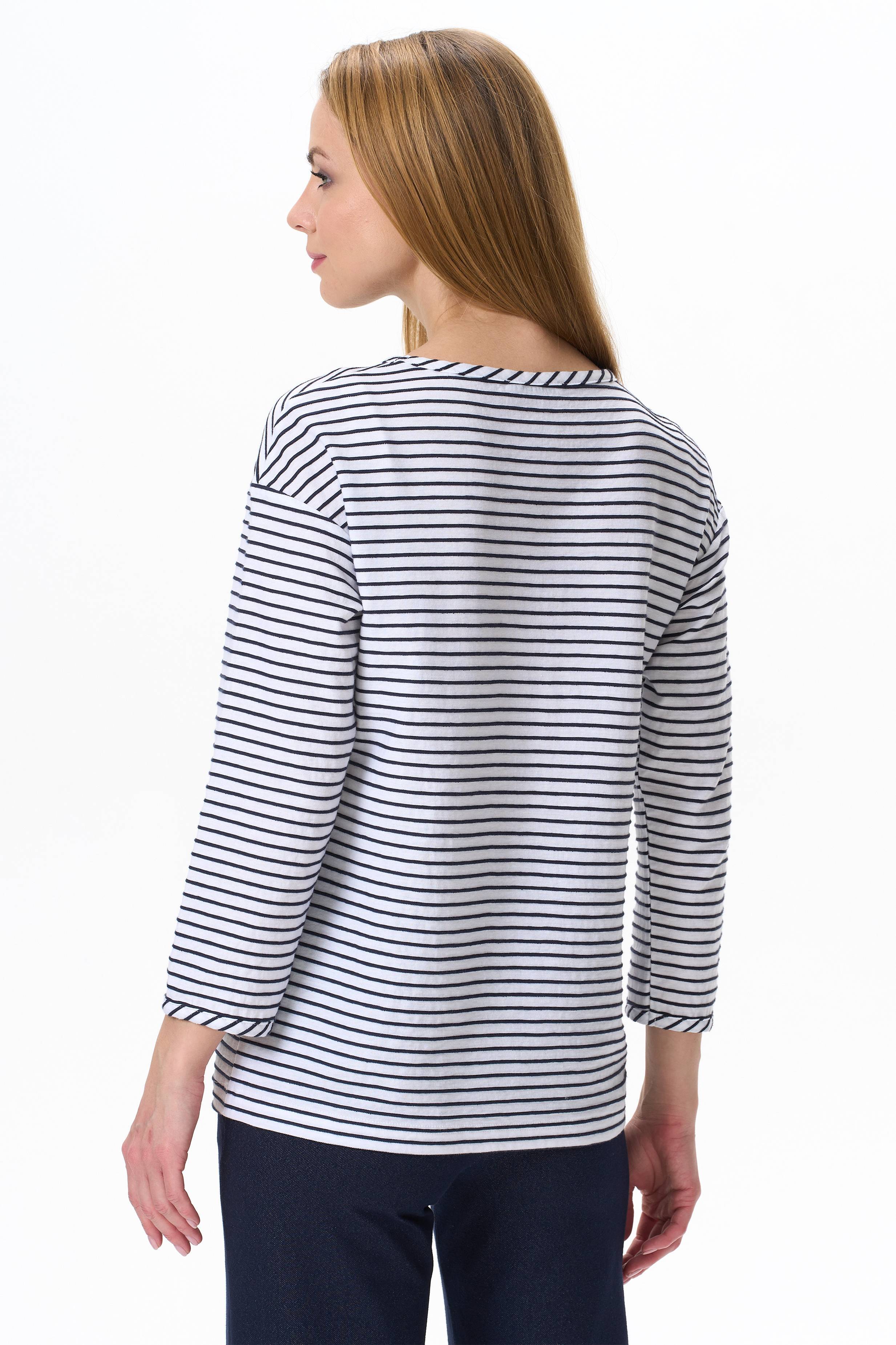 Джемпер из вязанного хлопкового полотна с рельефной фактурой. Круглая форма горловины, спущенная линия плеча, рукава чуть укорочены. Рост модели на фото 177.