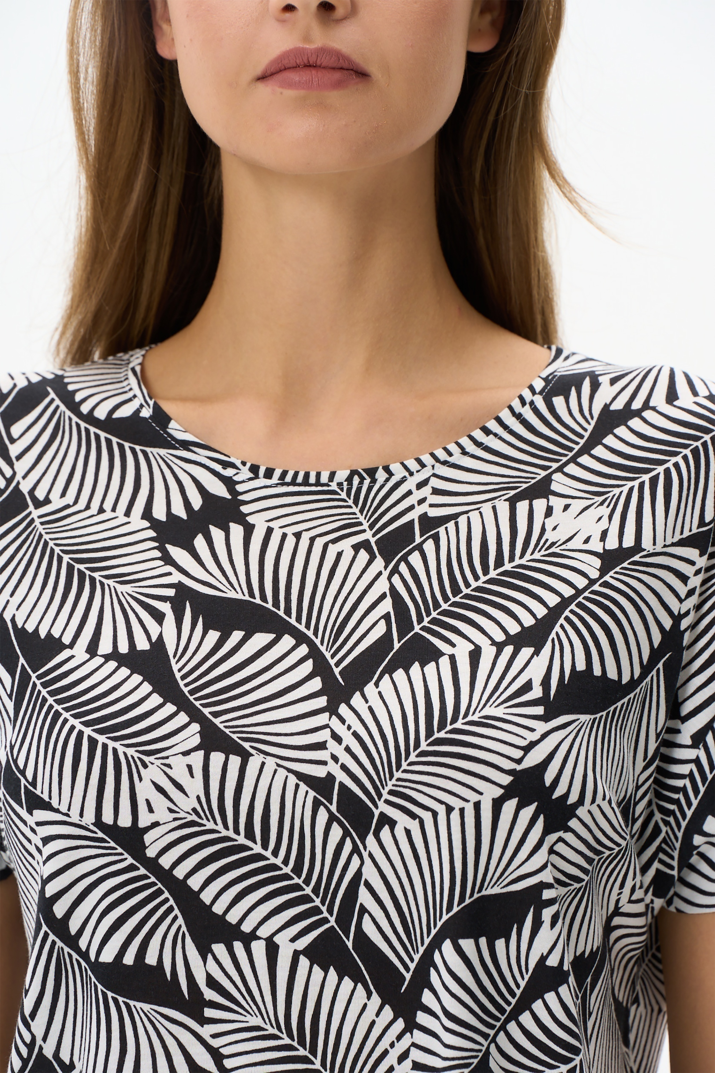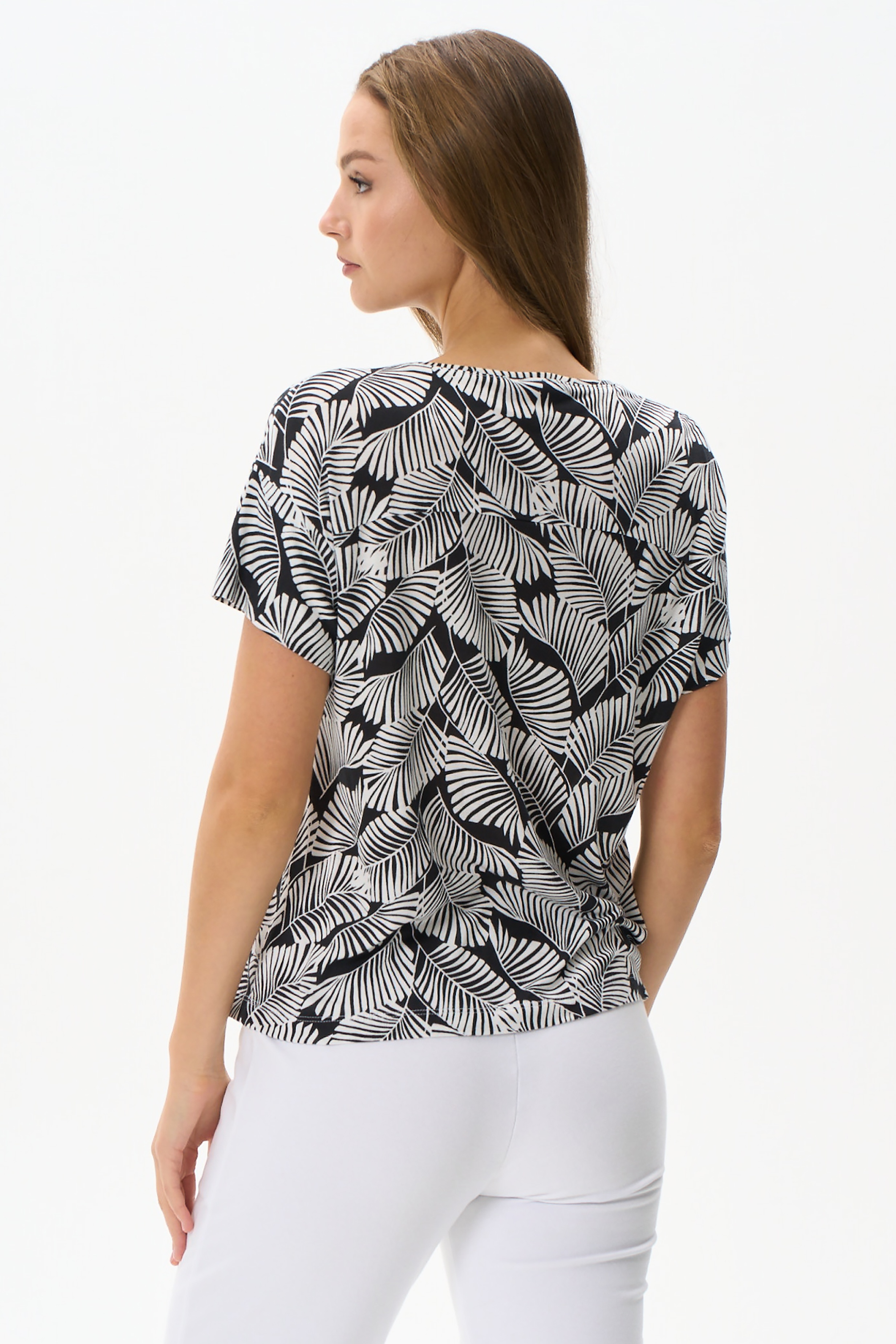 Блузка свободного силуэта из вискозного трикотажного полотна. Круглый вырез горловины, втачные короткие рукава. Рост модели на фото 177см.