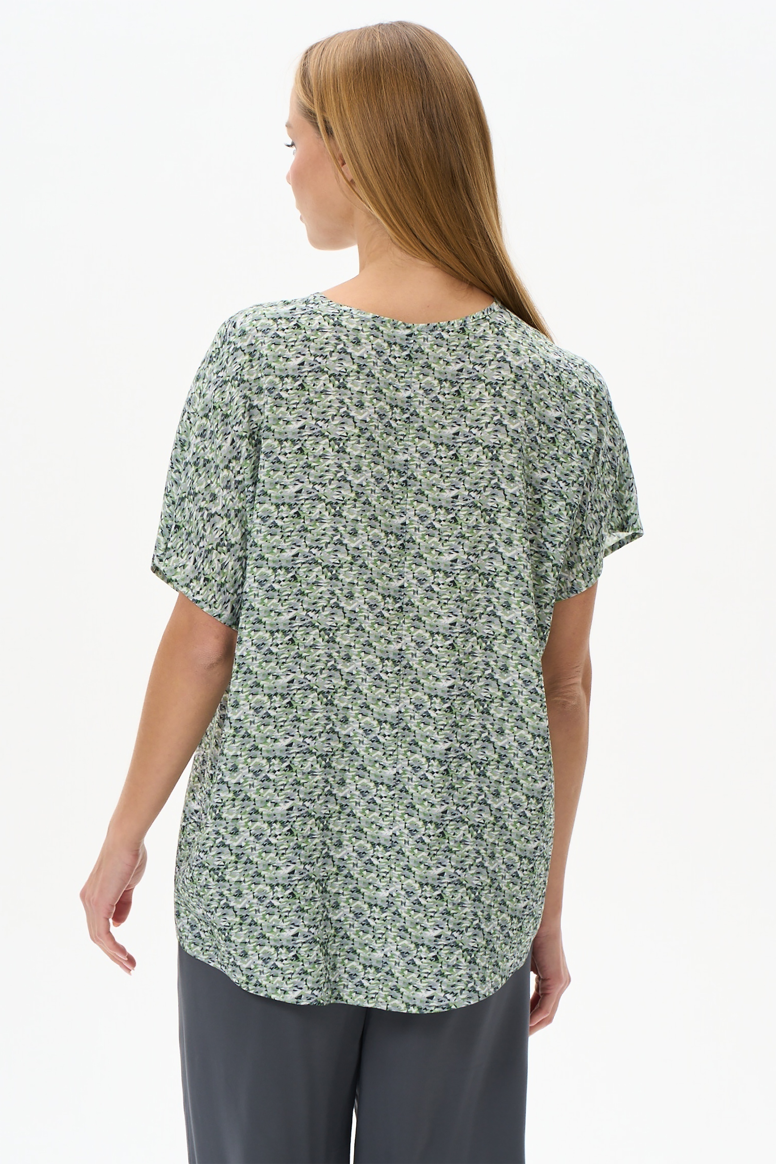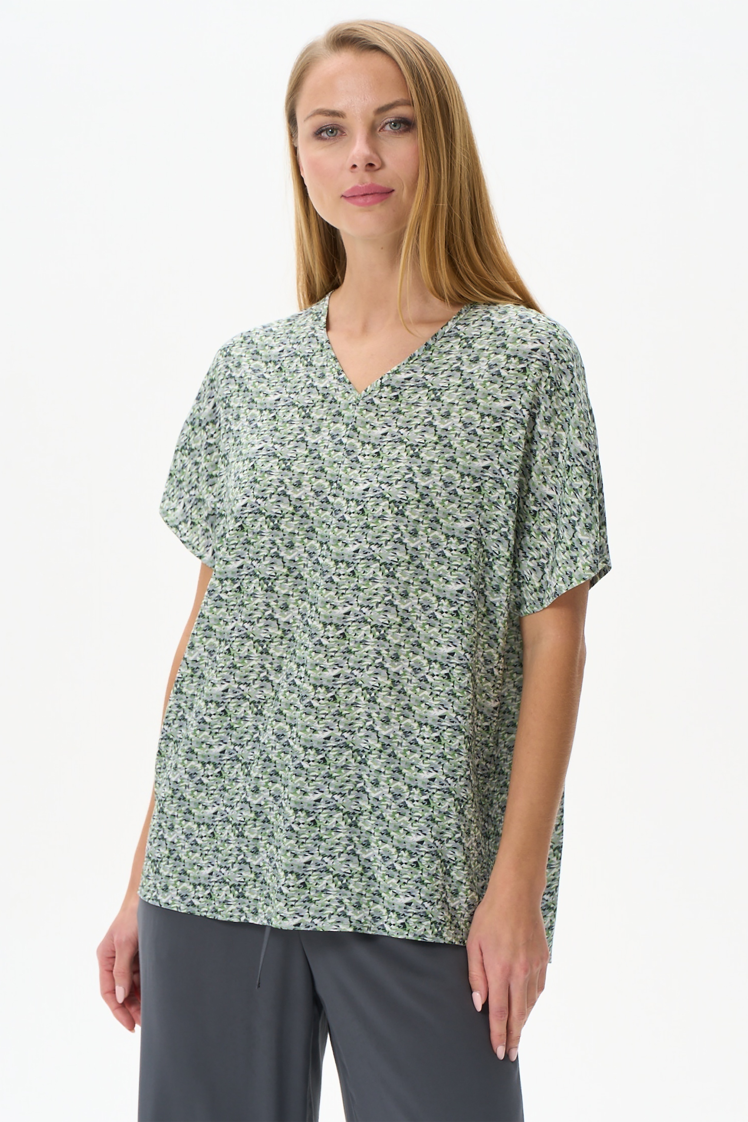 Легкая свободная блузка из штапеля. V-образный вырез горловины. Цельнокроенные короткие рукава. Рост модели на фото 177