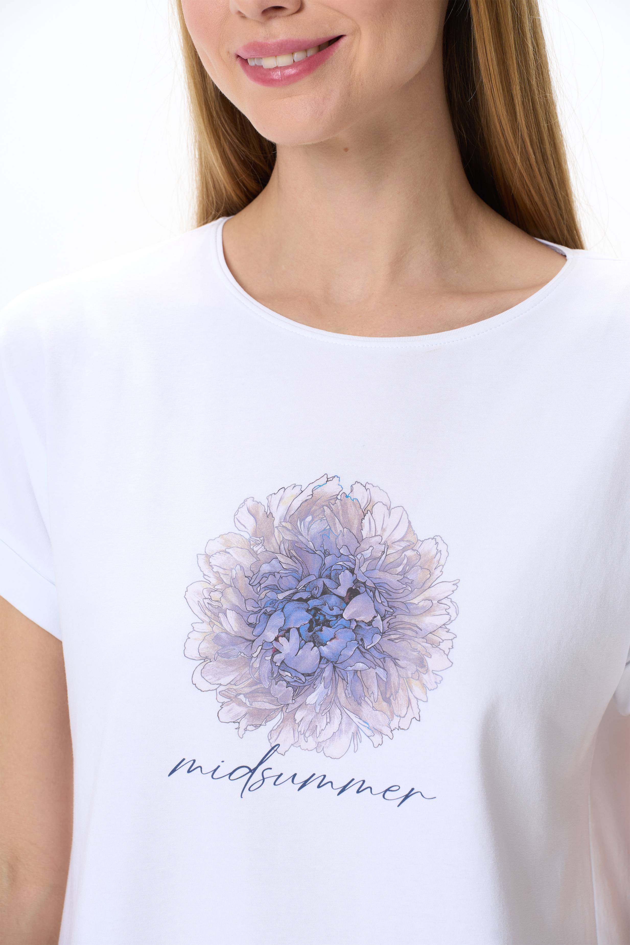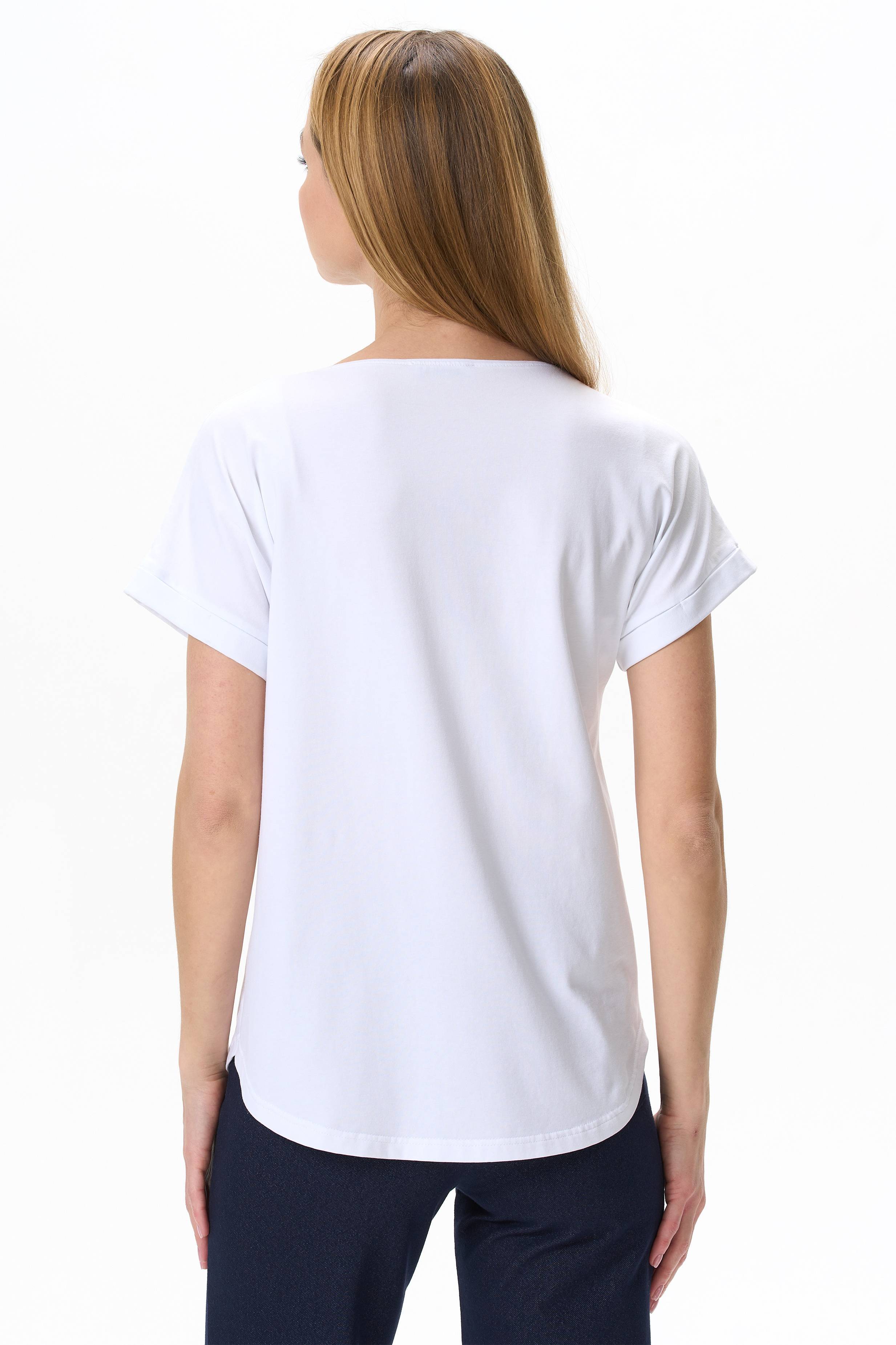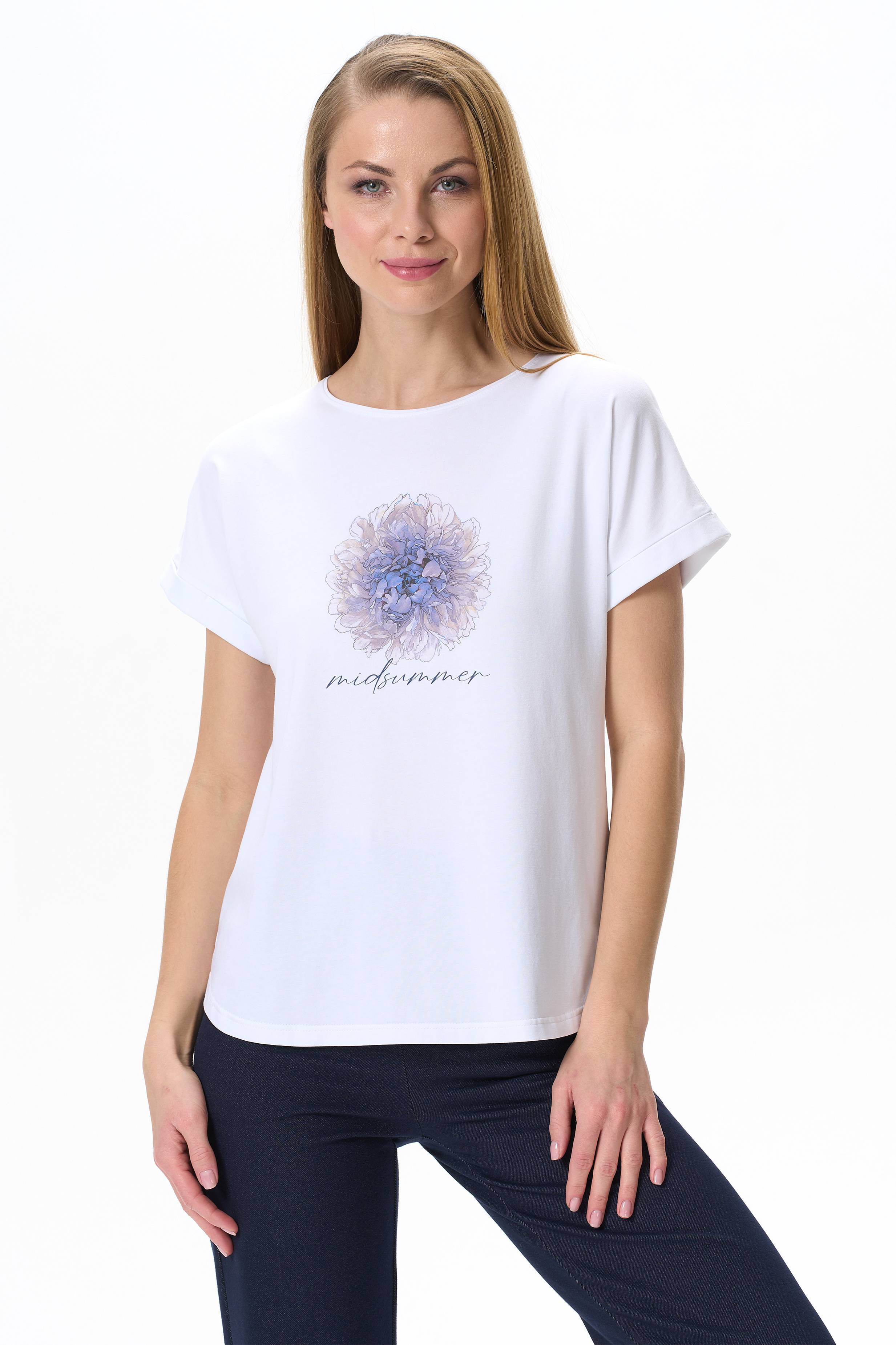 Футболка с принтом из хлопкового полотна с эластаном. Круглый вырез горловины, цельнокроеные короткие рукава с отворотами, фигурная линия низа. Рост модели на фото 177.