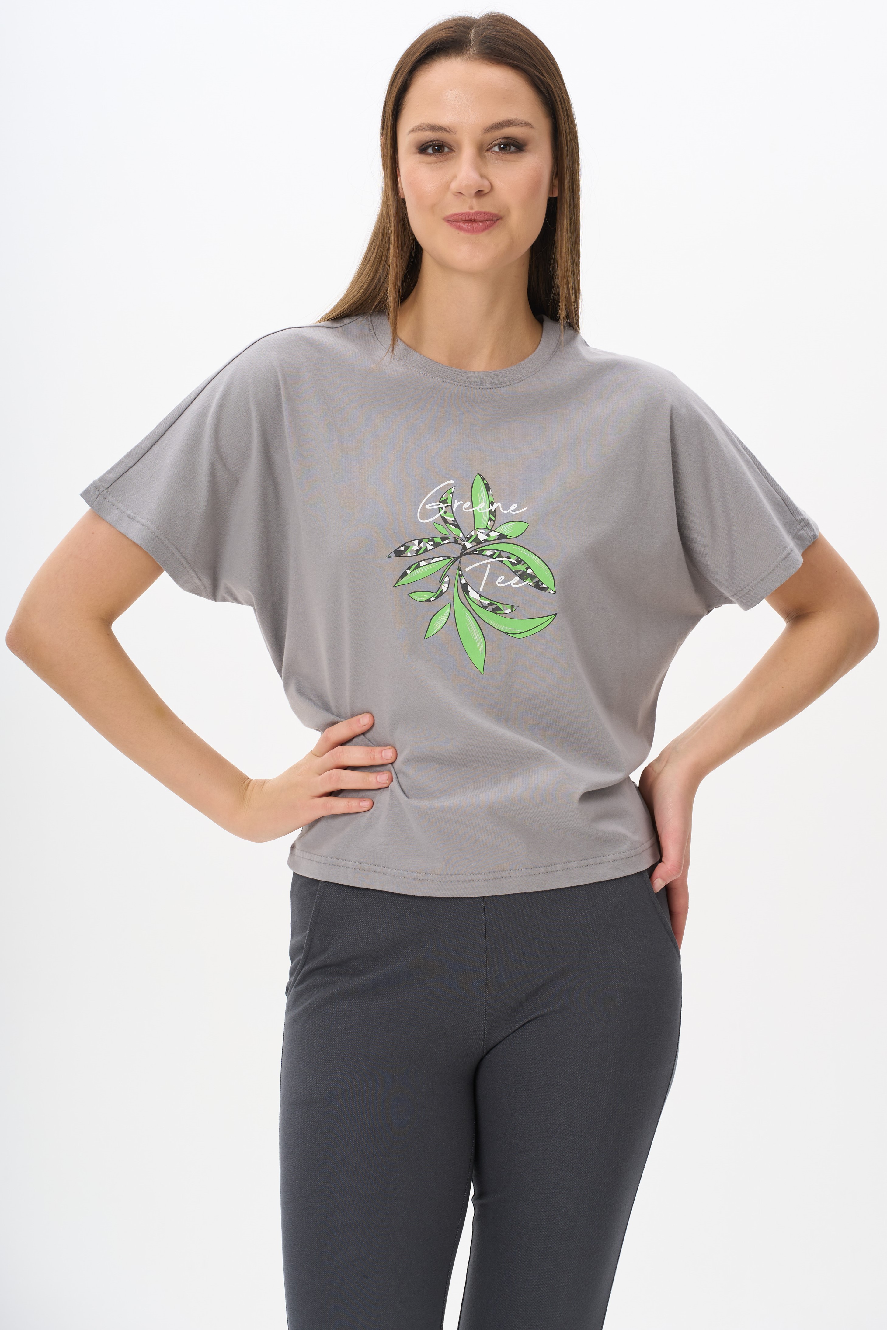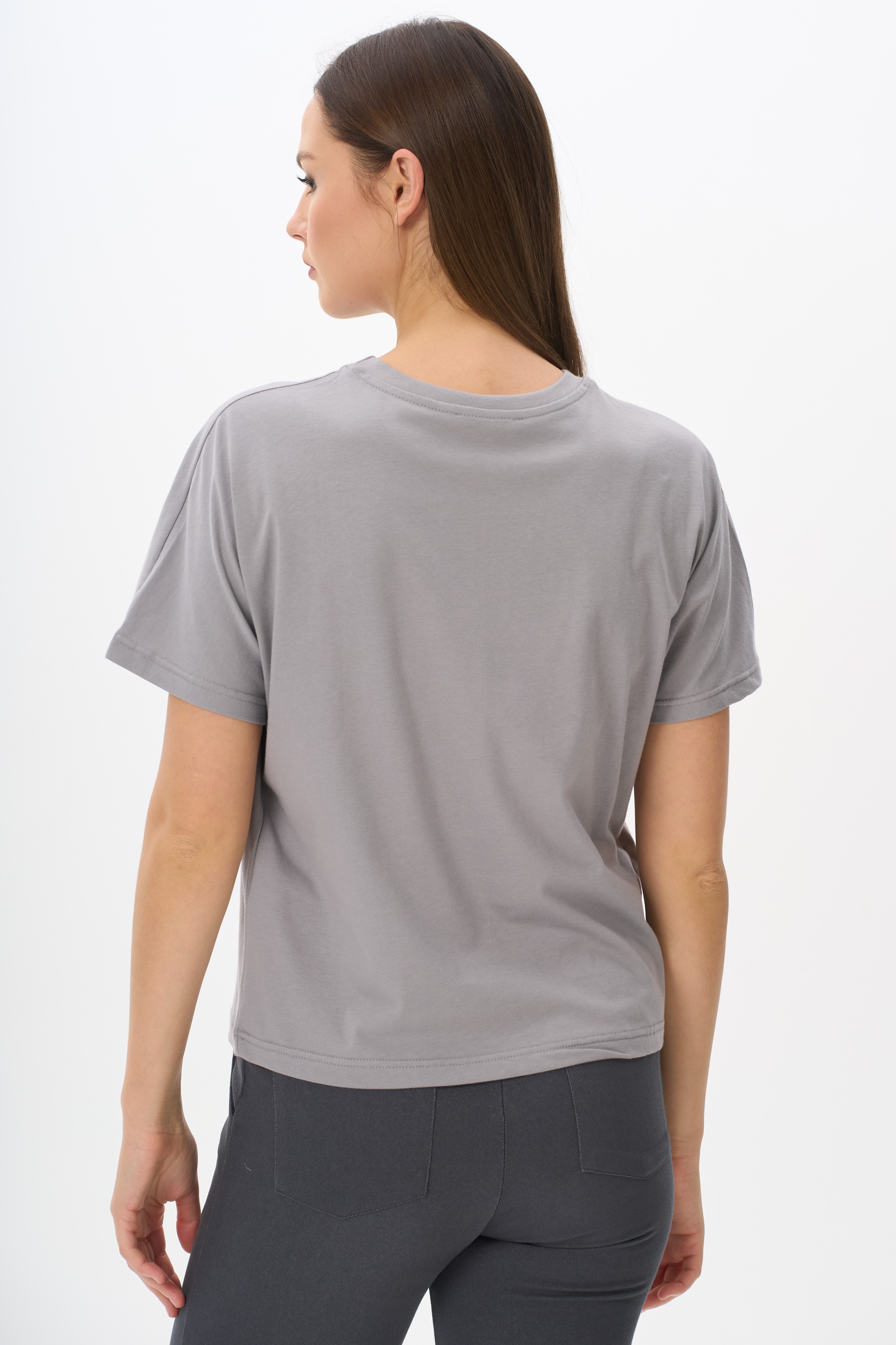 Укороченная футболка с цельнокроенным рукавом из хлопкового полотна ПЕ. Круглый вырез горловины обработан рибаной. Рост модели на фото 177.