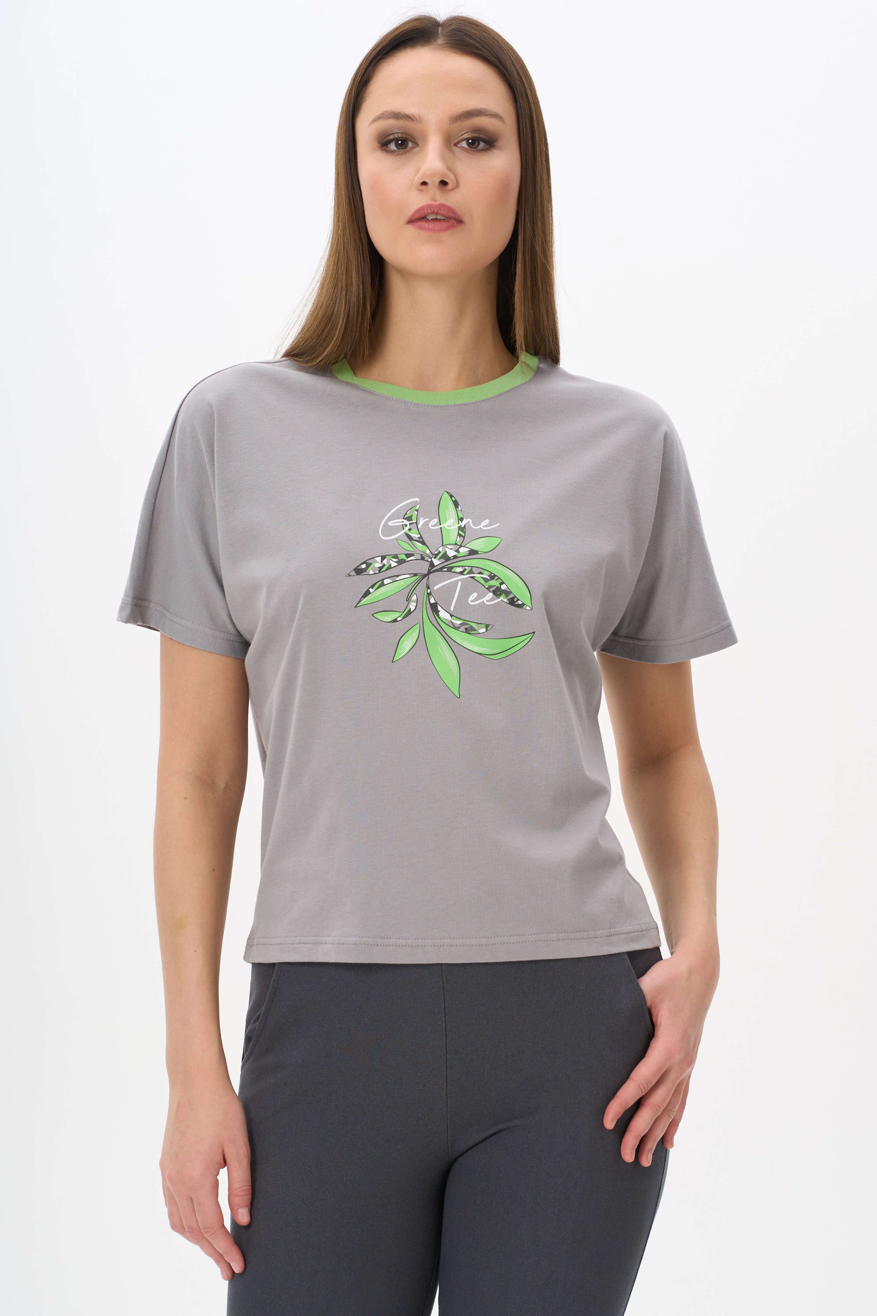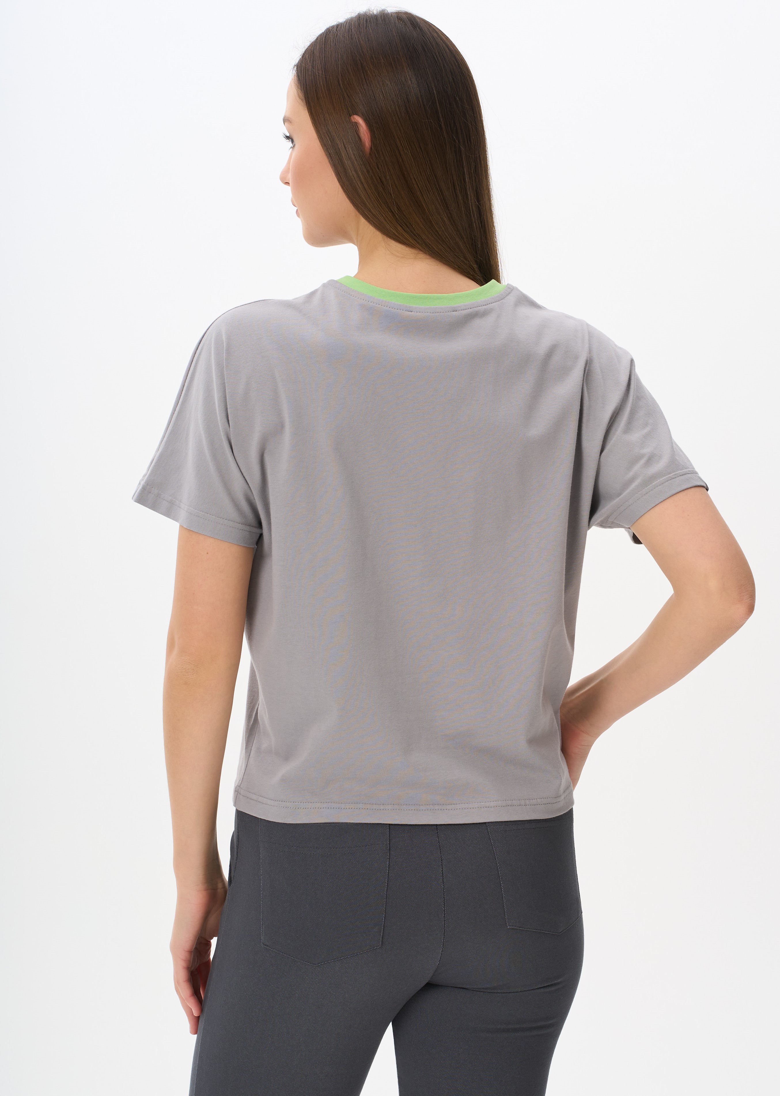 Укороченная футболка с цельнокроенным рукавом из хлопкового полотна ПЕ. Круглый вырез горловины обработан рибаной. Рост модели на фото 177.