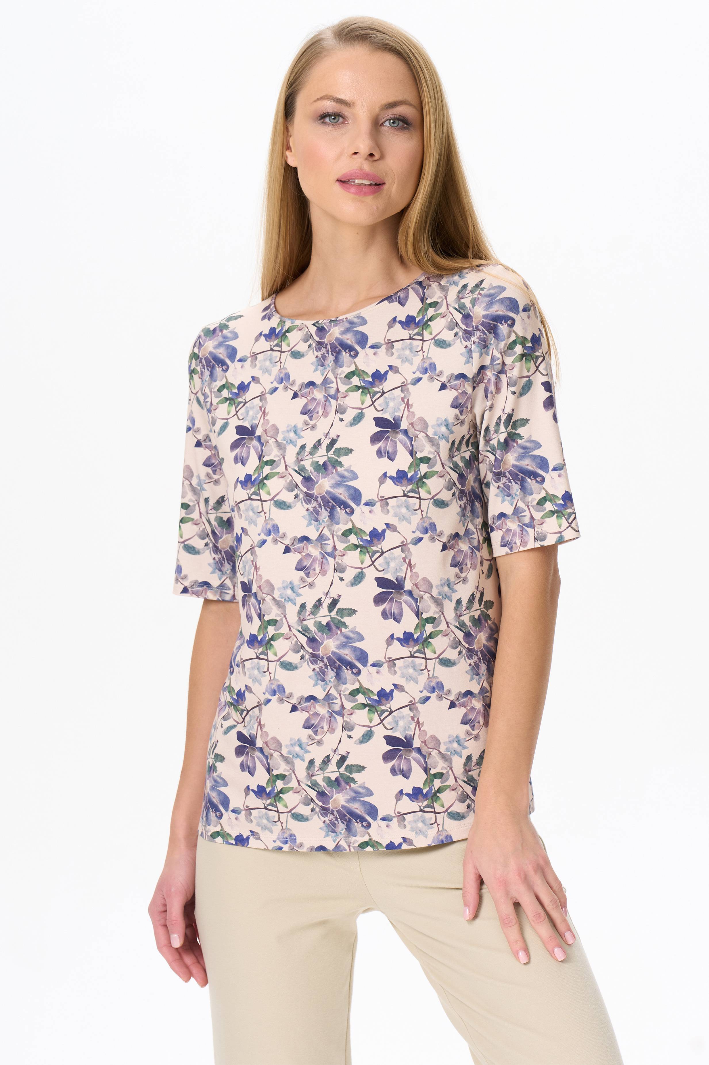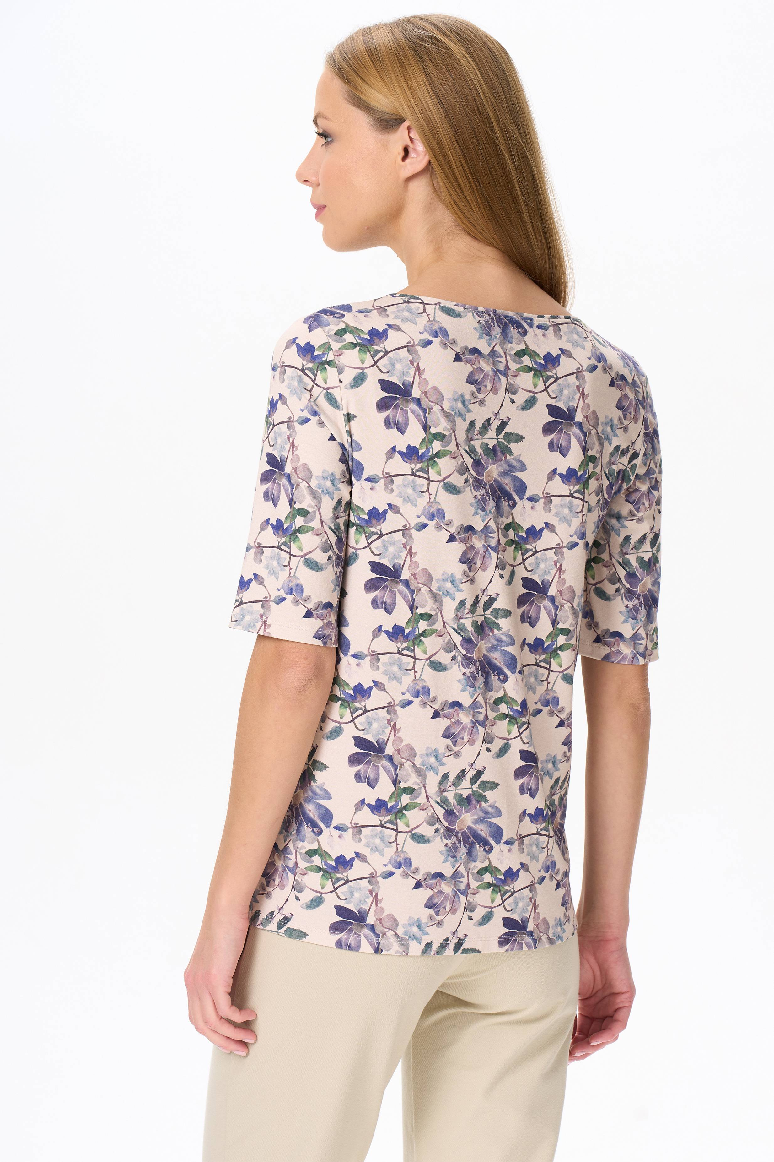 Блузка из вискозного трикотажного полотна с эластаном. Круглая форма горловины, втачные рукава, длинной до локтя. Рост модели 177см.