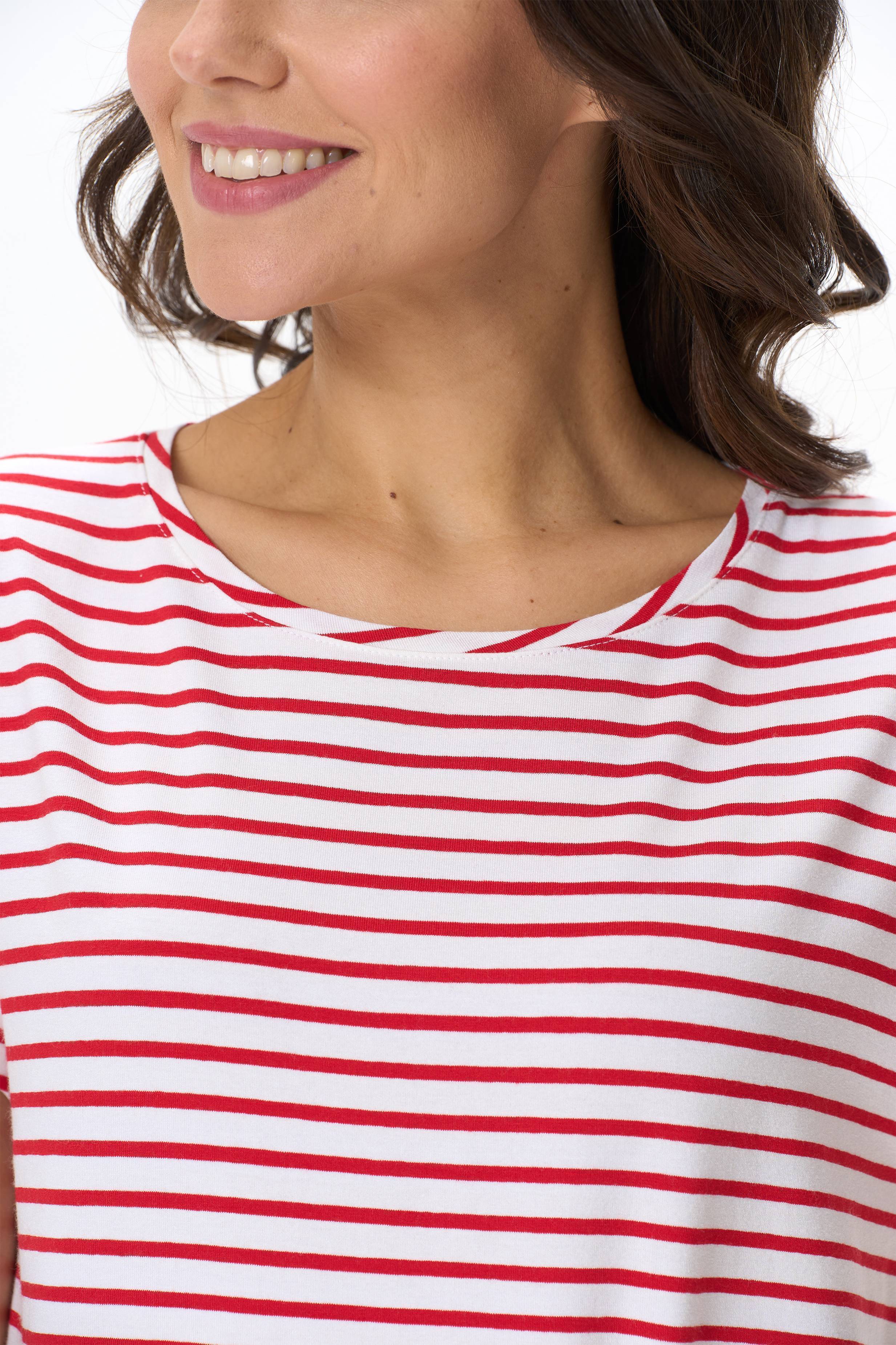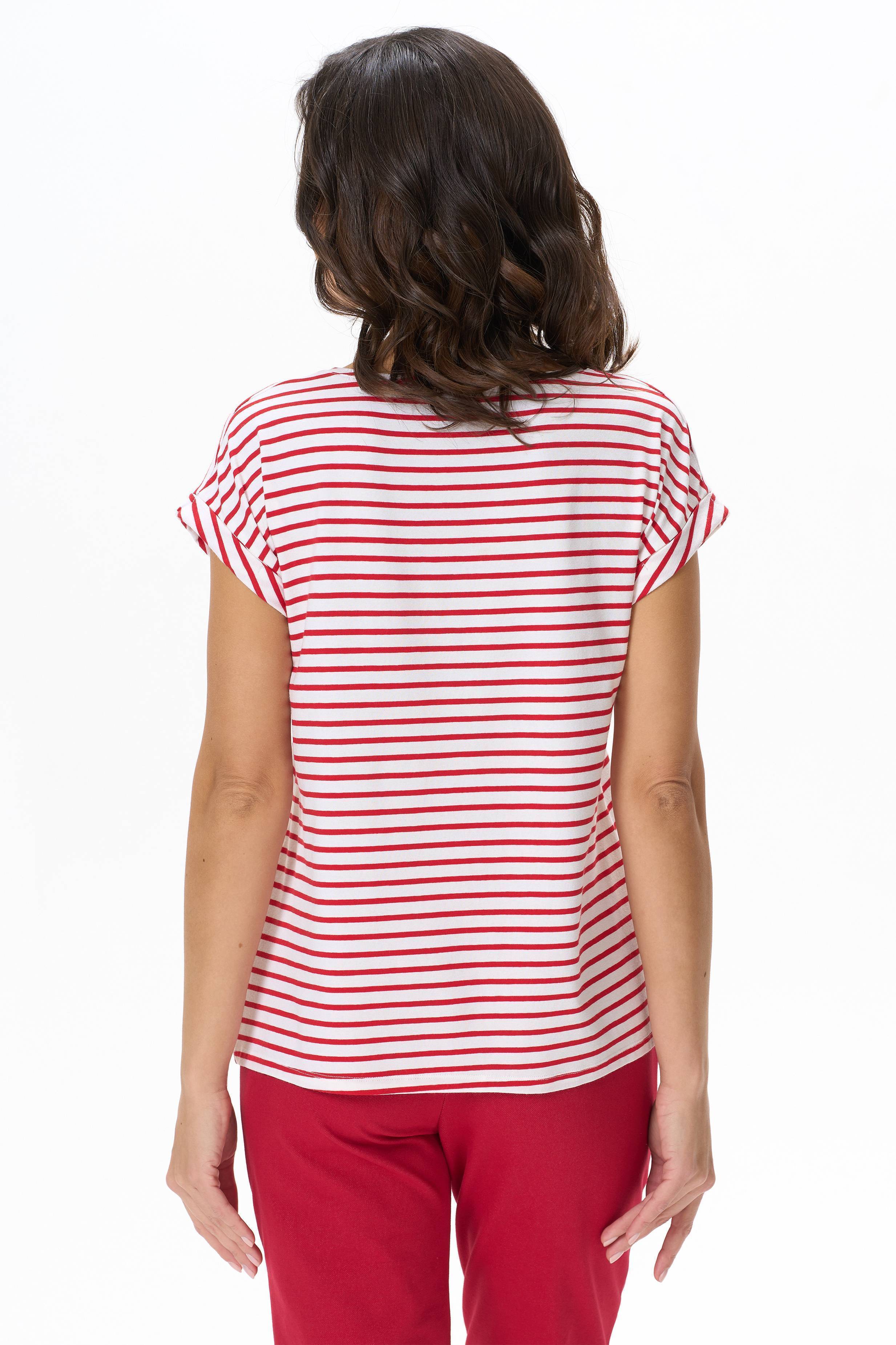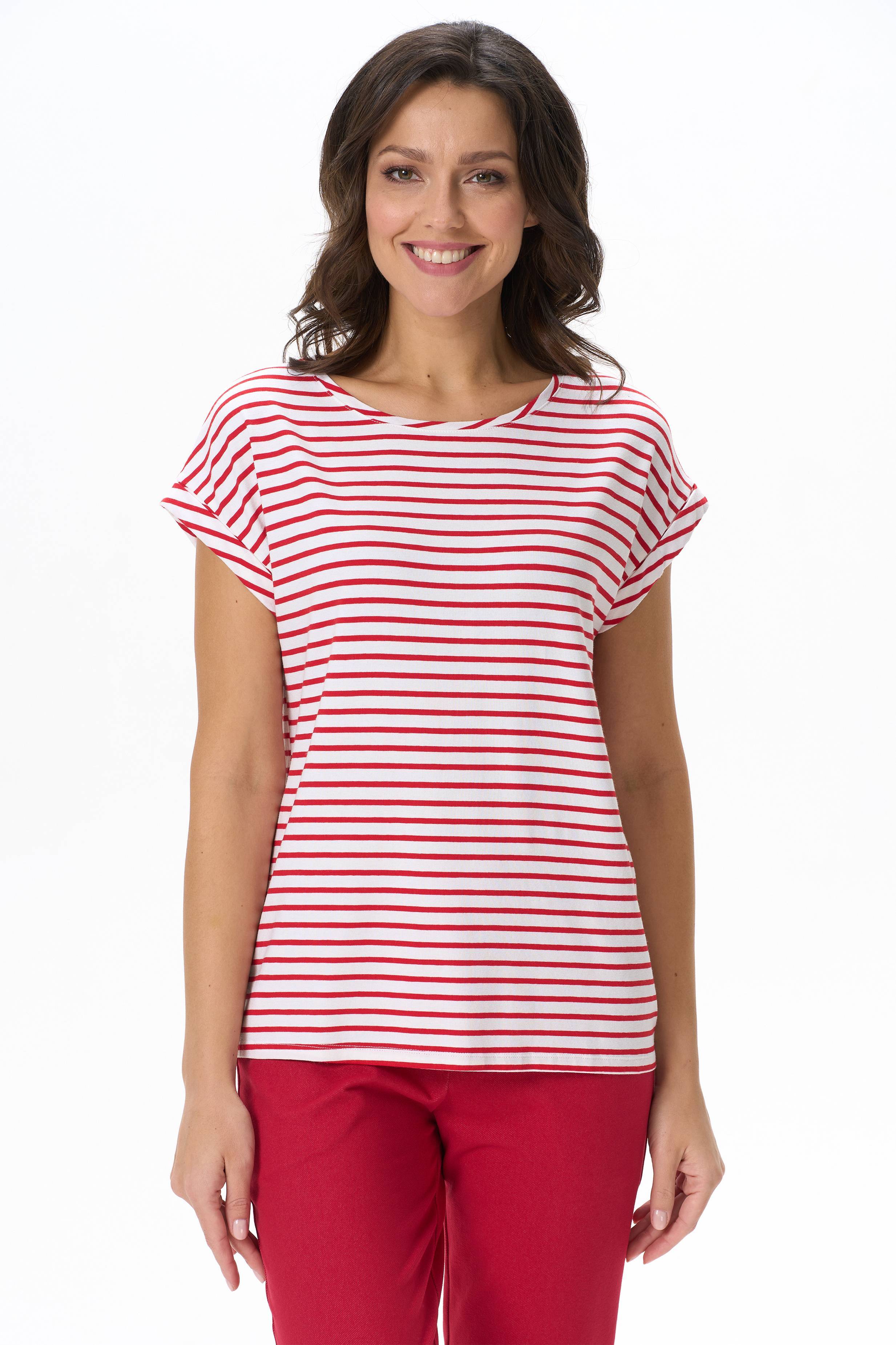 Футболка из вискозного полотна. Модель с круглым вырезом горловины и цельнокроеным коротким рукавом с отворотами. Рост модели на фото 177см.