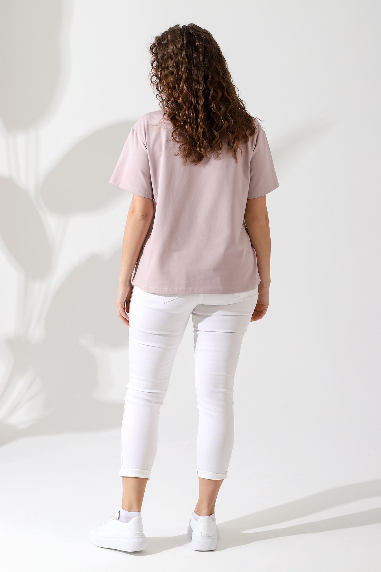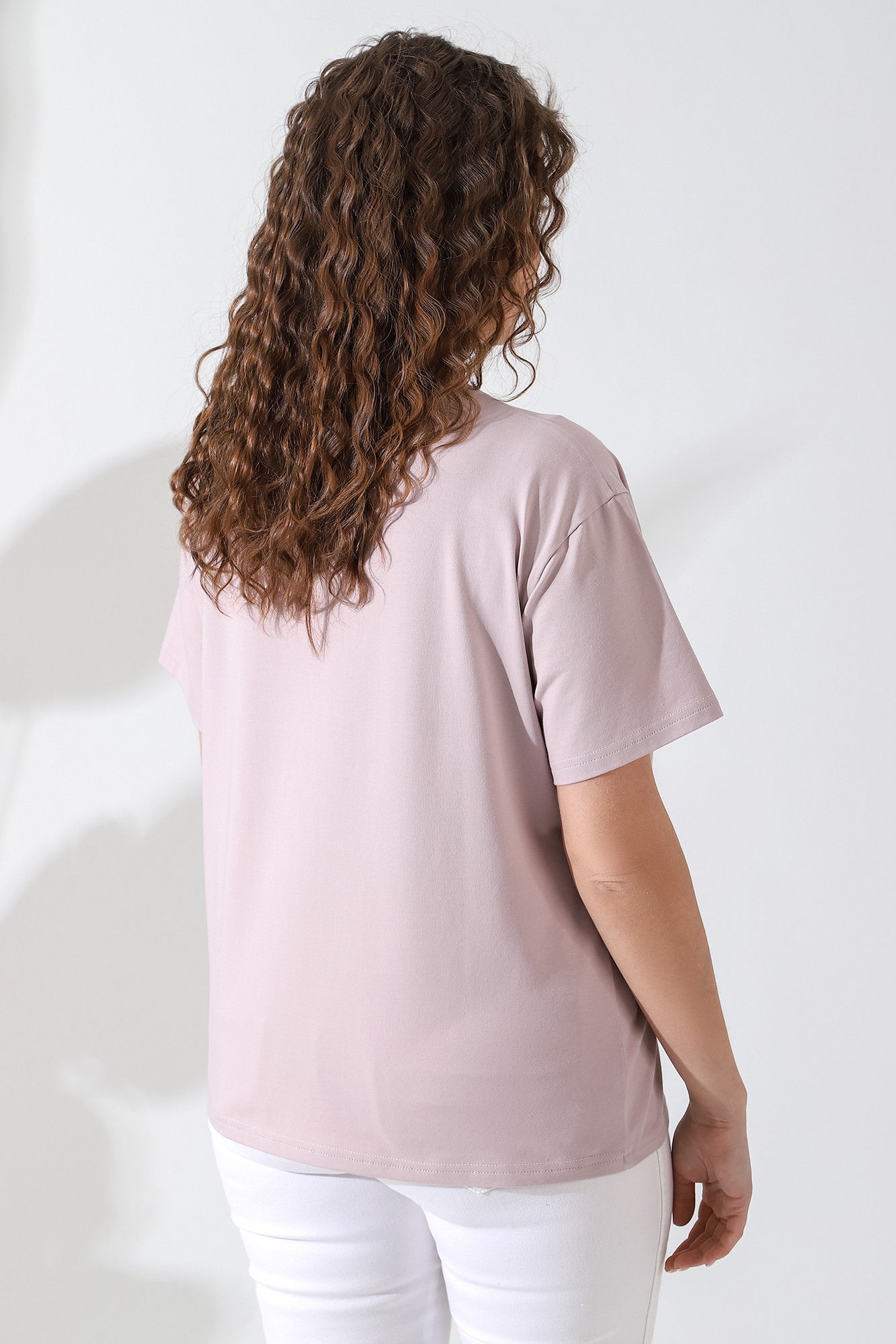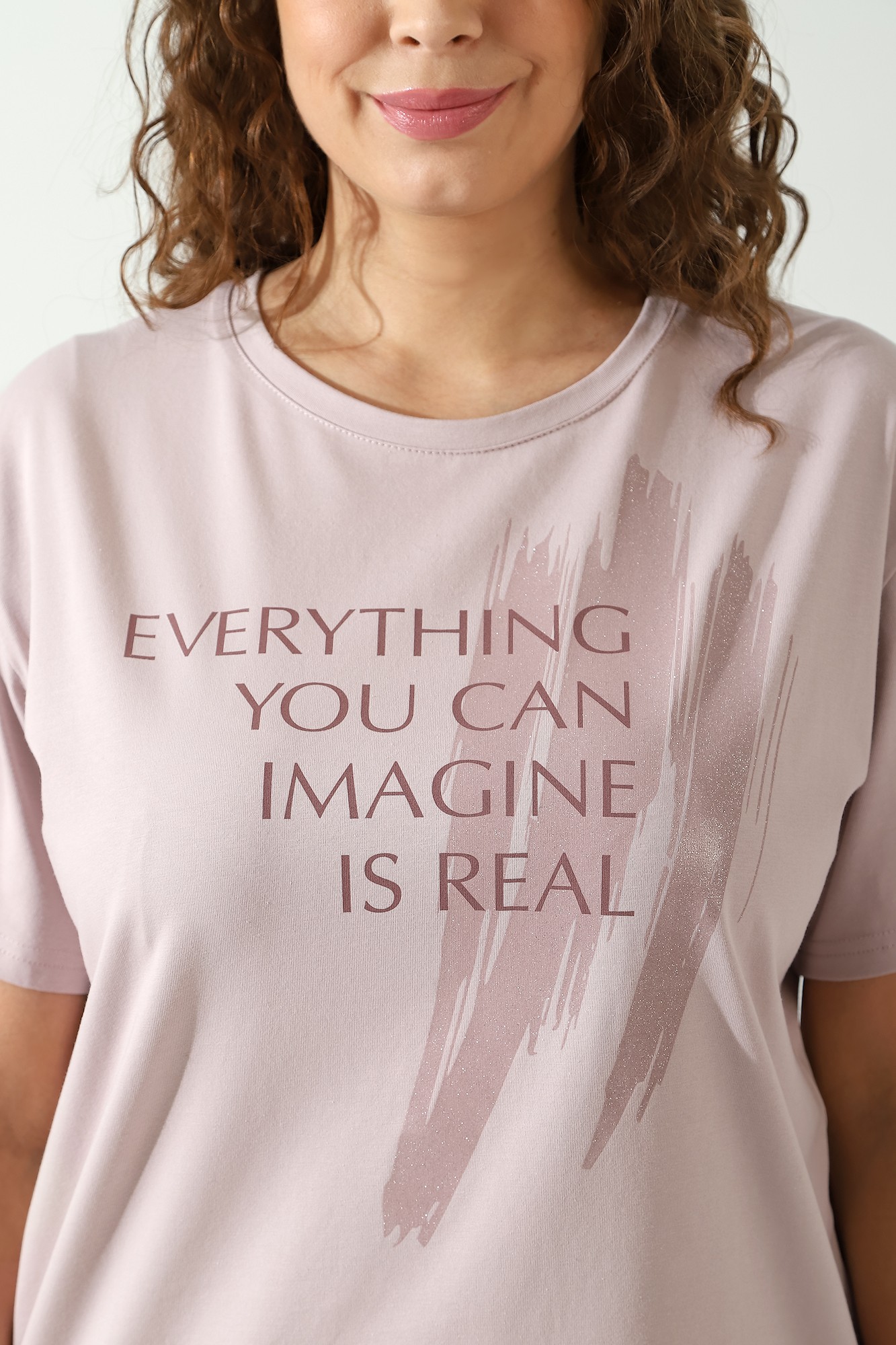 Футболка женская из гладкокрашеного трикотажного полотна «кулирка с лайкрой», классического покроя, с короткими втачными рукавами, горловиной овальной формы, обработанной втачной планкой, и принтом на полочке, выполненным в технике шелкографии.