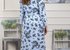 Халат женский из трикотажного полотна «кулирка» с набивным рисунком, на запахе, с втачными длинными рукавами, съемным поясам, продетым в две шлевки, вставленные в боковые швы на уровне линии талии, и разрезами в боковых швах. На правой полочке на уровне бедер – накладной карман прямоугольной формы. Борта и горловина обработаны притачной планкой. Верхний срез кармана и нижние срезы рукавов отделаны кружевом.