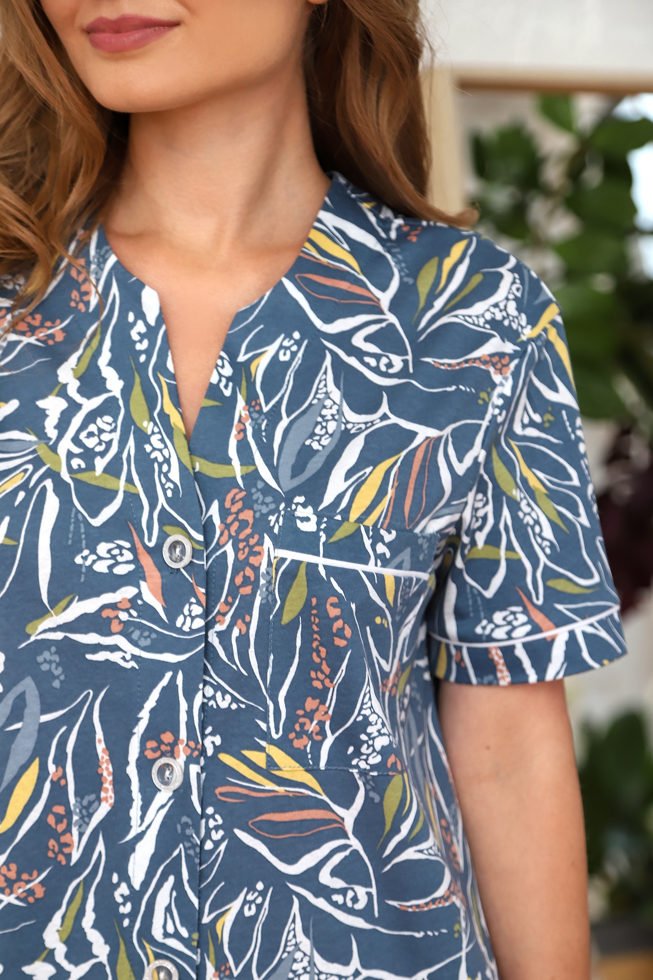 Халат молодежный из трикотажного полотна «кулика» с набивным рисунком, прямого силуэта, с короткими втачными рукавами на притачных манжетах, карманами в боковых швах, нагрудным карманом на лево полочке, фигурной линией низа и центральной бортовой застежкой на петли и пуговицы. Нагрудный карман и манжеты рукавов обработаны с кантом в соединительных швах. Входы карманов окантованы двойным кантом. Спинка – с притачной кокеткой и бантовой складкой в соединительном шве.