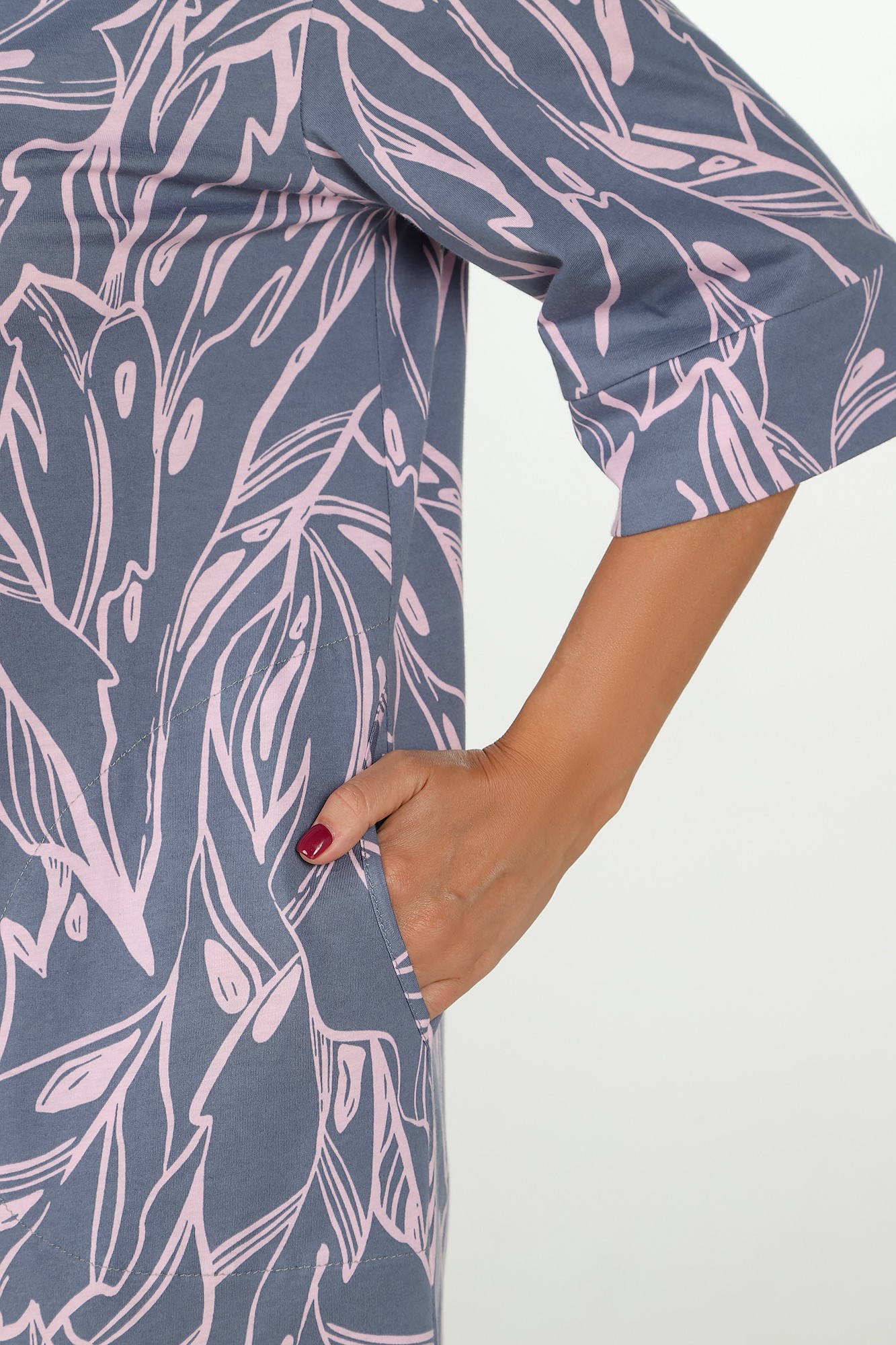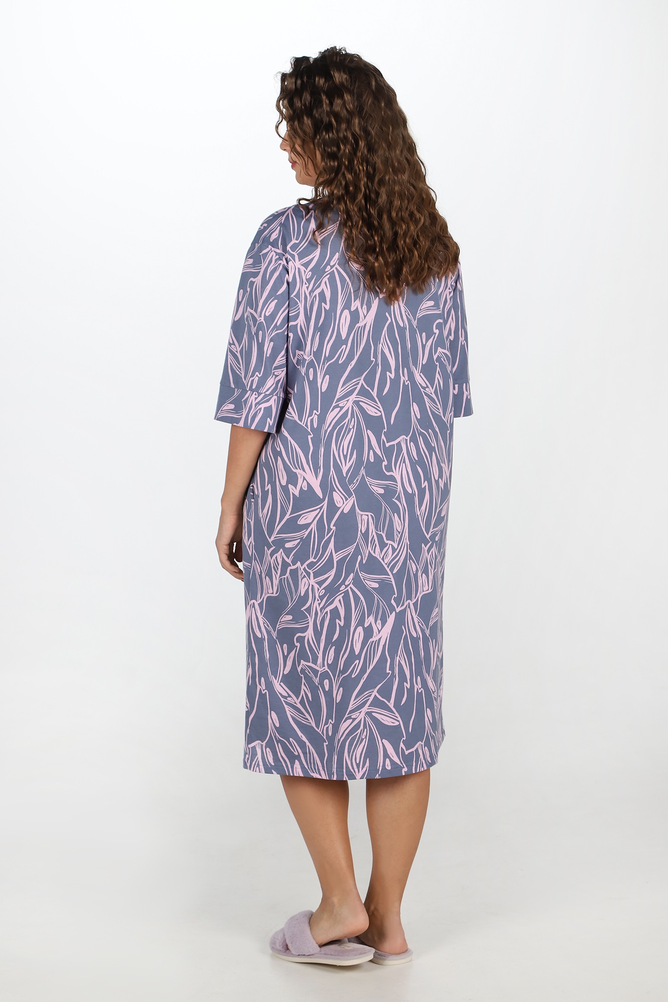 Халат женский из трикотажного полотна «кулирка» с набивным рисунком, прямого силуэта, с короткими втачными рукавами, V- образной горловиной, карманами в боковых швах и центральной бортовой застежкой на тесьму «молния». Горловина и входы в карманы окантованы основным материалом, на рукавах притачные манжеты.