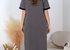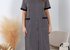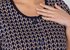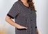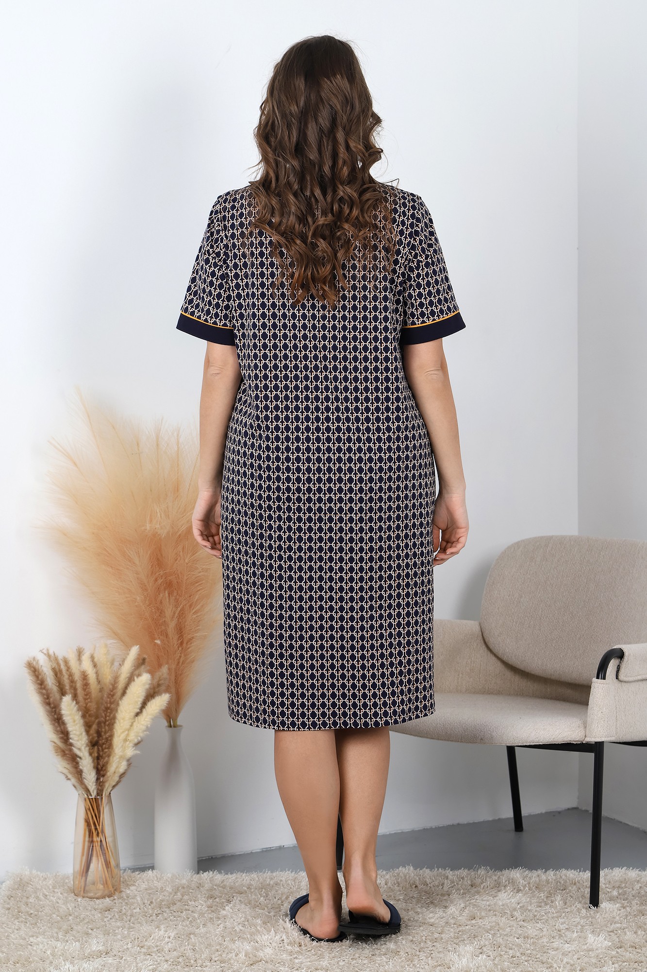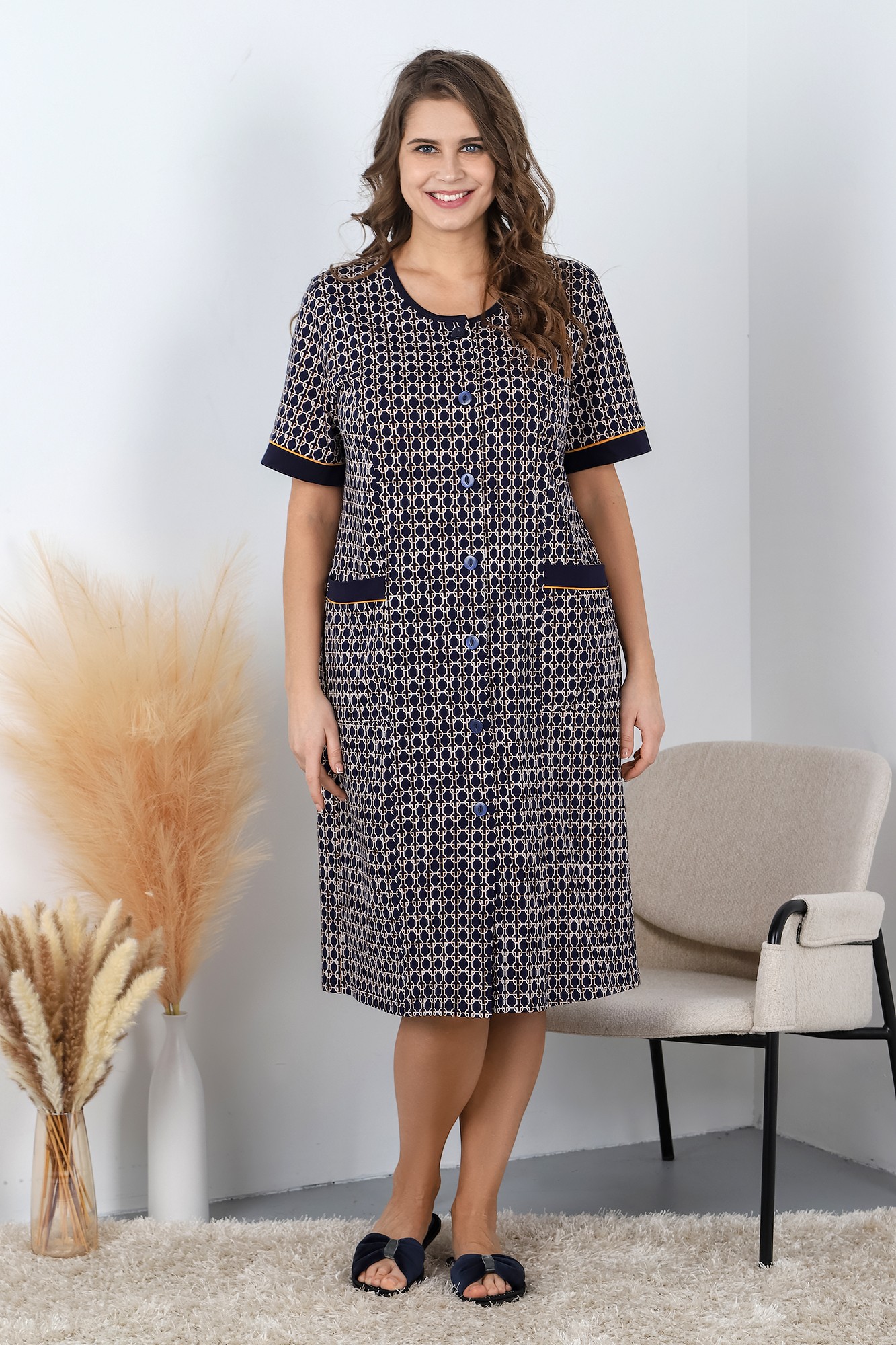 Халат женский из трикотажного полотна «кулика» с набивным рисунком, прямого силуэта, с короткими втачными рукавами, с горловиной овальной формы, окантованной основным материалом, с рельефами, выходящими из пройм, двумя накладными карманами на уровне бедер и центральной бортовой застежкой на обметанные петли и пуговицы. Нижние срезы рукавов обработаны притачными манжетами, верхние срезы карманов – с притачными планками. В швах соединения манжет и планок с деталями – узкий кант контрастного цвета.