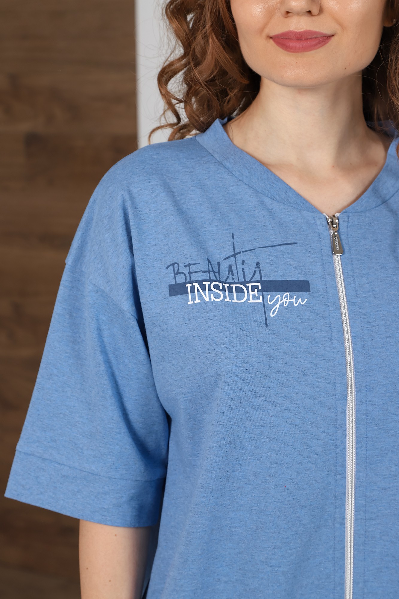Халат молодежный из гладкокрашенного трикотажного полотна «кулирка» с меланжированным эффектом, прямого силуэта, горловиной овальной формы, втачными короткими рукавами, карманами в боковых швах и центральной бортовой застежкой на тесьму «молния». На полочках выполнен принт в технике « шелкографии», рукава обработаны притачными манжетами, горловина притачной планкой.