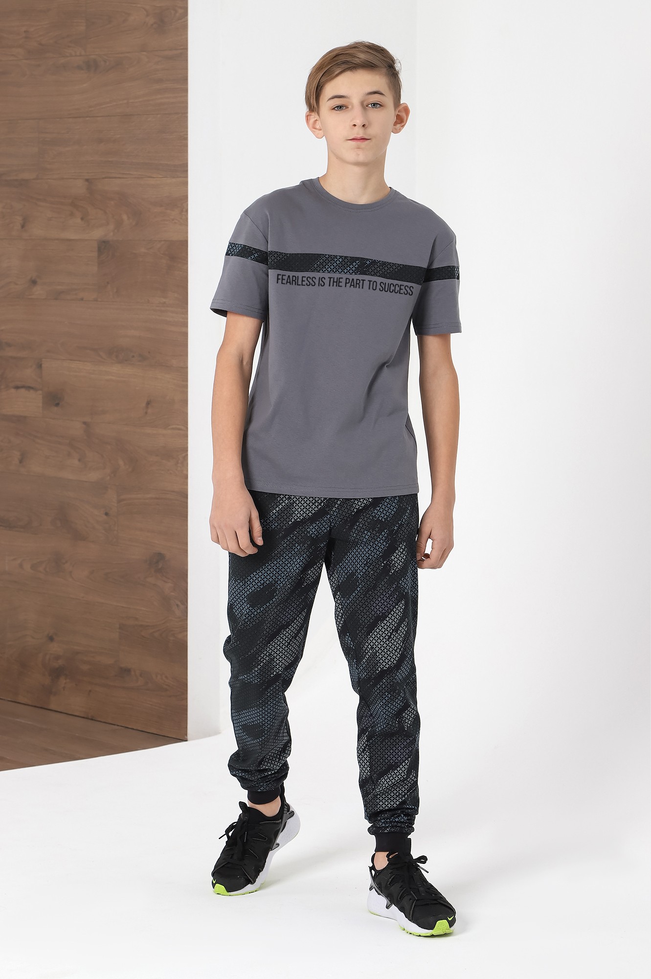 Костюм из хлопчатобумажных трикотажных полотен кулирного переплетения. Футболка с горизонтальными контрастными вставками на груди и рукавах. Брюки из полотна с рисунком эксклюзивного дизайна; модель с карманами, на притачном поясе с отстроченной эластичной тесьмой, с манжетами из рибаны.