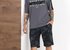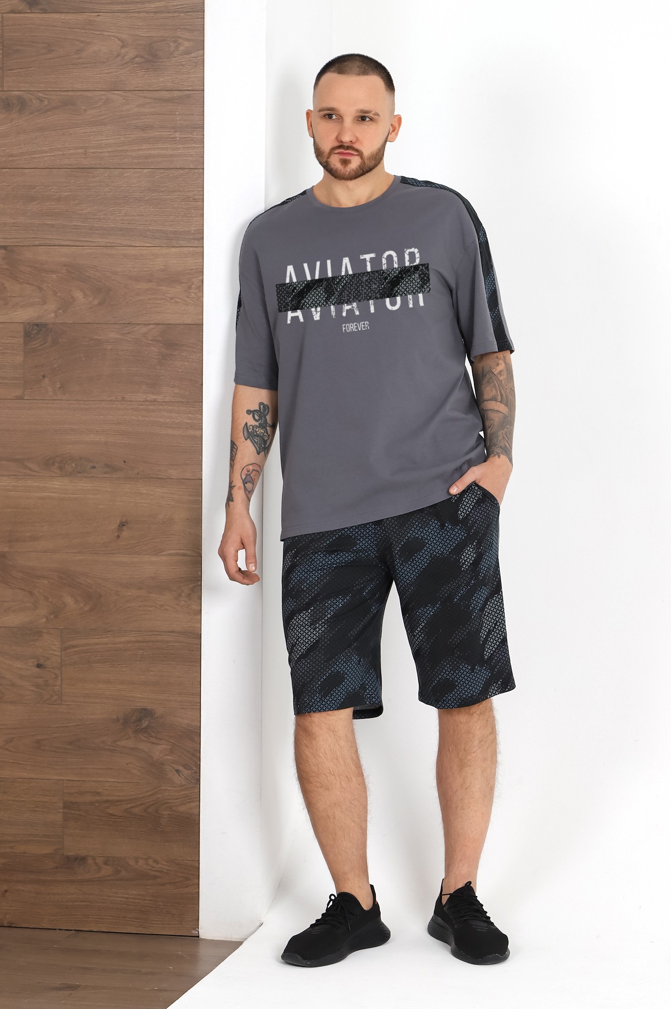 Костюм мужской из хлопчатобумажных трикотажных полотен кулирного переплетения. Футболка с контрастными вставками вдоль линии плеч, с короткими рукавами, с принтом. Шорты из полотна с рисунком эксклюзивного дизайна; модель с карманами, на притачном поясе с отстроченной эластичной тесьмой.