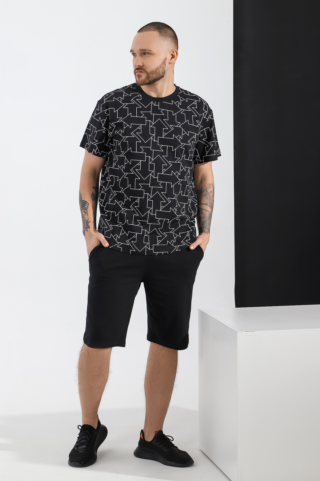 Костюм мужской из кулирки высокого качества. Футболка из полотна двойного крашения; модель с короткими рукавами, горловина обработана деталью из рибаны. Шорты из полотна плотностью 160г/м2; модель с двумя боковыми карманами, на поясе со шнуром и отстроченной эластичной тесьмой.