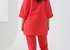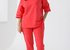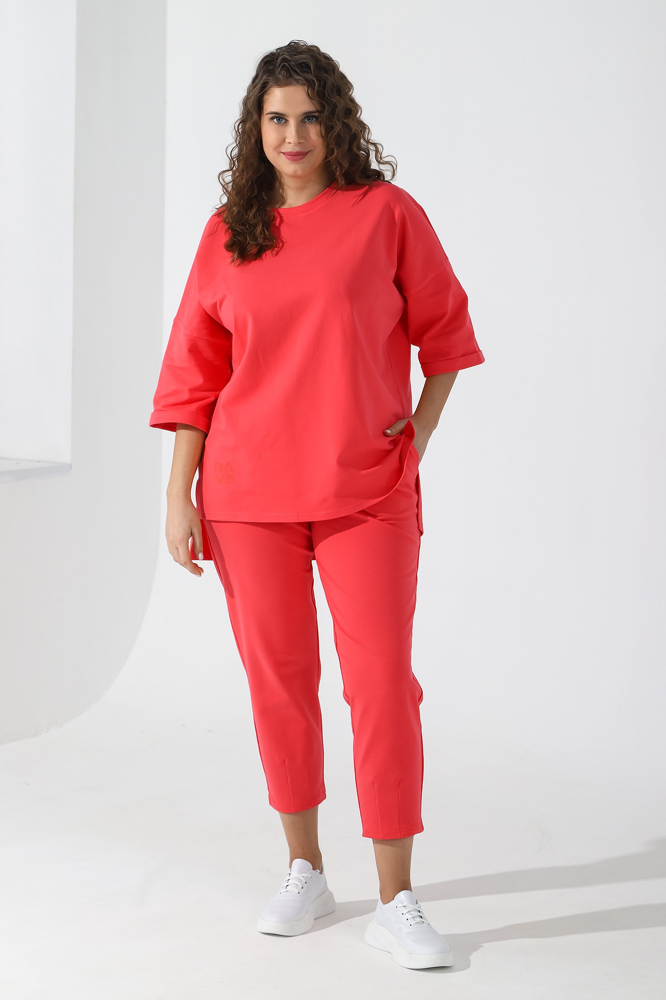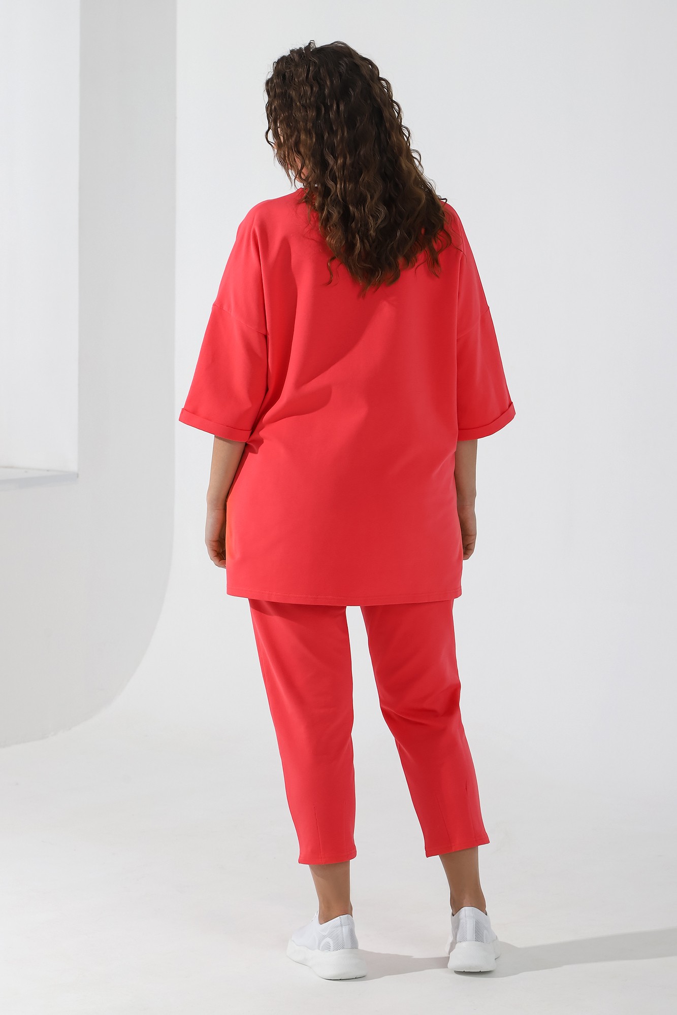 Костюм из гладкокрашеного трикотажного полотна «футер-двунитка», состоящий из джемпера и брюк. Джемпер – свободного покроя, с рукавами на основе цельнокроеных длиной до локтя, горловиной овальной формы, обработанной втачной планкой, разрезами в боковых швах и принтом на полочке. Рукава – с цельнокроеными манжетами-отворотами. Модный элемент- разность длины полочки и спинки на 10 см. Брюки – укороченные, на притачном поясе с эластичной тесьмой внутри и карманами в боковых швах. На нижних частях передних и задних половин обработано по две вертикальные вытачки. Страна производитель Узбекистан