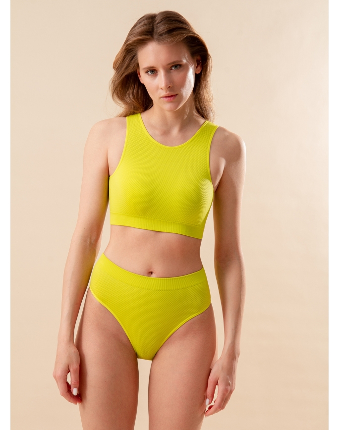 Раздельный купальник от торговой марки Индефини. В комплекте бюстгальтер с плавками. Бюстгальтер-топ зеленого цвета, на широких бретелях выполнен из микрофибры с фактурным плетением в рубчик без боковых швов, дополнен подкладкой и съемными чашками-вкладышами, с уплотненной резинкой по низу топа. Трусы-слипы зеленого цвета, выполнены из микрофибры с фактурным плетением в рубчик без боковых швов, с подкладкой в цвет изделия, с высокой посадкой на мягкой резинке.