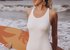 Слитный купальник изготовлен из полиамида и выполнен в классическом белом цвете с фактурной тканью и округлым вырезом на спине. Внутри имеются поролоновые чашки без Push-Up. Широкие бретели сзади носятся крест-накрест.
