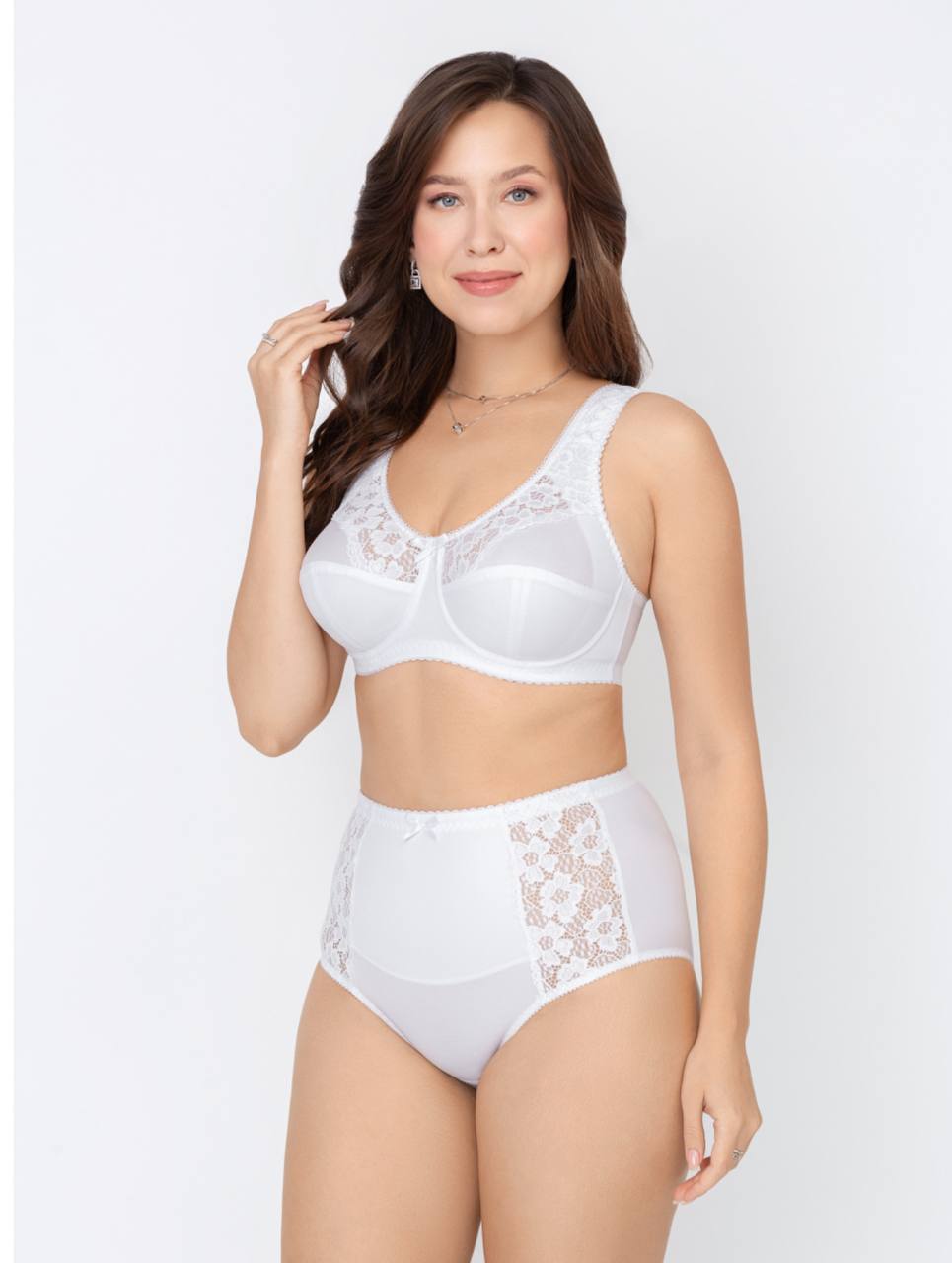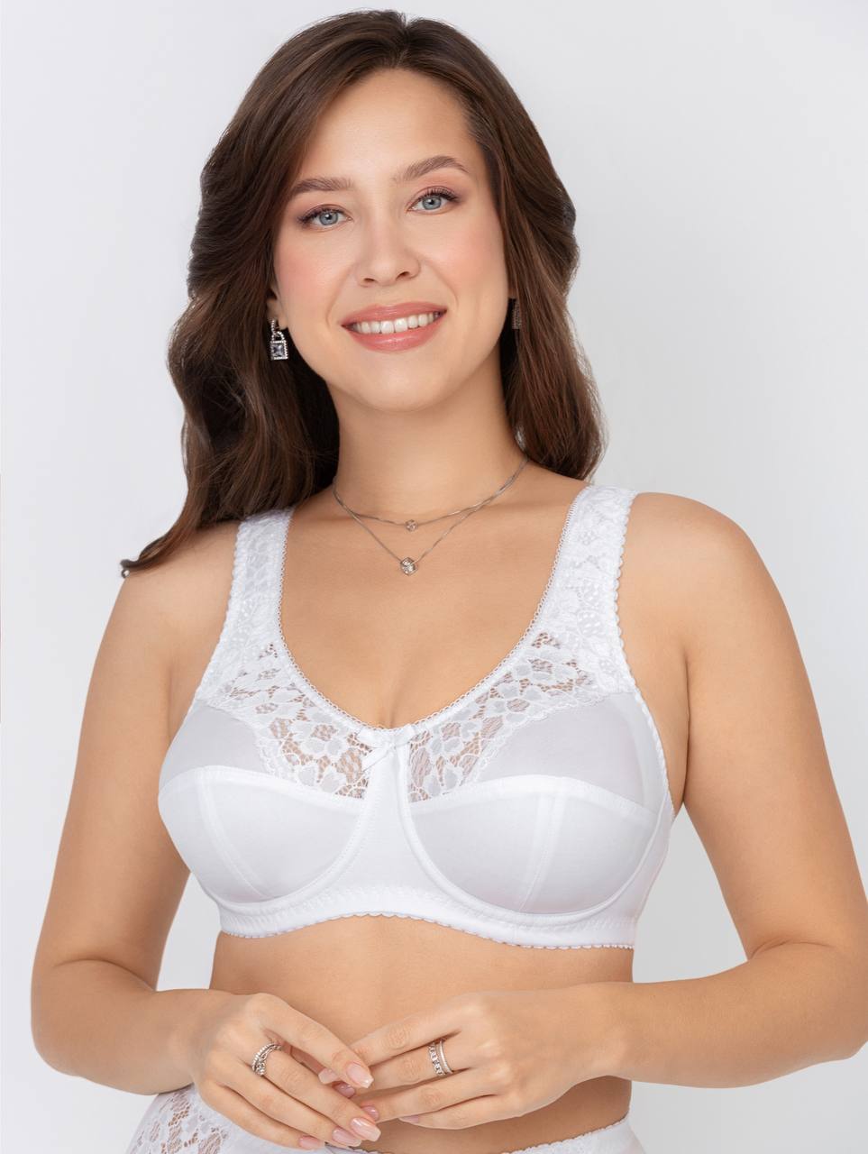 Отделка бюстгальтера включает эластичную тесьму с отделочным фестоном по краю и украшающий бантик, придавая модели изысканную деталь. Закрытая форма бюстгальтера маечного типа обеспечивает надежную фиксацию и поддержку груди. Нижние детали чашек выполнены на подкладке из хлопкового трикотажного полотна, что придает дополнительную нежность и естественность. Мягкая чашка и боковая корректирующая деталь, выполненные из поролона и переходящие в деликатные бретели, поддерживают грудь, создавая элегантную форму. Расширенные спереди бретели снижают нагрузку на плечи, принося дополнительный комфорт при носке данной модели, а чашка без каркасов обеспечивает естественное ощущение. Застежка выполнена в виде 3 рядов по 2-3 крючка в зависимости от размера, обеспечивая индивидуальную регулировку. Эта модель идеально подходит для тех, кто ценит элегантность и комфорт в нижем белье.